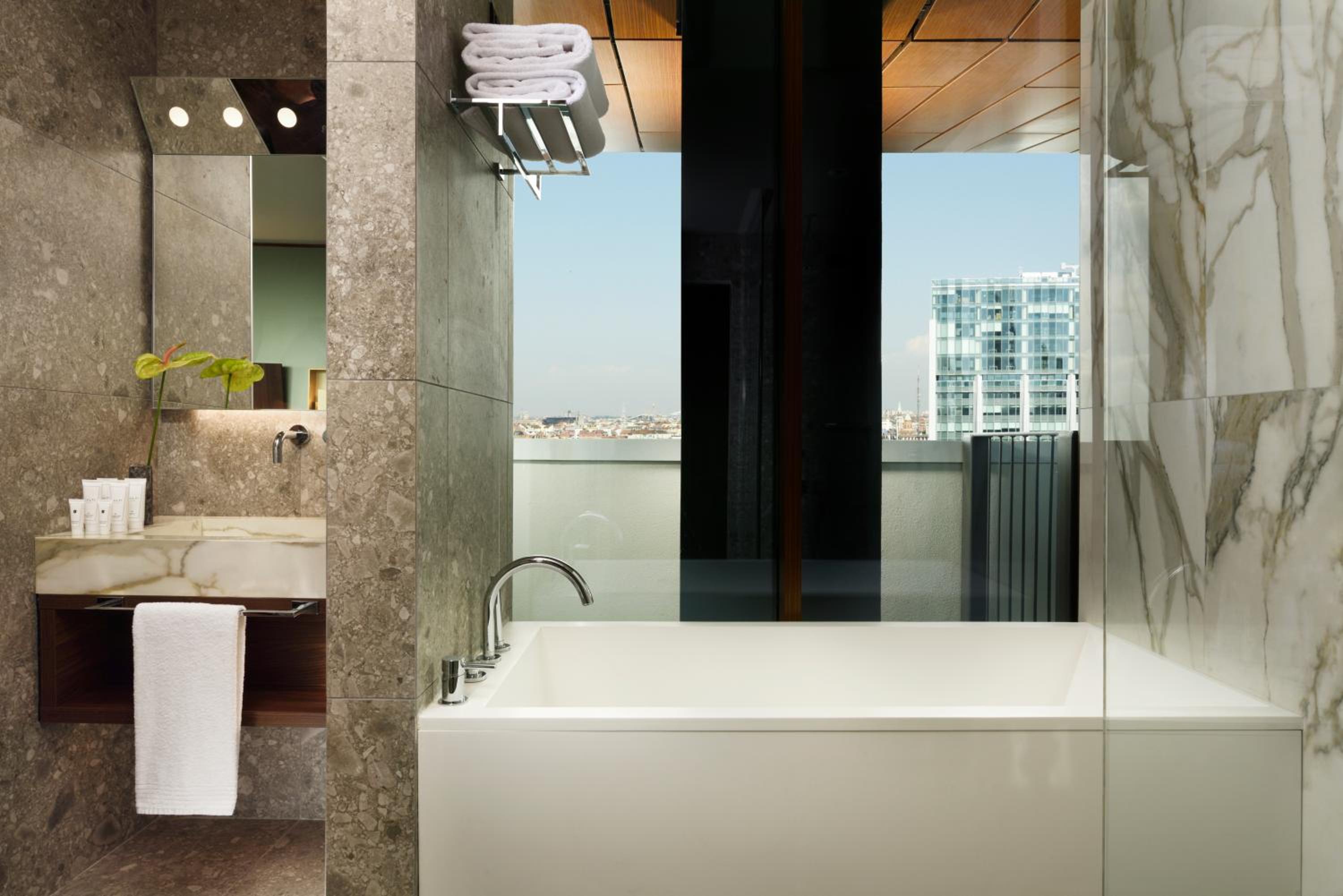 Milano Verticale | UNA Esperienze offers spacious rooms with modern amenities and stunning views. Enjoy satellite TV, air conditioning, and Wi-Fi, along with complimentary toiletries in the private bathroom. Upgrade to rooms on the top floors for panoramic views and exclusive perks.