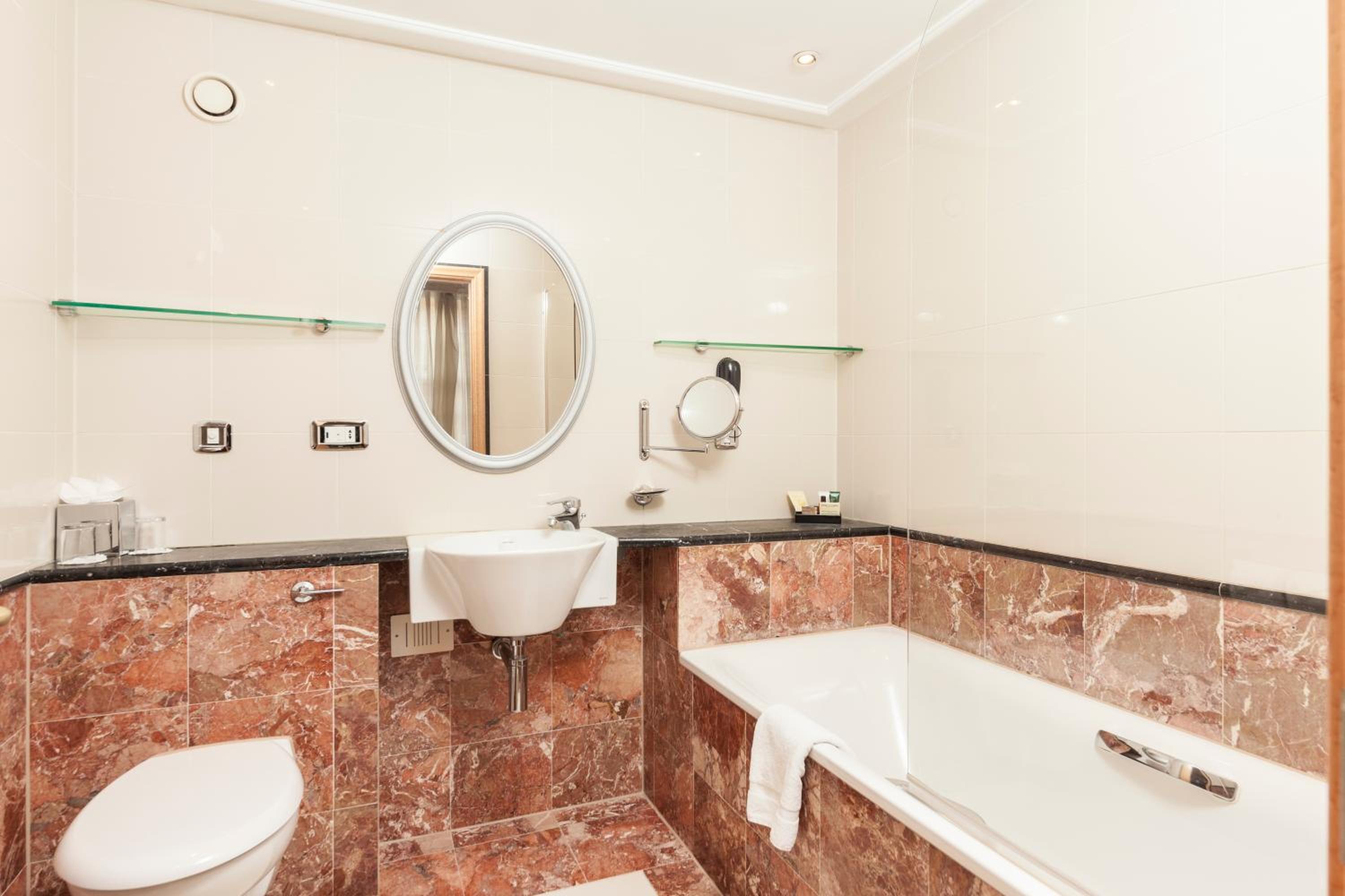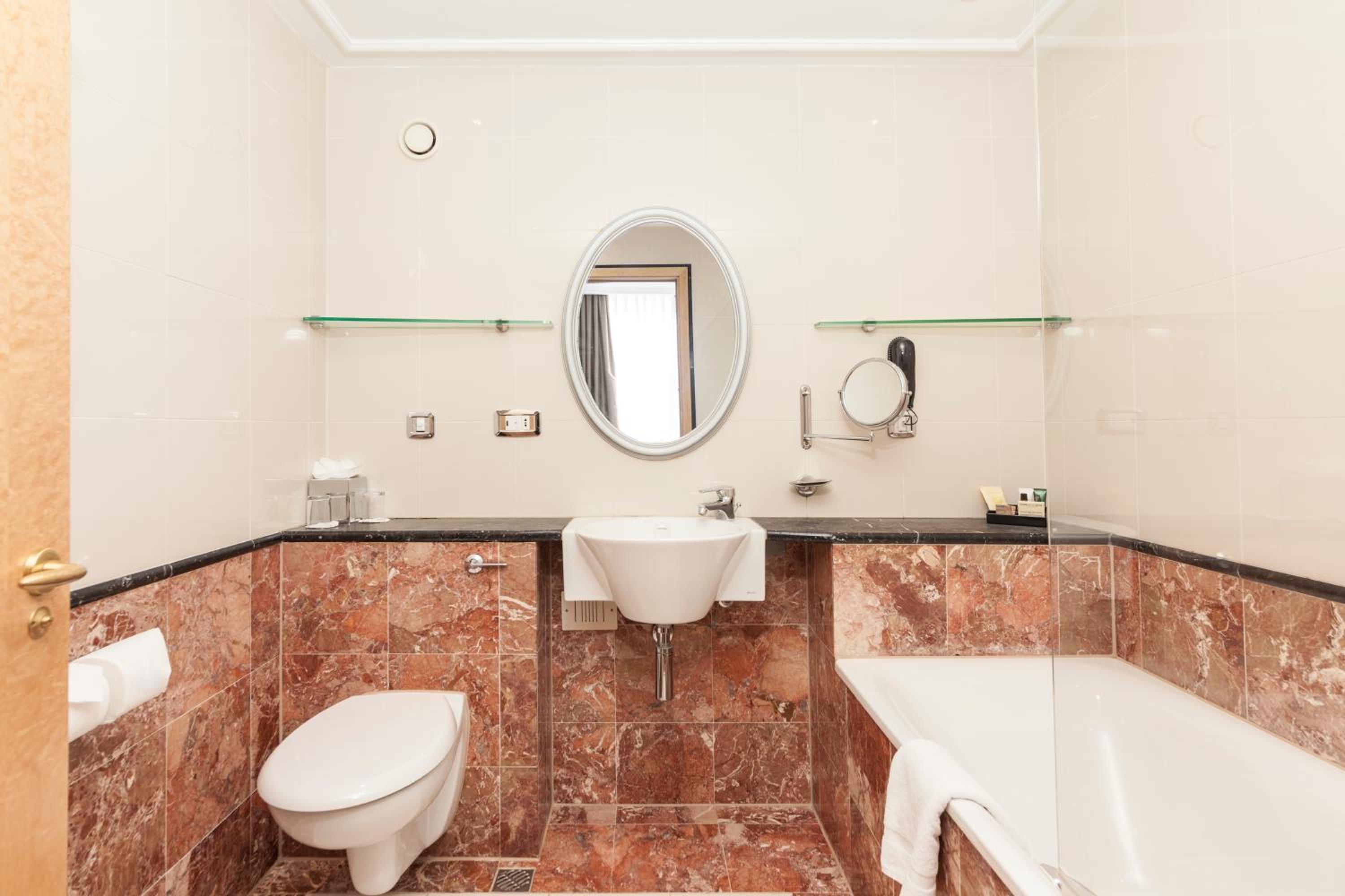 Stylish Rooms with Modern Amenities: Enjoy a stay in our luxury hotel rooms featuring entertainment systems, flat-screen TVs, and free WiFi. The Italian-designed bathrooms with picture windows add a touch of elegance.