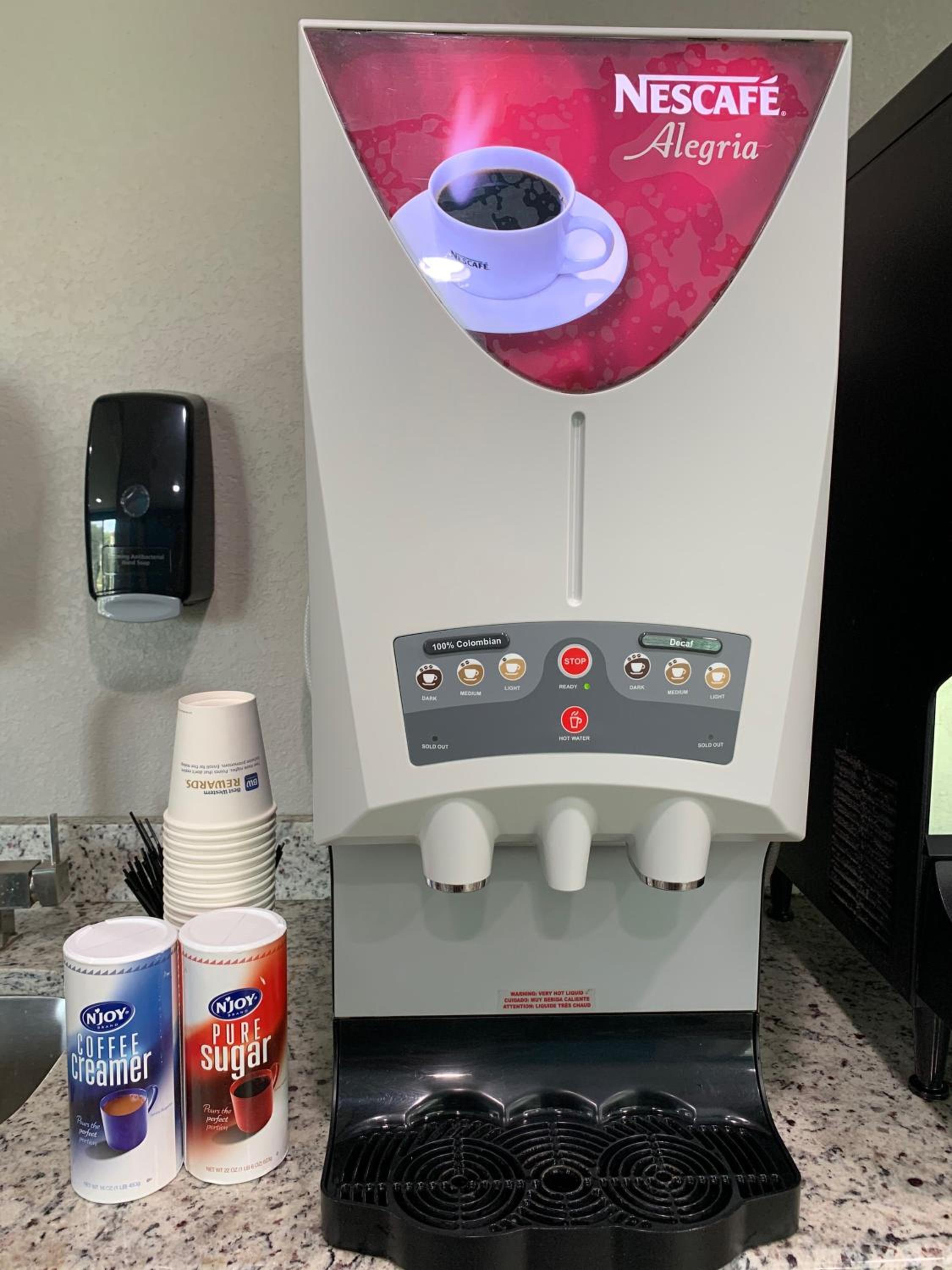 No breakfast, they give you a brown bag with a go-gurt, granola bar and an orange or apple. The juice machine does not work or when it does it is not filled correctly. Coffee is a coffee machine that was just water as they do not keep up on adding the instant mix. Floor boards especially in the bathroom are brown or black where they are sealed by tub. Curtains do not look like they have been washed and honestly look like someone puked on them. Fridge was not wiped out and was dirty. Pool was not secured and gate latch did not work. We were there due to father passing away, so we were not looking for a “vacation” spot. Just somewhere with beds but it was not enjoyable as it would have been nice to come back to a room or hotel that was clean and comfortable. We will be going somewhere else when we come back next month.