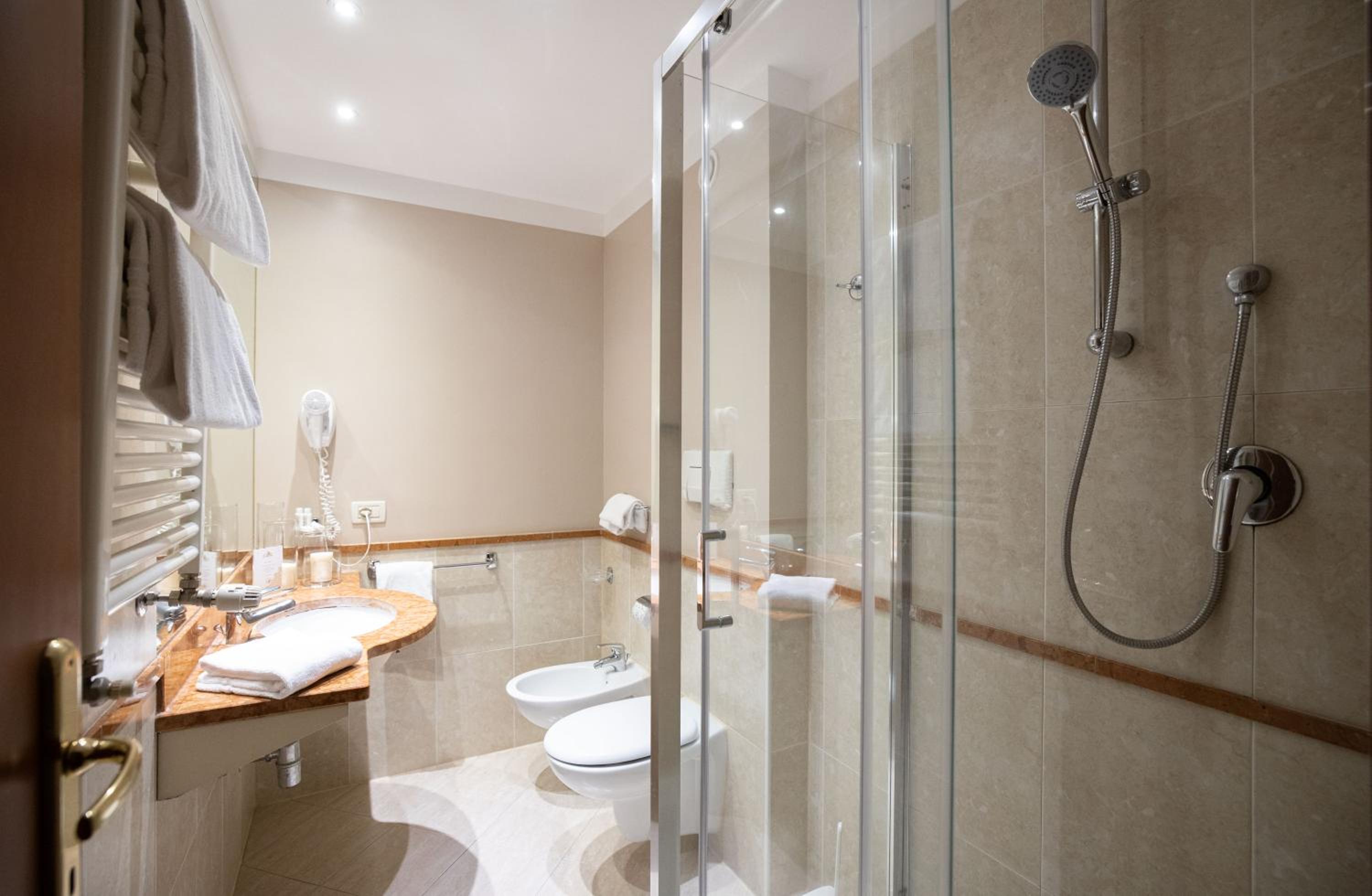La Camera, che mi è stata venduta come superior, è stata una delusione. Piccola con il bagno cieco e presenza di alone al soffitto con qualche piccolo distaccamento e la porta che, quasi sicuramente, per via dell'umidità delle docce si è gonfiata e la maniglia rotta.