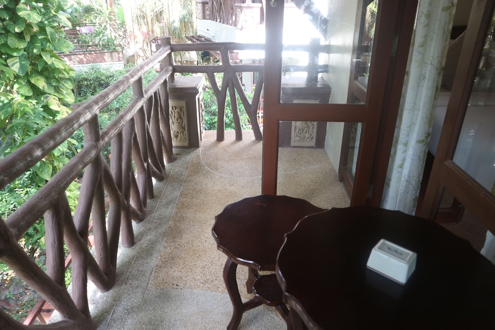 + mysigt hotell med snirkliga trappor till rummens våningar och med lummiga buskar i hotellets trädgård