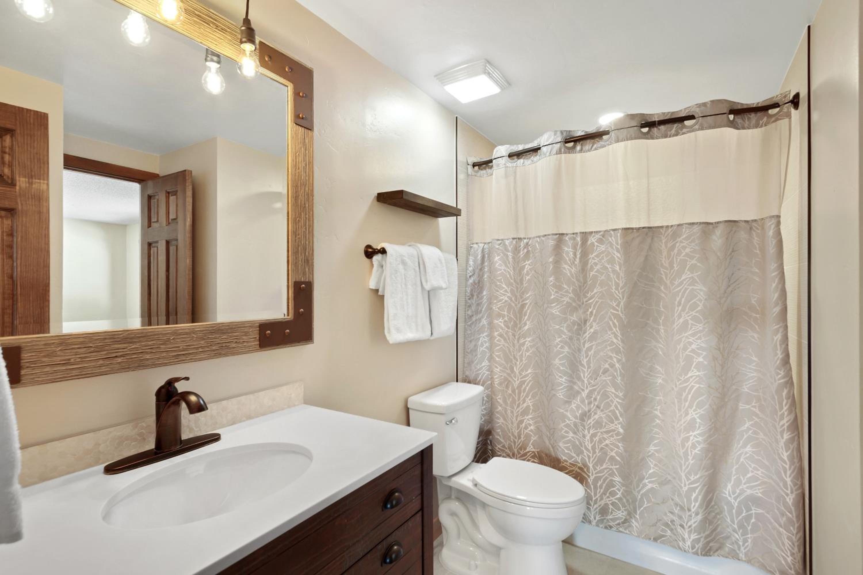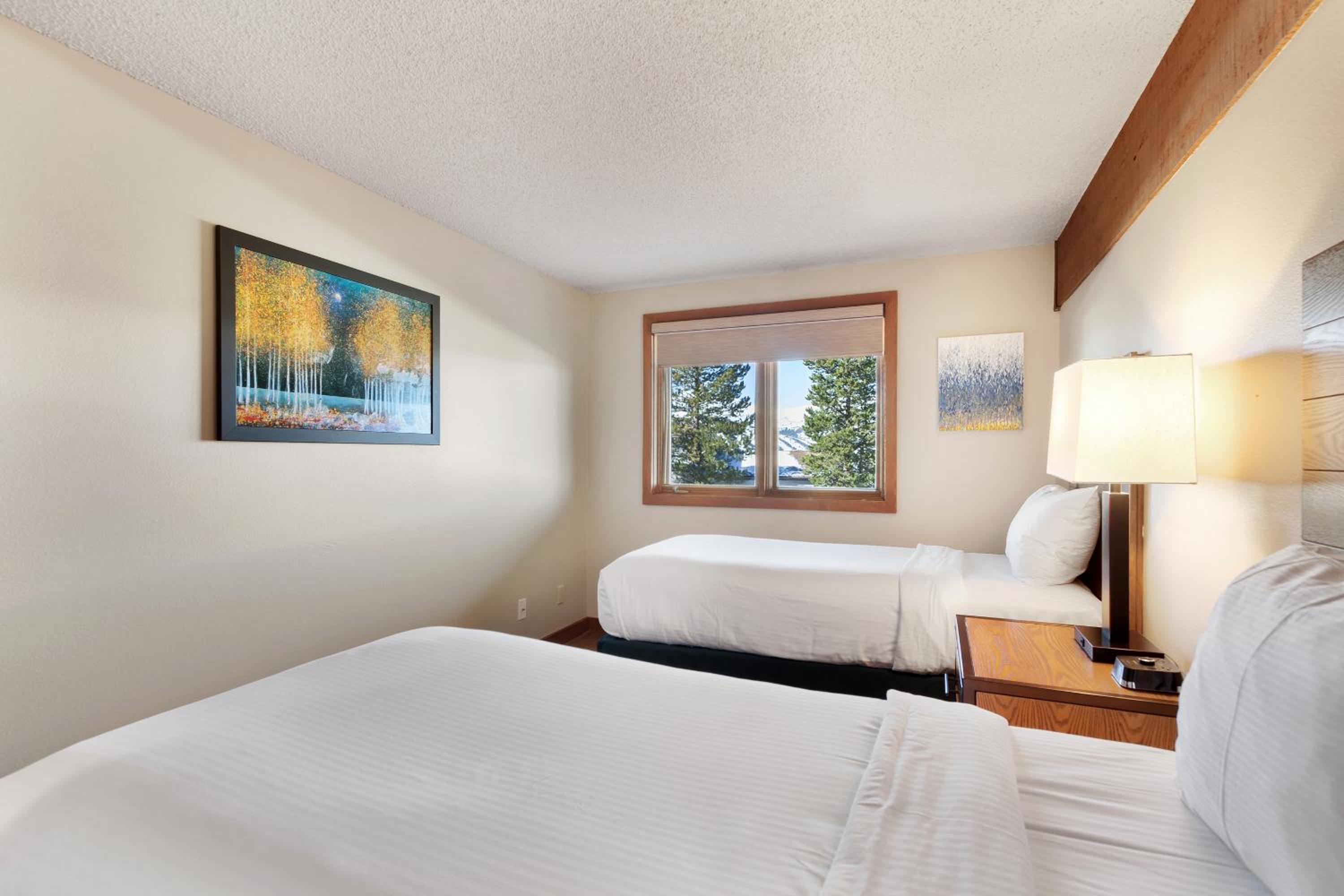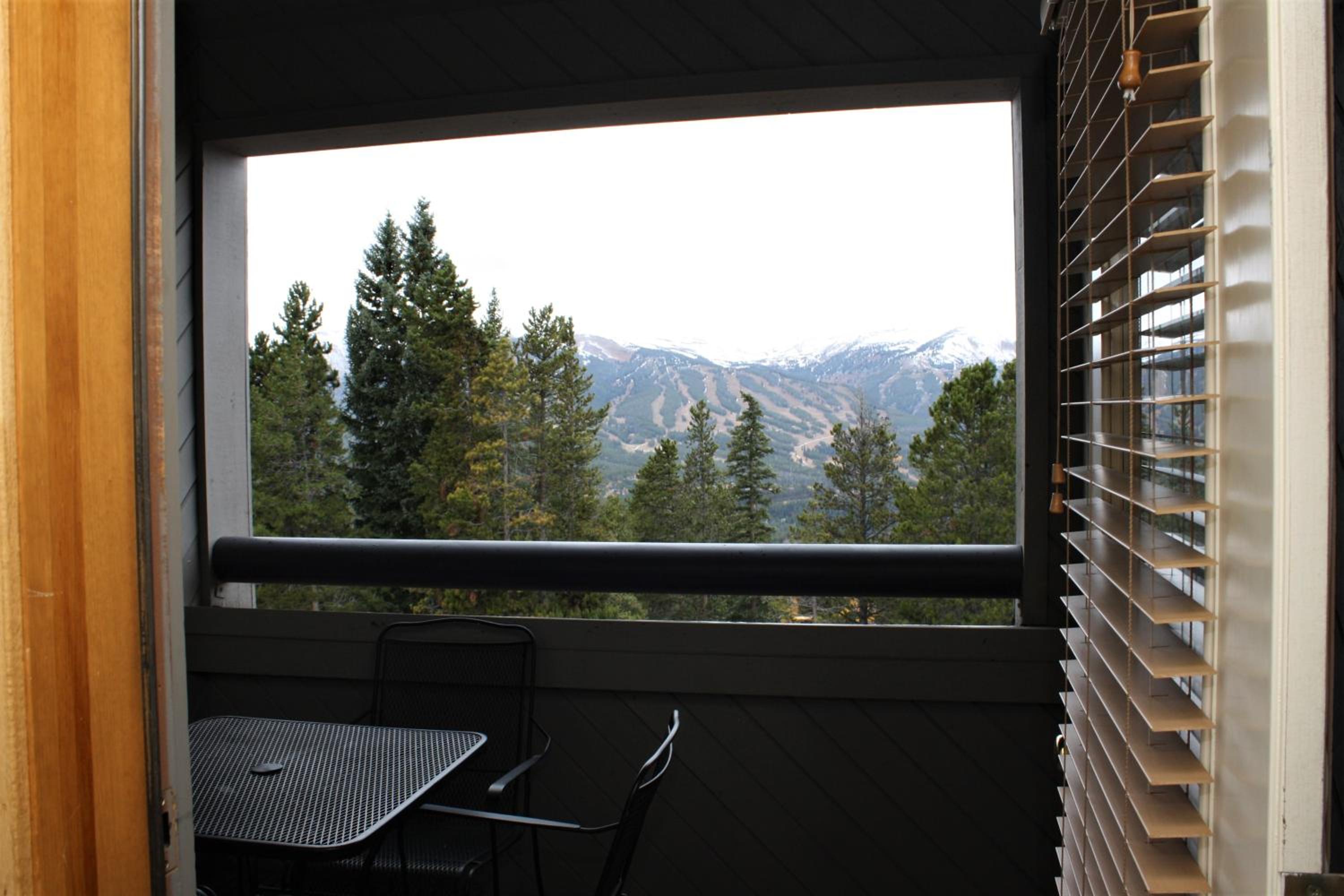 The condo had a nice mountain vieq from the terrace deck. Mostly a quiet resort, accomodated by a single garage, accessing the condo easily. The kitchen rooms had the essentials, slow cooker, toaster, and dinnerware settings for 4 people. The coffee maker could use an upgrade, it wasn't great when dispensing the coffee. The bedrooms and living areas were comfortable, bathroom and showers were fine. We saved money preparing our own meals most of the time there. Breckenridge is expensive to eat out all the time, so buying groceries was a necessity. We'd recommend this resort for sure.