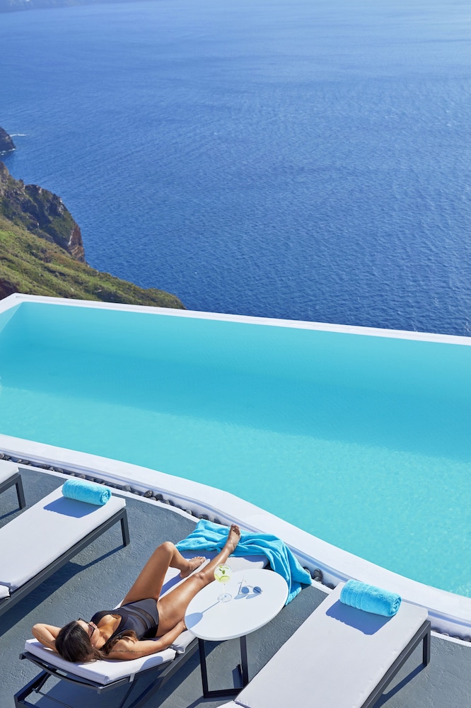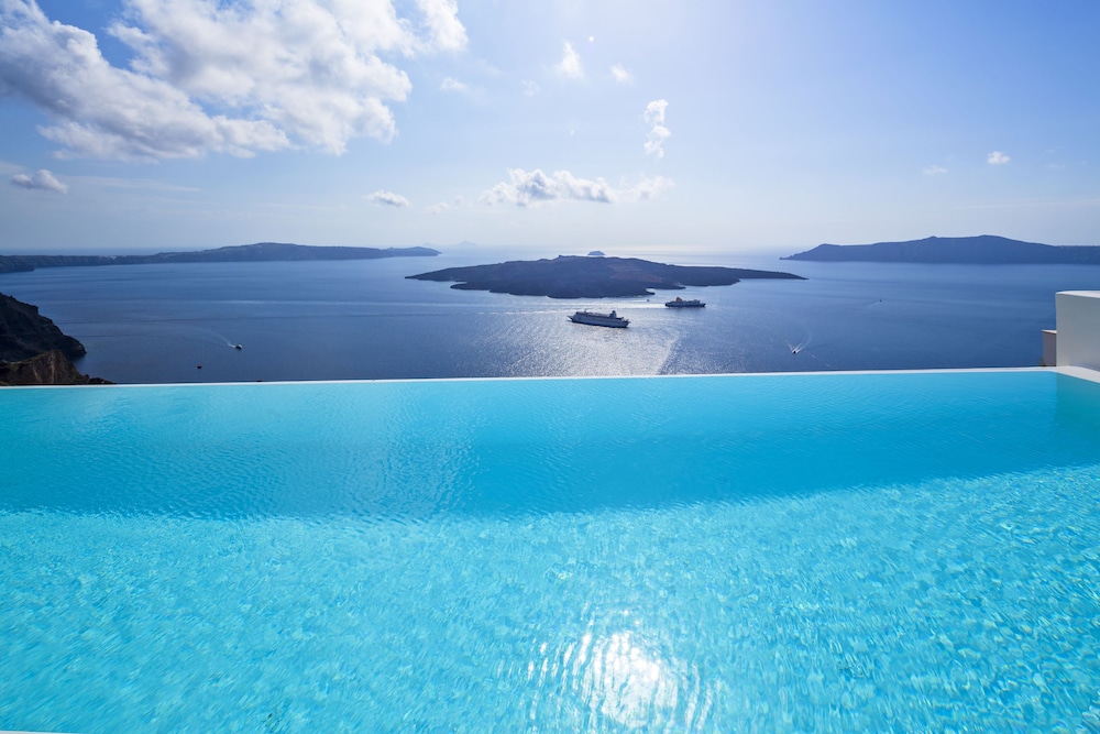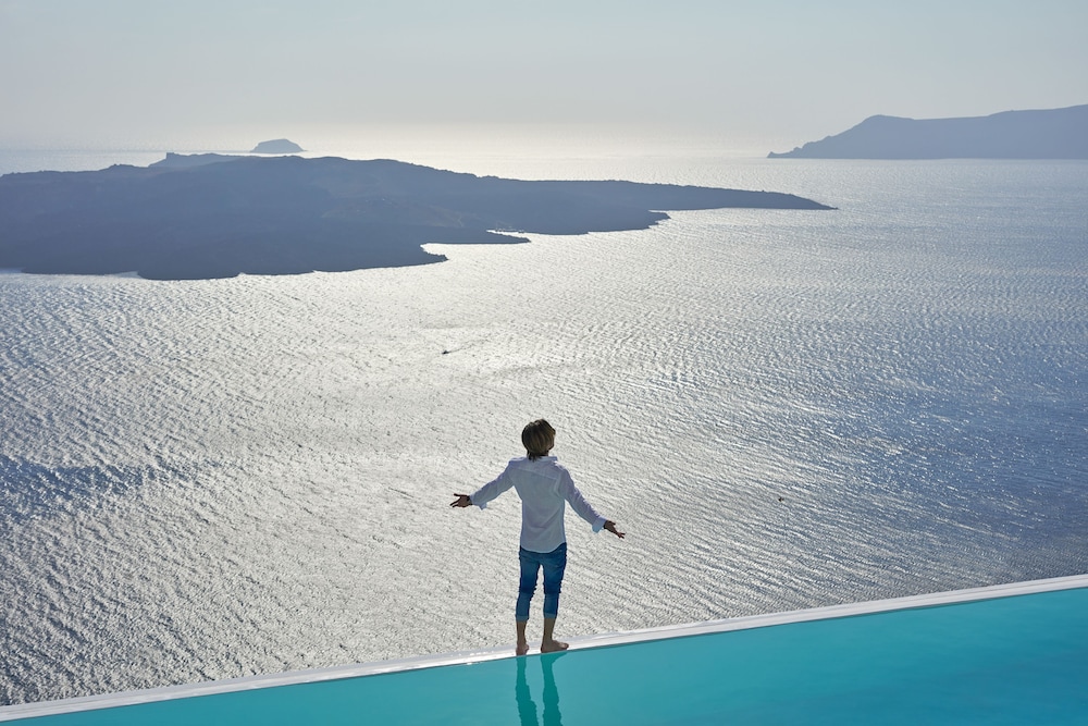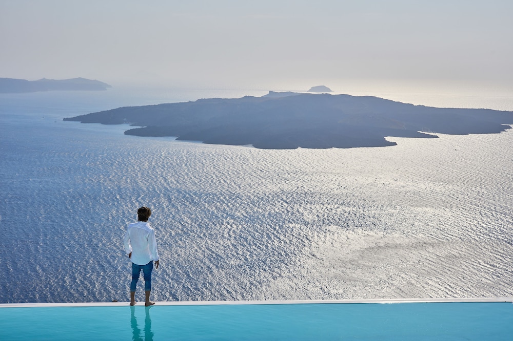 One of the best better experiences we’ve had in traveling too many places in the world. This is a boutique hotel with beautiful decor incredible/1st class service and a view that is purely breathtaking. The room we had was a little small for my tall family with a few bumps on the head, but overall worked well and was extremely comfortable for sleep. The patio and infinity pool were spectacular. Drinks breakfast, and more by the pool with the view of the Caldera was the highlight. We grew very close with the staff as they went above and beyond for everyone of our needs. This hotel is in gross proximity to walking to all the shops and restaurants and was a short bus ride to Oia where we spent an afternoon. Was skeptical about Santorini but really walked away grateful for views food and more. All transportation dinner reservations and activities were arranged by The Cosmopolitan. Excellent experience.