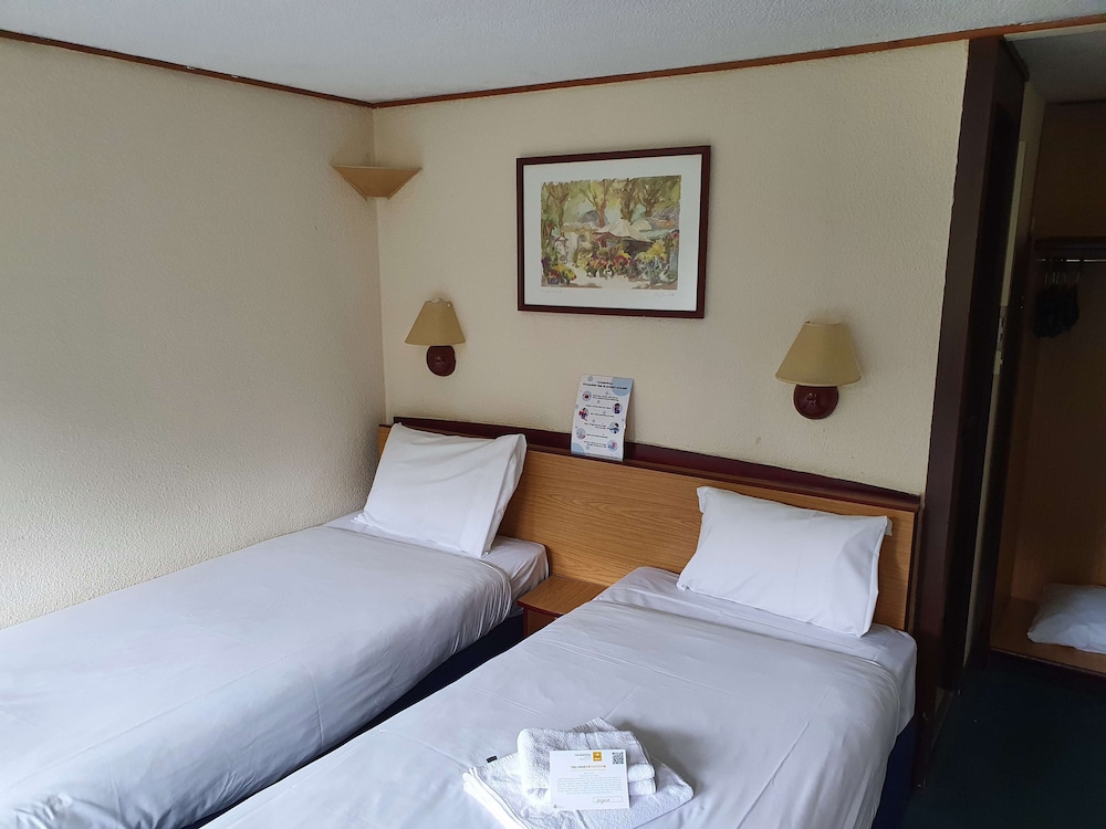 good price but although I had paid already via expedia had to to still use a credit card for pre authorisation, then details of the car and other forms and forms to verify who i was to avoid the car parking charges, The room was clean but due to covid did not have china cups. This was previously a campanille hotel, I researched and this company is now a part of a chinese group. The room I felt looked a bit dated and needs fresh ning up but clean. The first night I heard people arguing and fighting, I looked outside I could see nothing, when i enquired the next advised it was from Mcdonalds. The second night ok, What is good is it is near a bus stop. When Ichecked out i was not asked for my credit card which after contacting expeia advised it would be reversed, this took some time