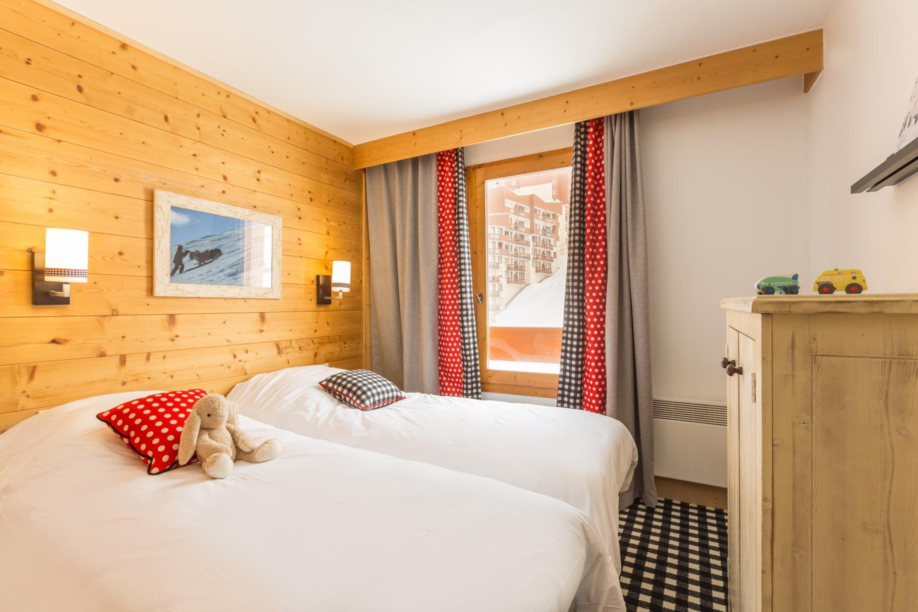 This upscale residence offers ski-to-door access and self-catering apartments for up to 9 people at the base of Les Menuires ski resort.