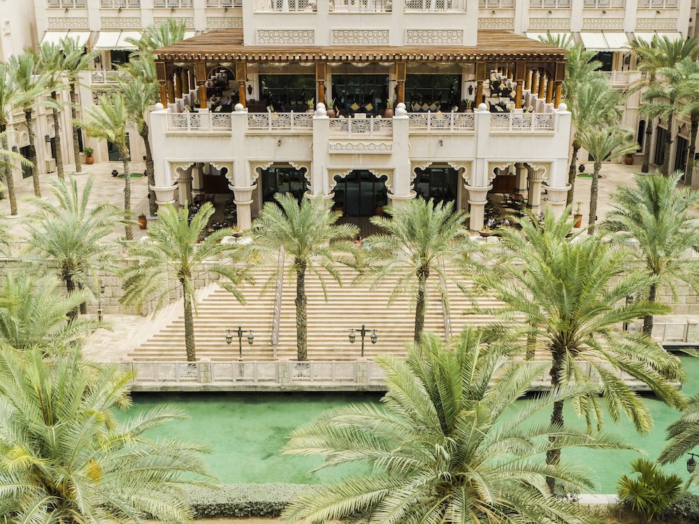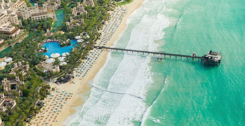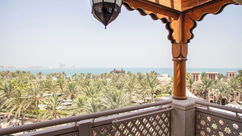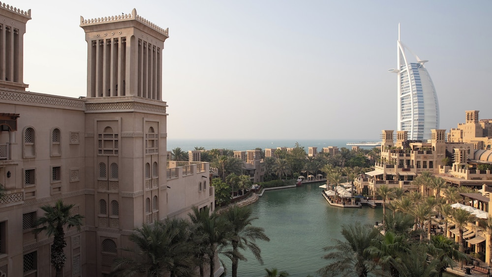the resort is exceptional , with lots of unique features , looks like the traditional Arabian palace in the desert oasis with the peacocks walking on the property . The view of Bur al Arab is spectacular . Rooms are spacious with the comfortable beds . It really feels peaceful walking on the property .