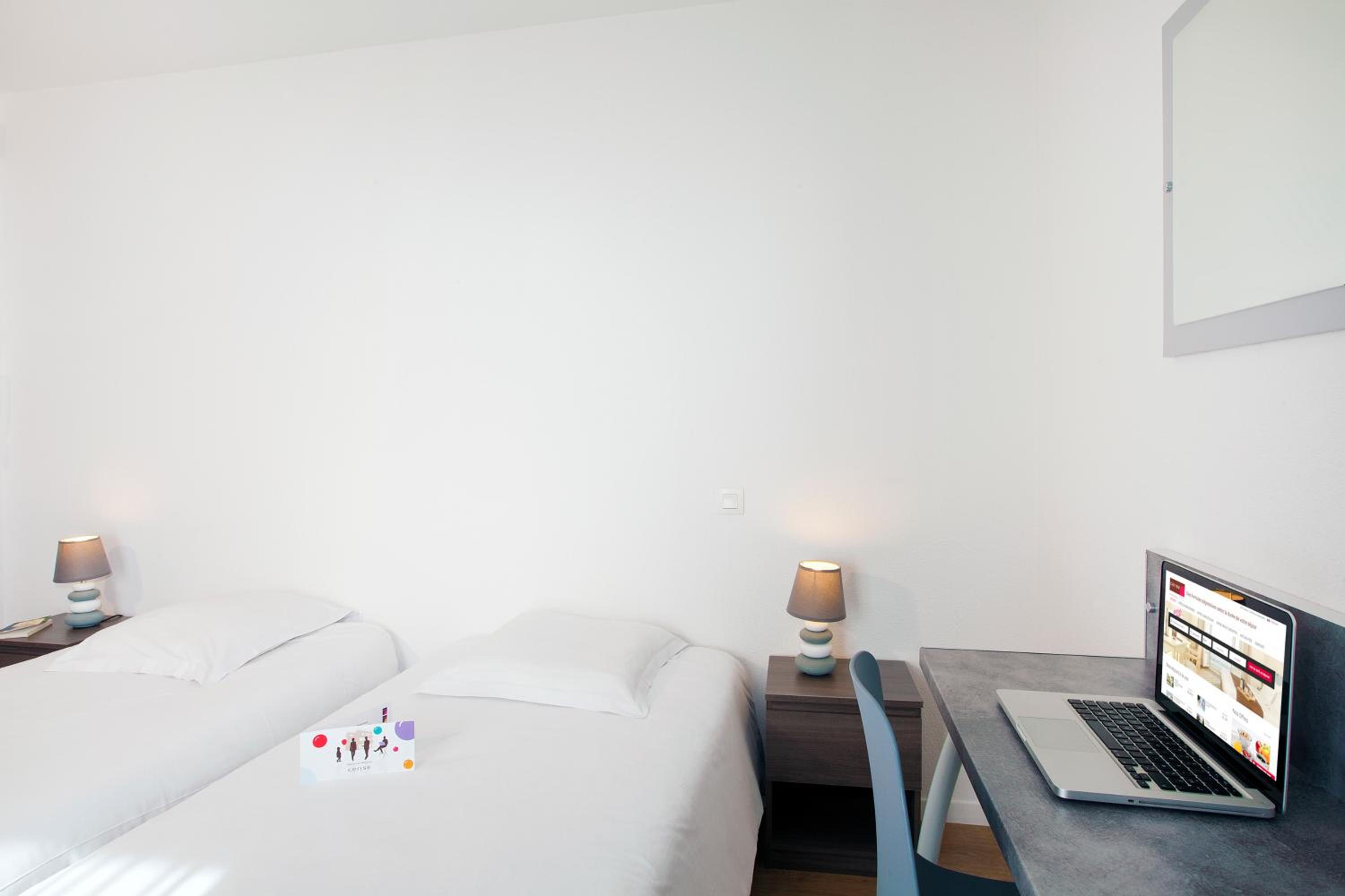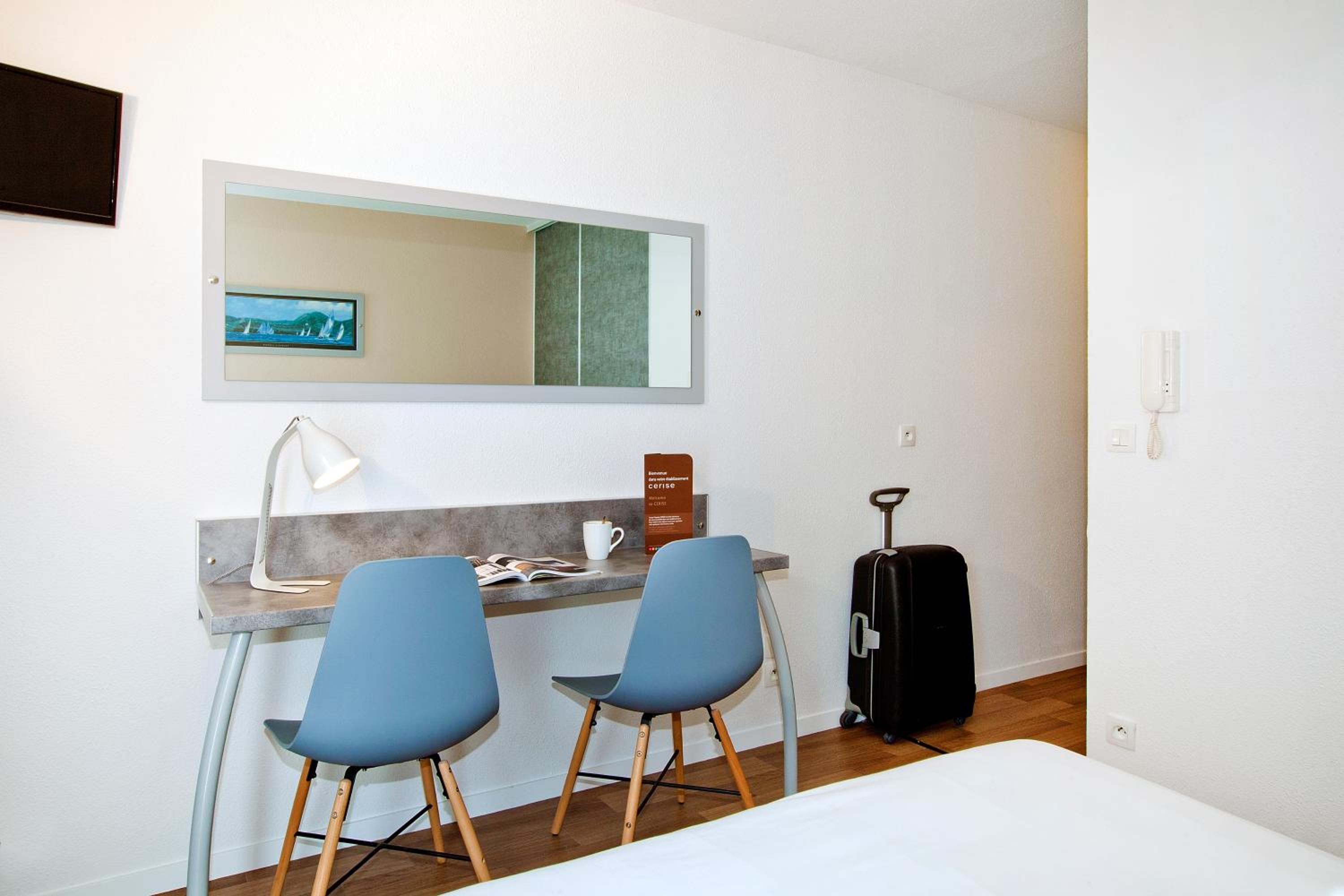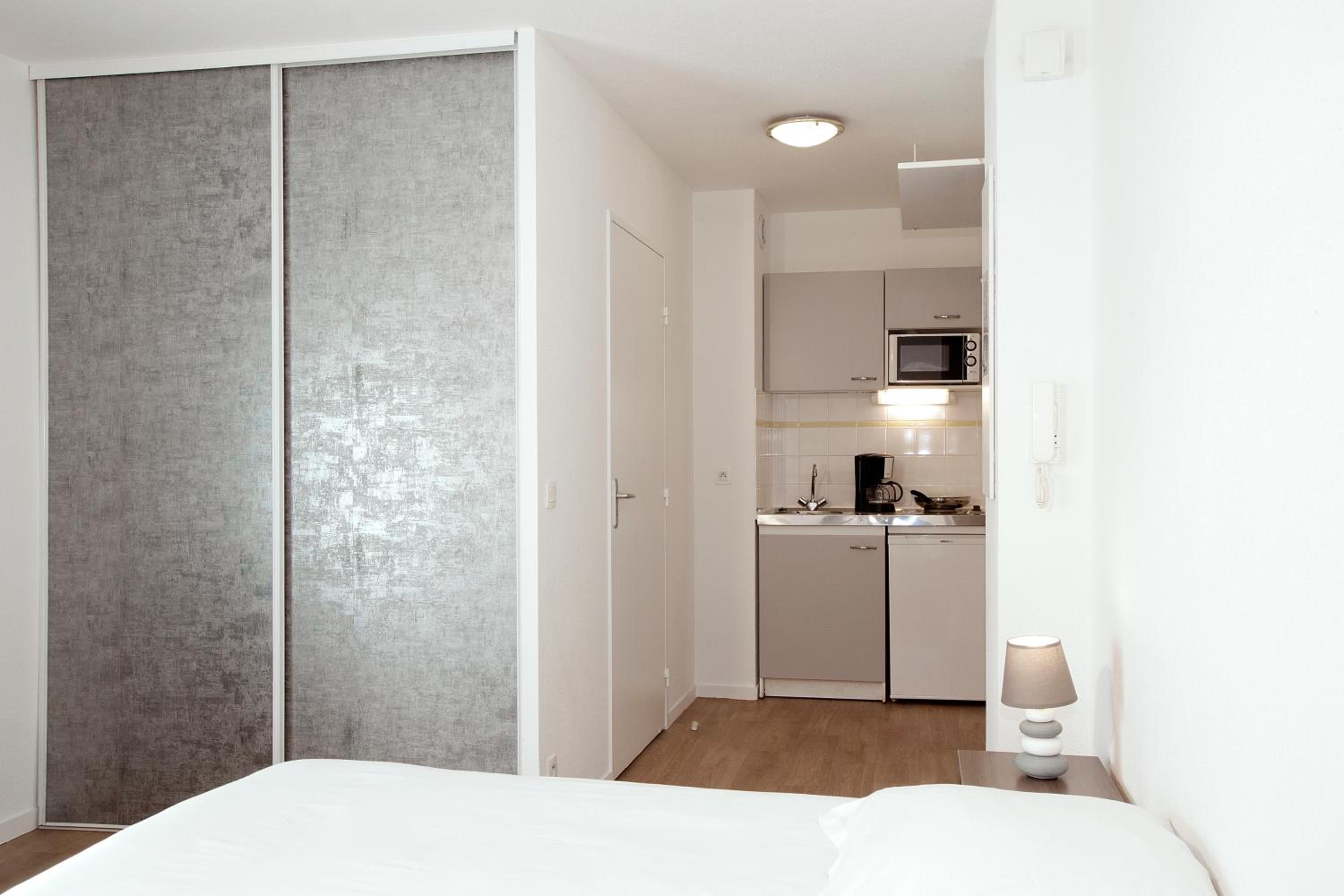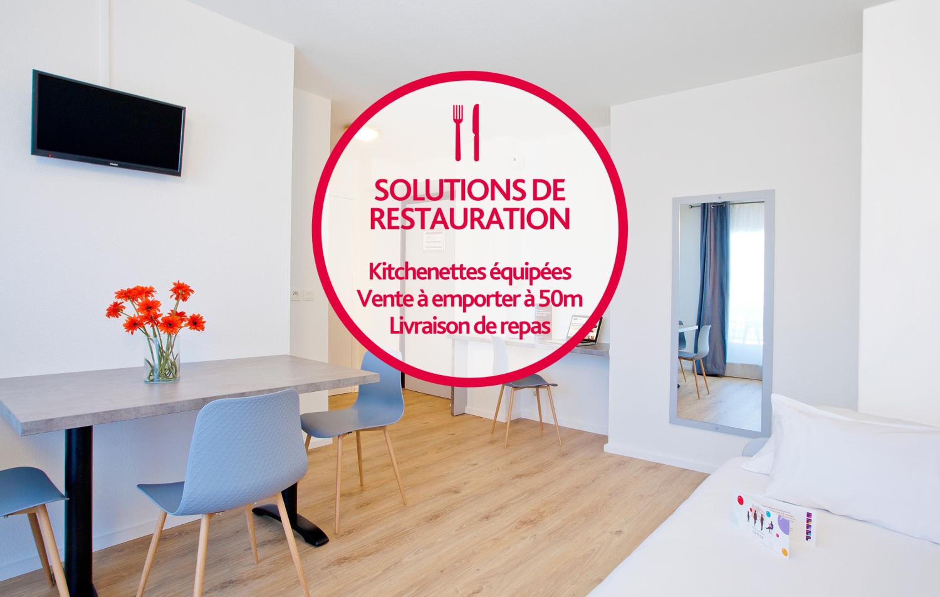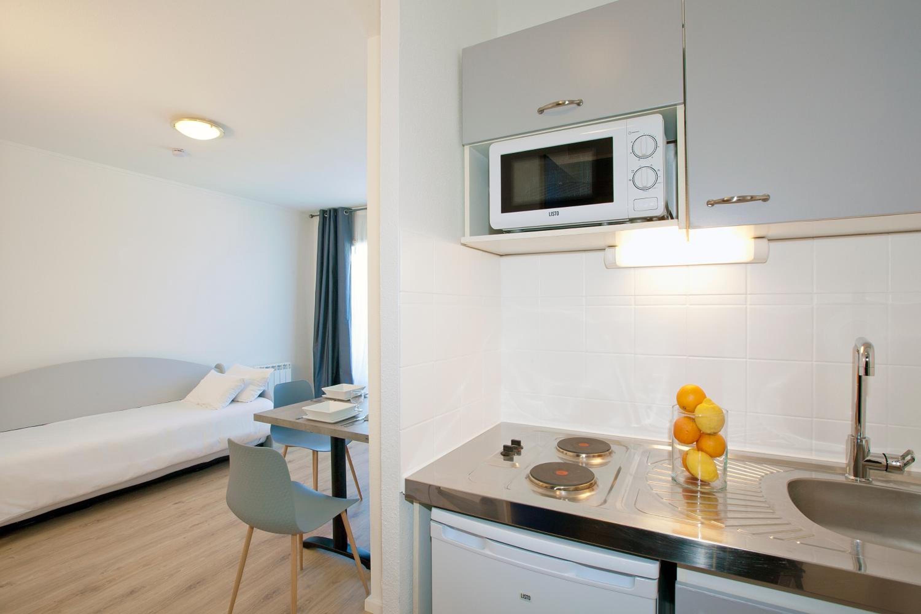 Each apartment at Cerise Lannion features a kitchenette with essential appliances, a cozy dining area, and modern amenities for a comfortable stay.