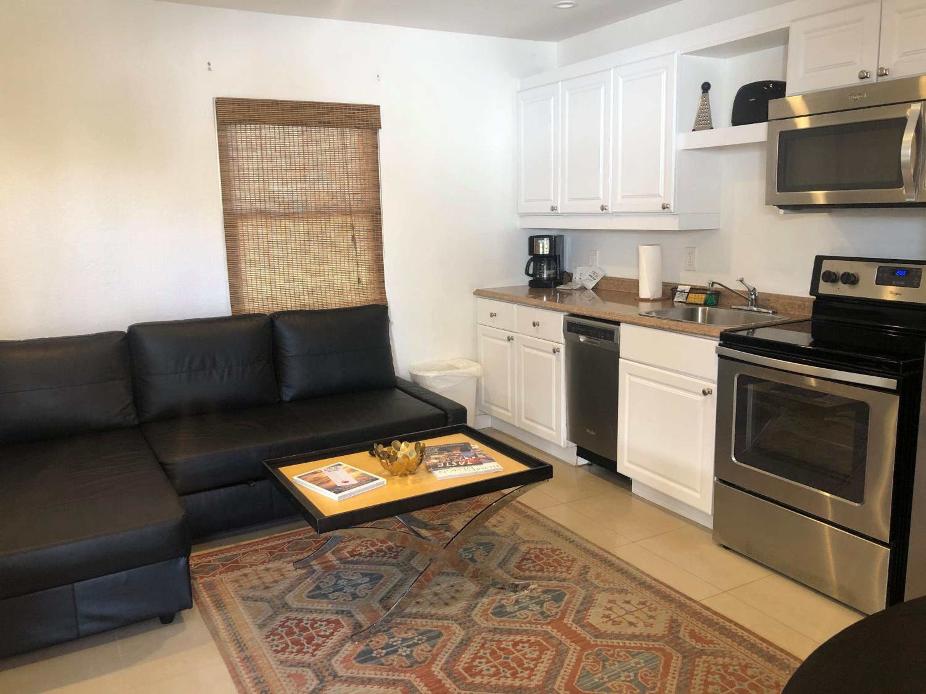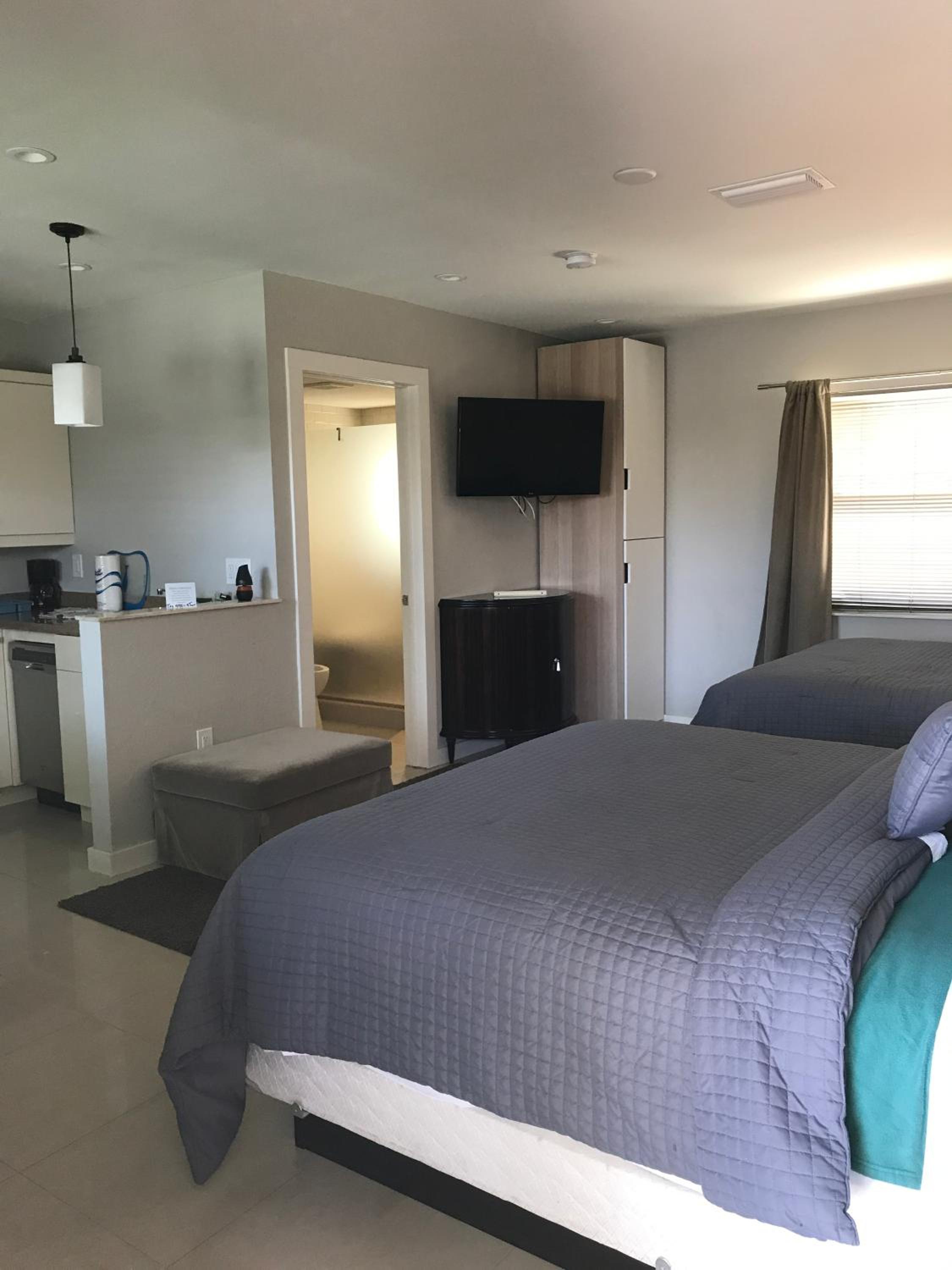 The room was clean, no weird odors. The AC worked a little too good. There were dishes and cookware provided in the room with the full kitchen.