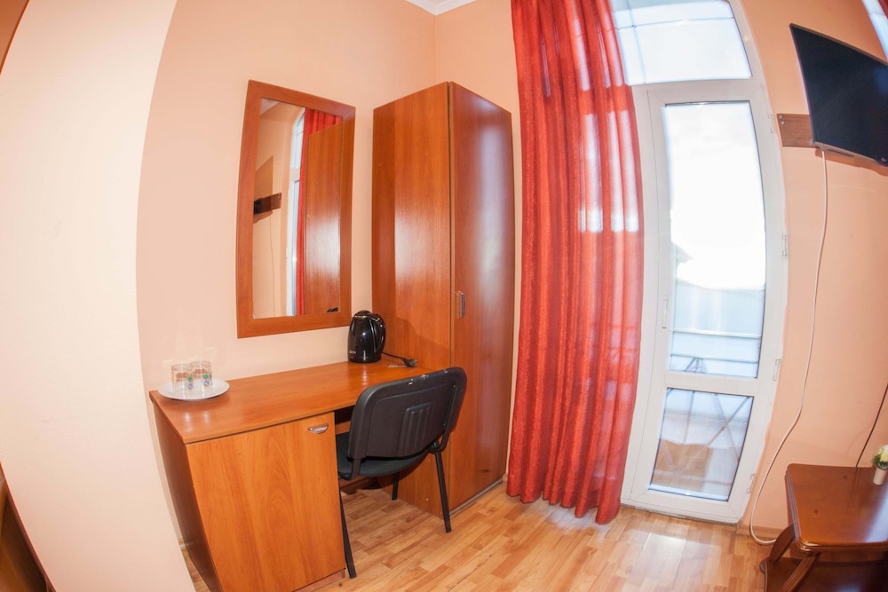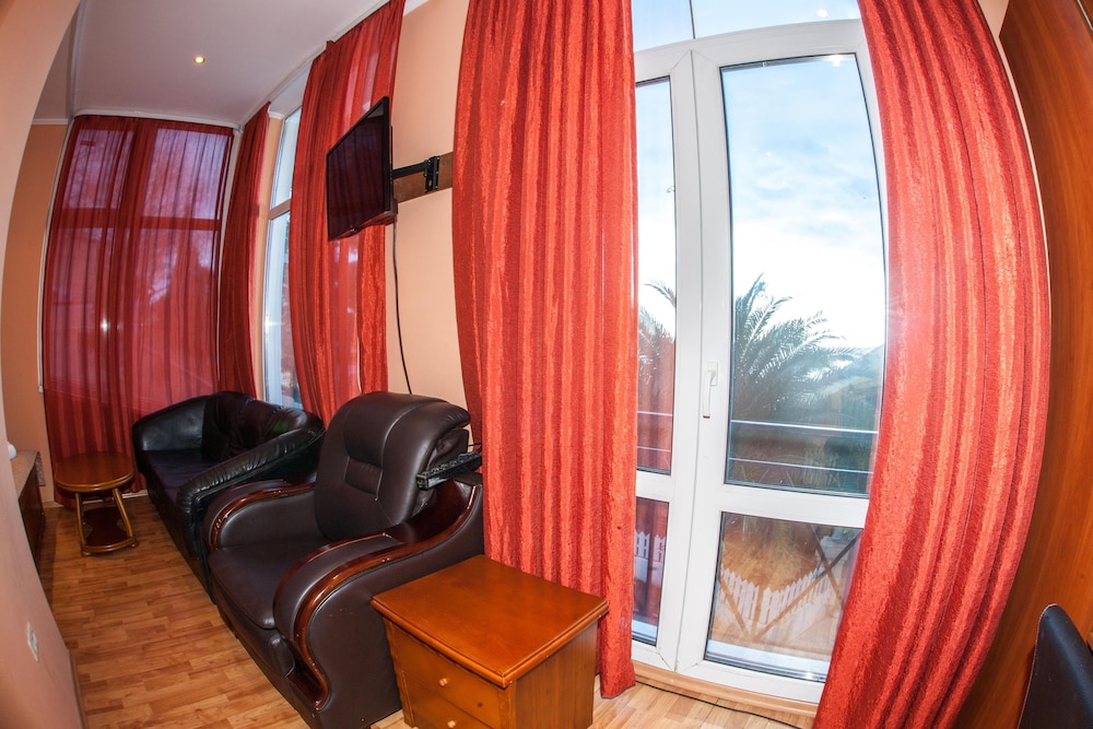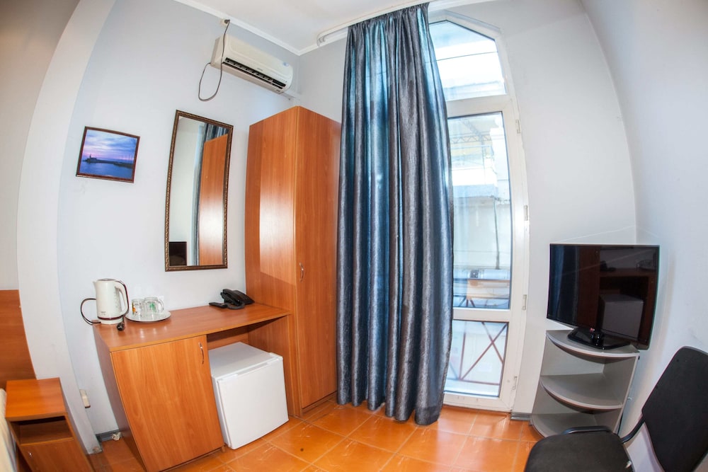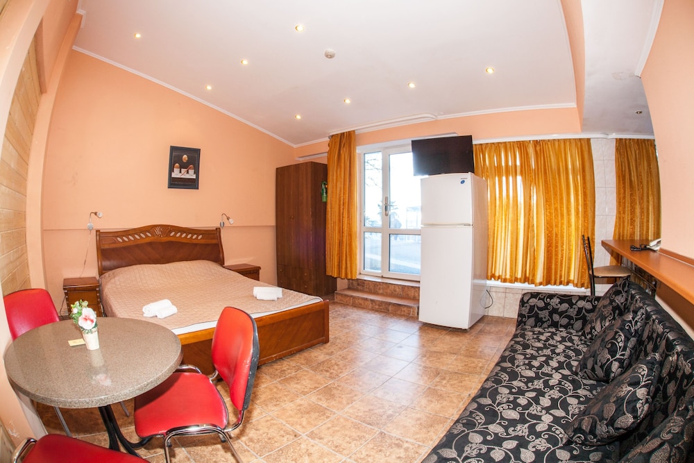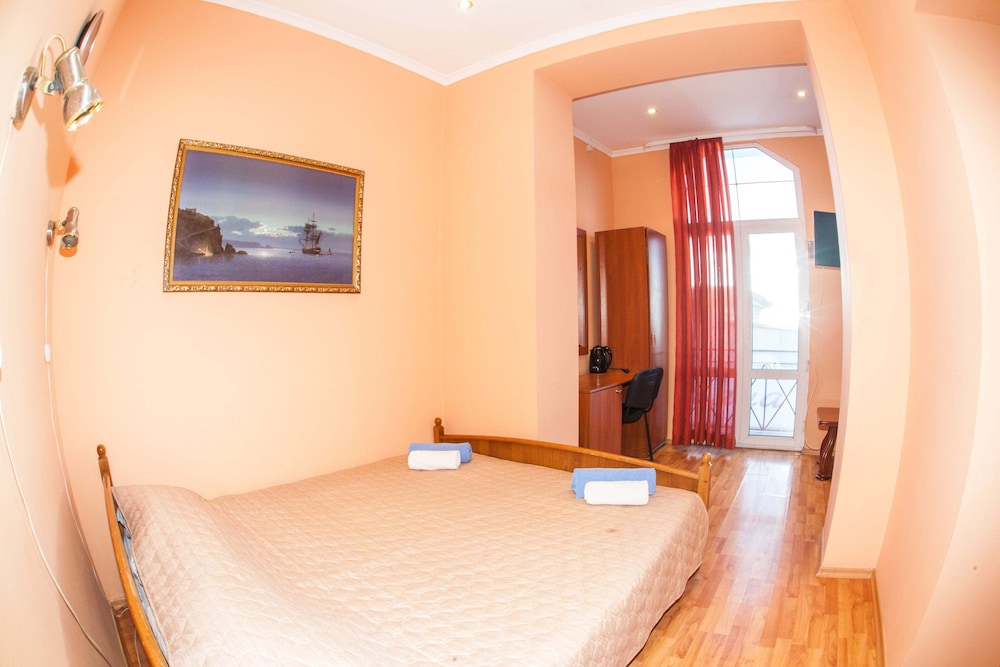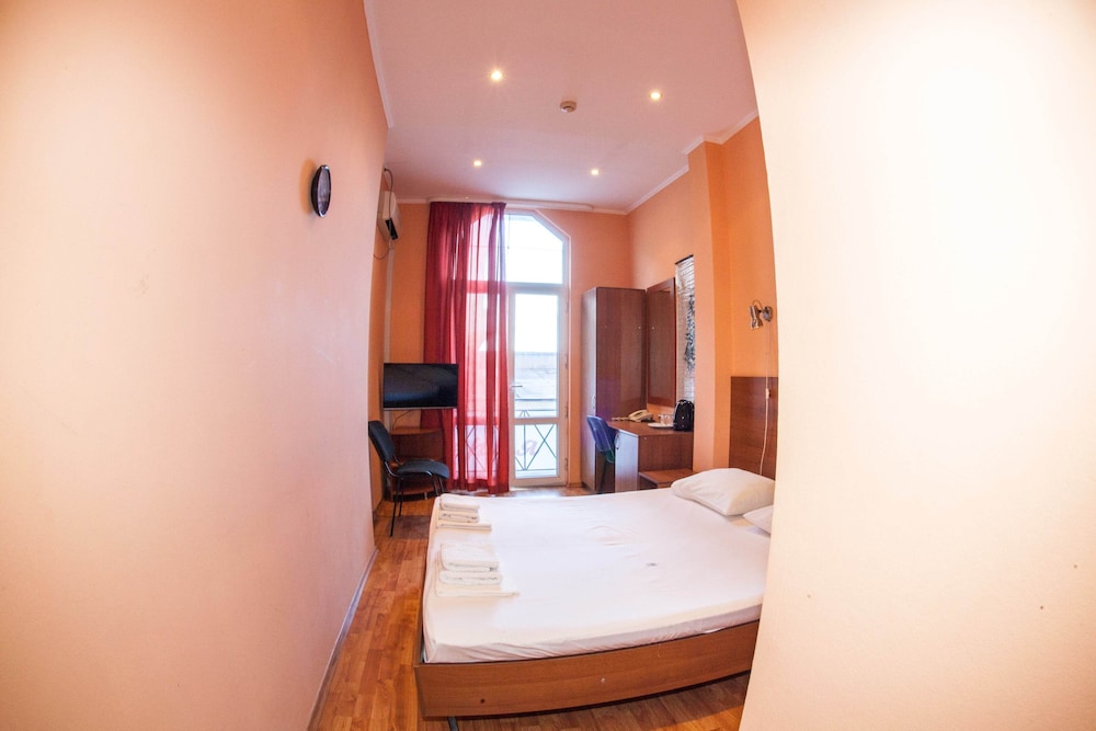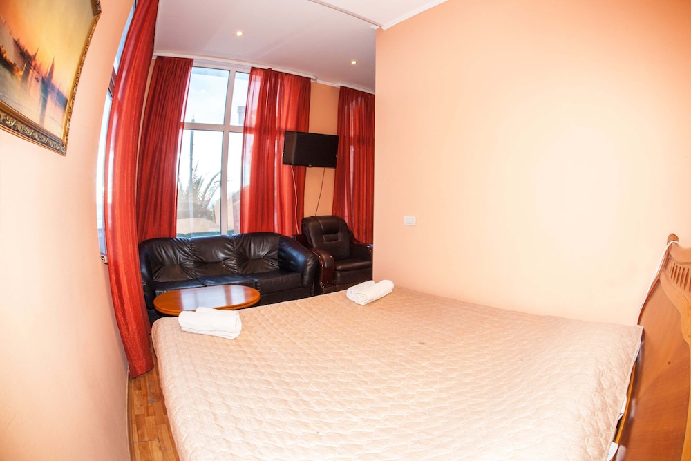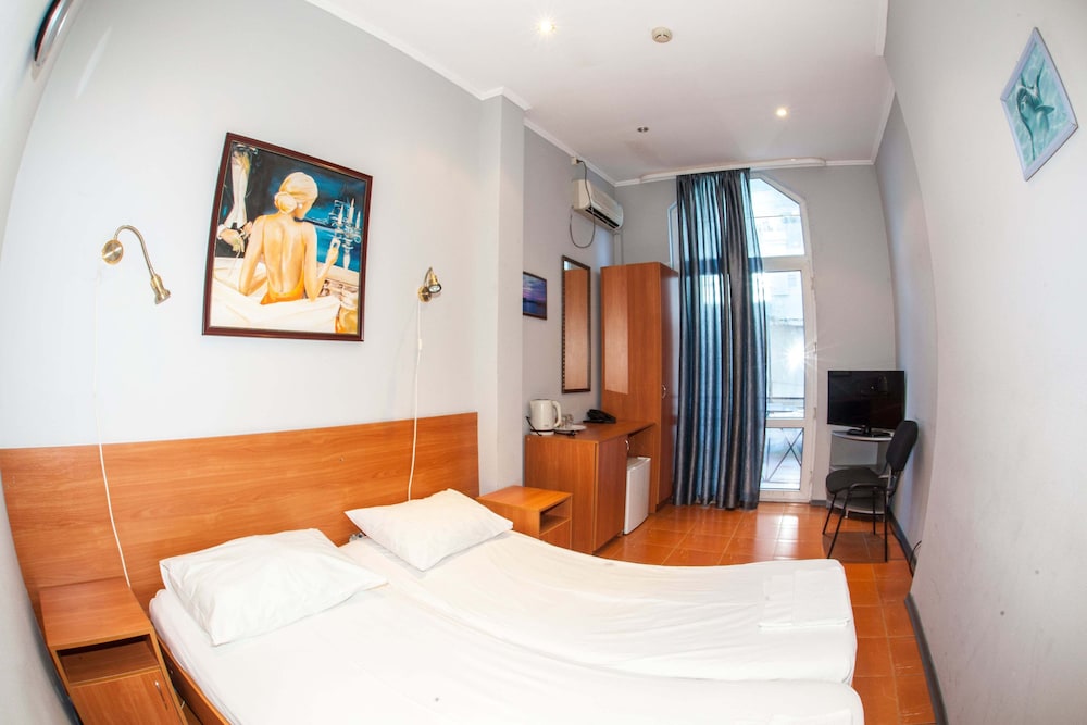Бюджетный отель в 50 метрах от Черного моря. В отеле два этажа, на первом этаже двери на улицу, на втором этаже - в коридор. Номера небольшие, но внутри есть все: холодильник, обогреватель, чайник, плоский телевизор, кое-какая мебель. Есть душевая кабина и водонагреватель. Все, конечно, далеко не новое, но работает исправно. Если заказали завтрак - то он в небольшом кафе наверху, в целом, готовят вполне, но рекомендую заказывать кашу, так как яйца жарят в каком-то масле, получается очень жирно. Еще выдают только несколько пакетиков шампуня и жидкого мыла при заселении, потом надо просить. Так что советую взять с собой сюда кусочек мыла для рук/тела и шампунь. Персонал очень приветливый и дружелюбный, во всем помогут. Также они продают экскурсии, советую. И еще. По вечерам громкая музыка из кафе, если вы не можете под нее уснуть, лучше выберите другое место. Я, правда, легко и быстро засыпал, так как много ходил. Кстати, до вокзала всего полчаса пешком.