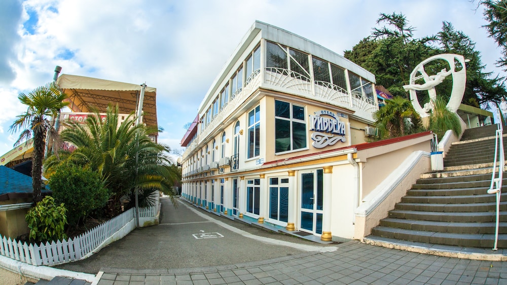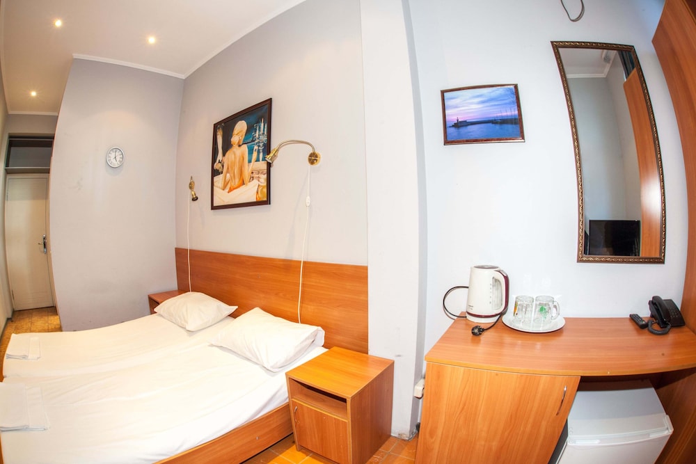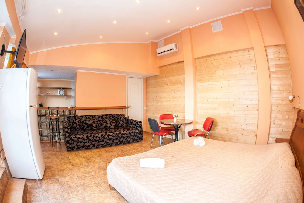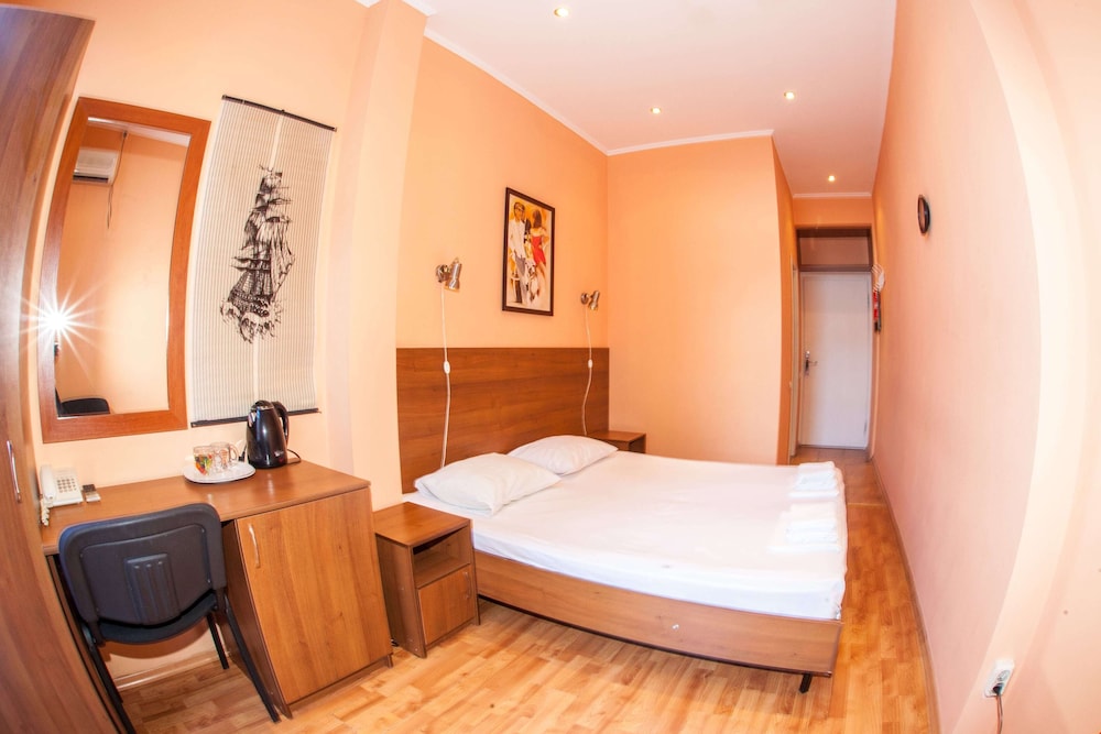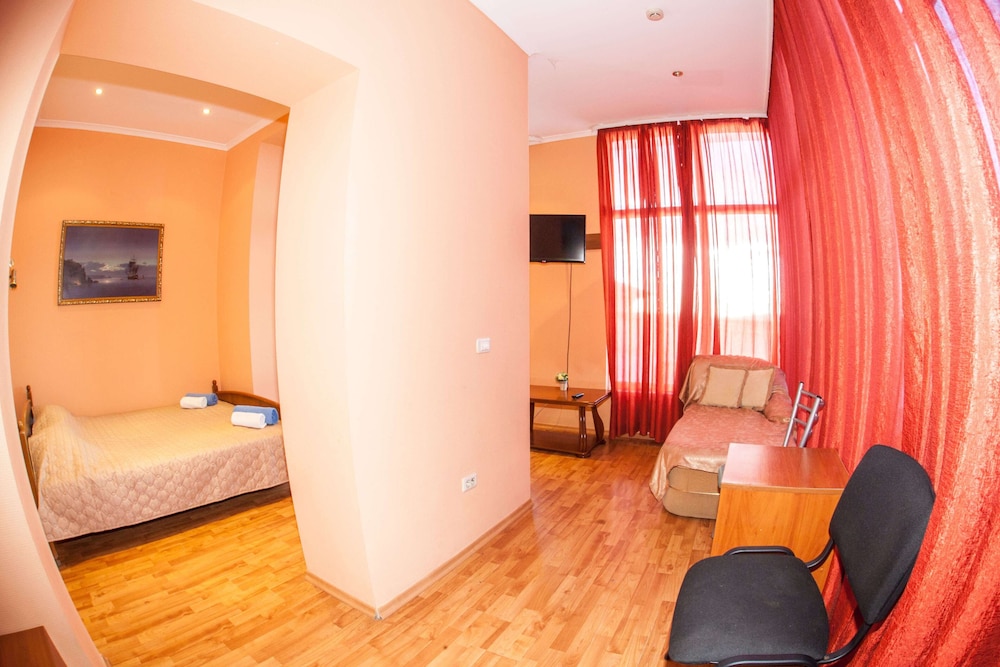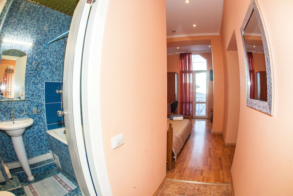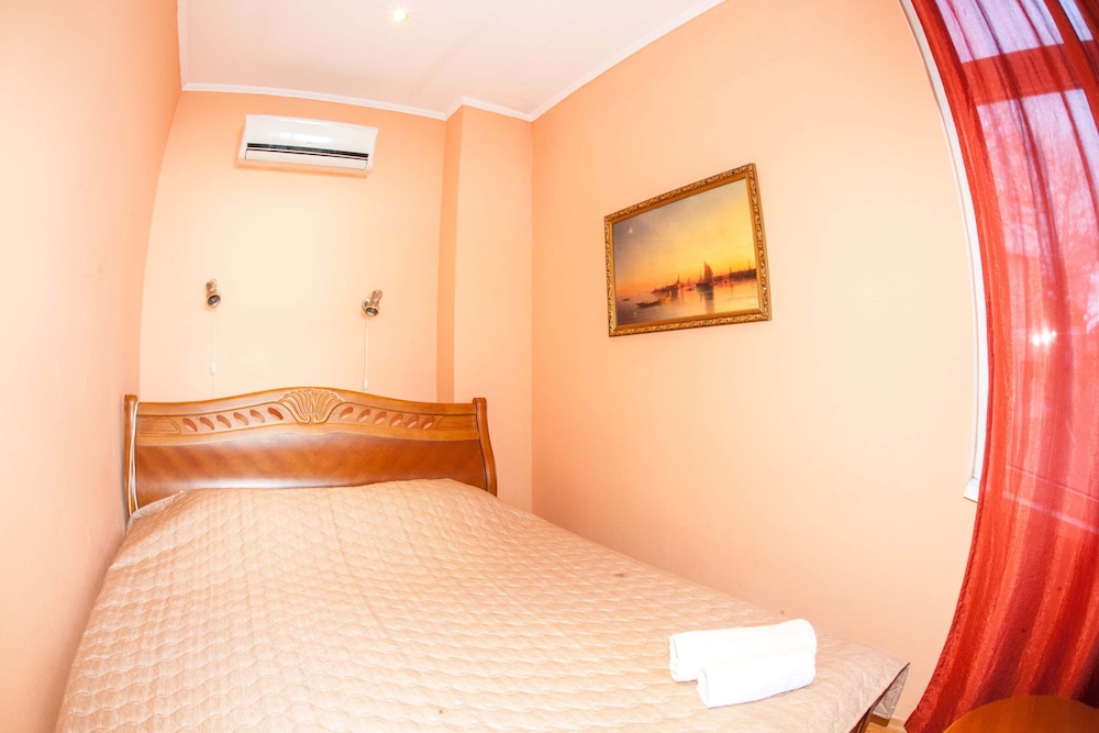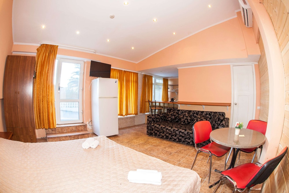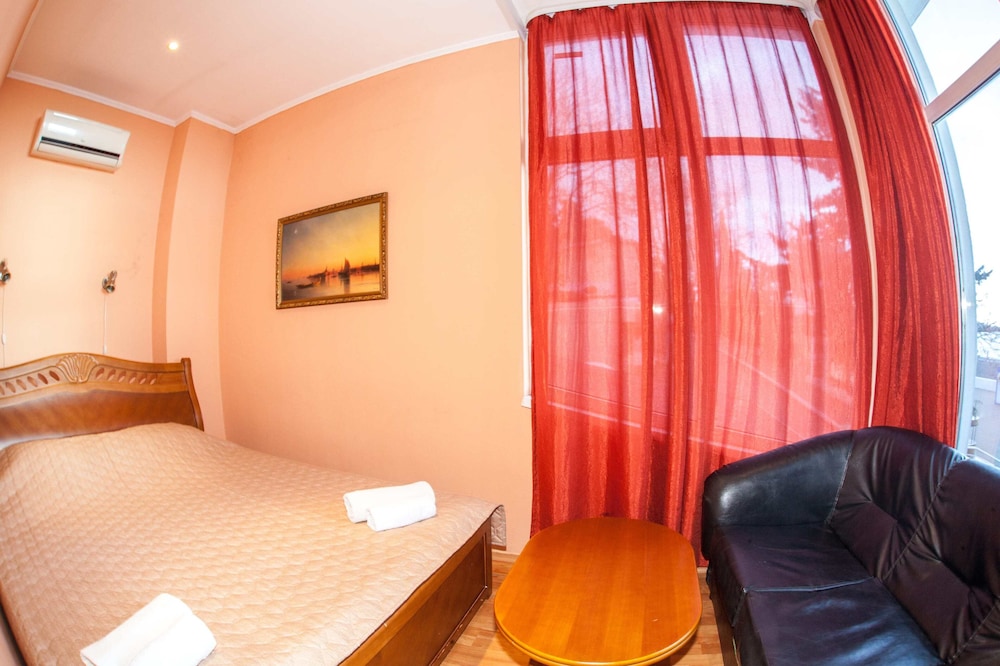 Бюджетный отель в 50 метрах от Черного моря. В отеле два этажа, на первом этаже двери на улицу, на втором этаже - в коридор. Номера небольшие, но внутри есть все: холодильник, обогреватель, чайник, плоский телевизор, кое-какая мебель. Есть душевая кабина и водонагреватель. Все, конечно, далеко не новое, но работает исправно. Если заказали завтрак - то он в небольшом кафе наверху, в целом, готовят вполне, но рекомендую заказывать кашу, так как яйца жарят в каком-то масле, получается очень жирно. Еще выдают только несколько пакетиков шампуня и жидкого мыла при заселении, потом надо просить. Так что советую взять с собой сюда кусочек мыла для рук/тела и шампунь. Персонал очень приветливый и дружелюбный, во всем помогут. Также они продают экскурсии, советую. И еще. По вечерам громкая музыка из кафе, если вы не можете под нее уснуть, лучше выберите другое место. Я, правда, легко и быстро засыпал, так как много ходил. Кстати, до вокзала всего полчаса пешком.