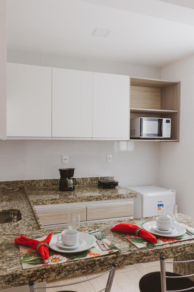 Espaço e a cozinha com seus acessórios, micro-ondas, pratos, xícaras etc.