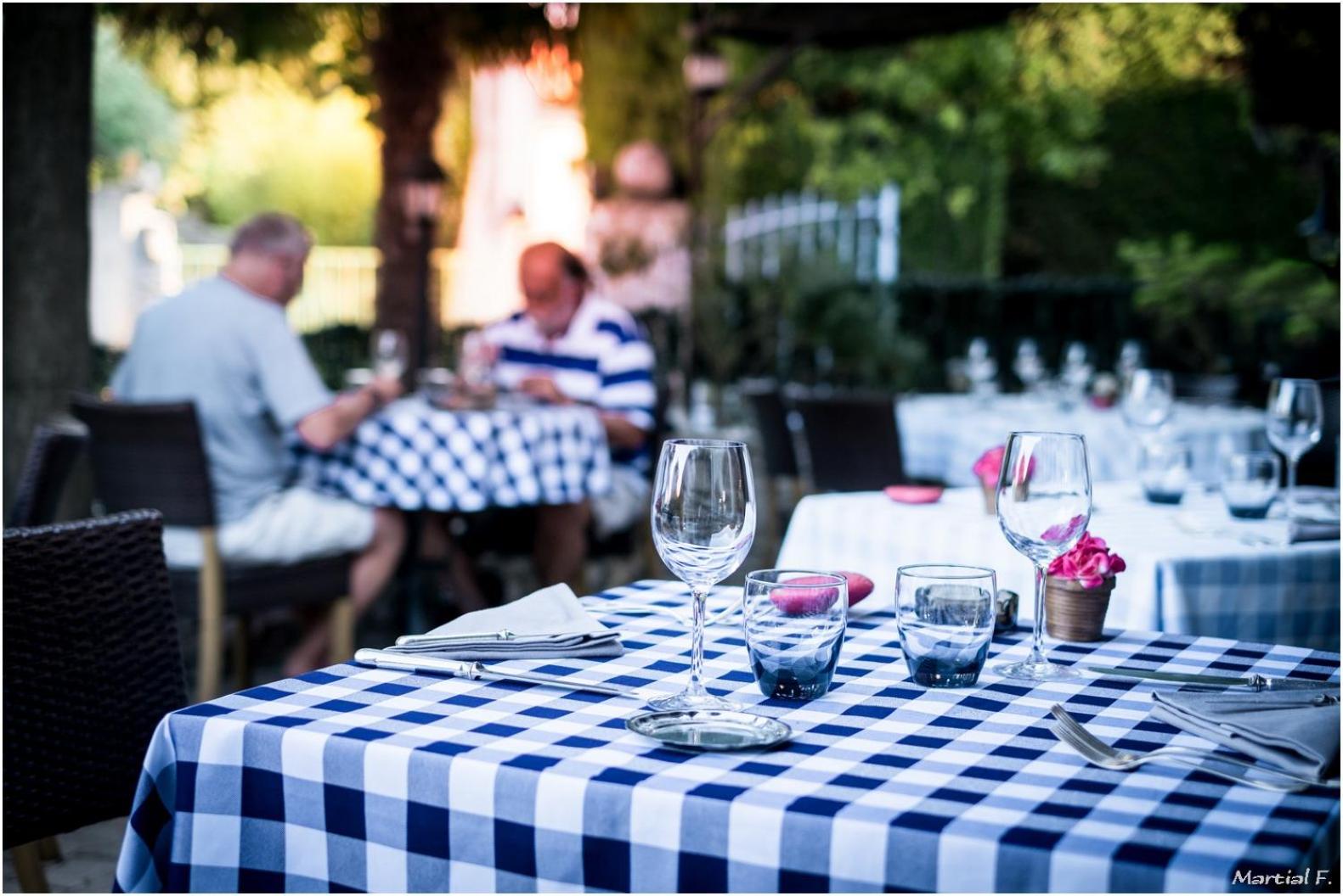 Enjoy the tranquility of the garden and terrace at Logis Auberge De Tavel, perfect for relaxing after a day of exploration.