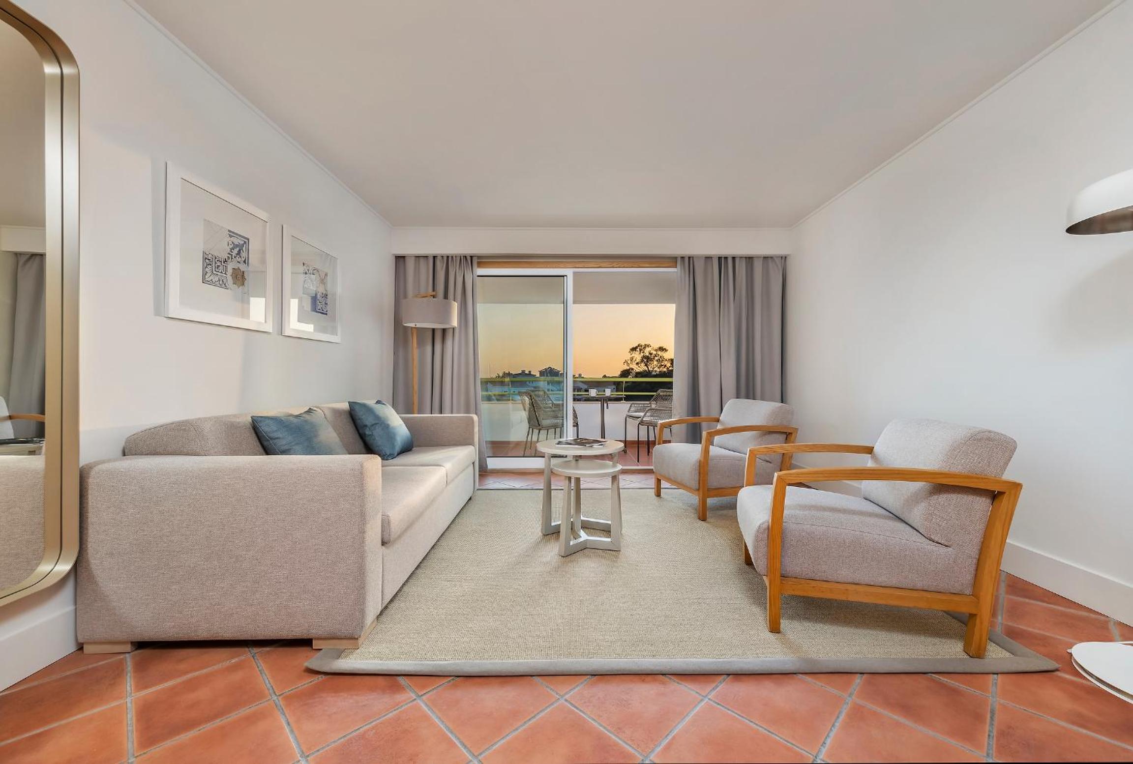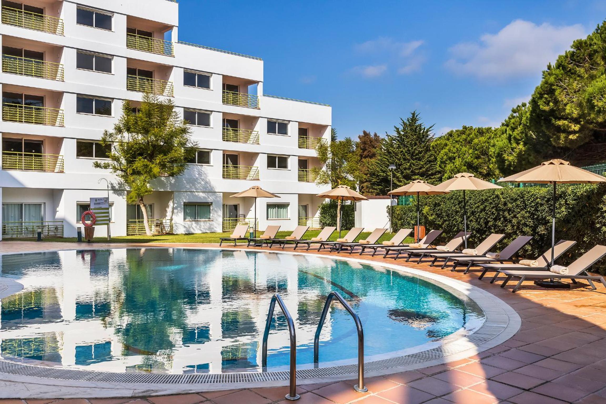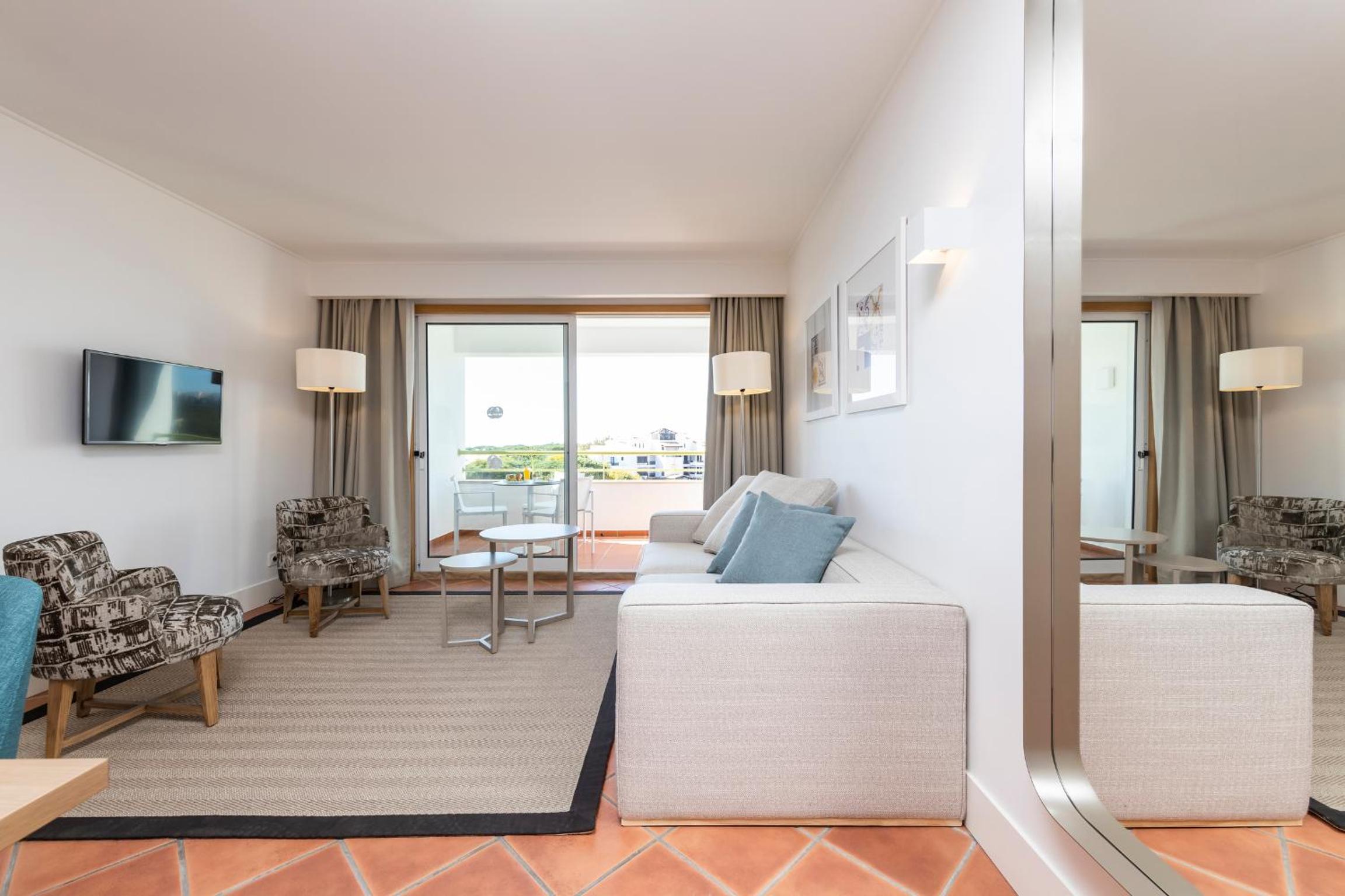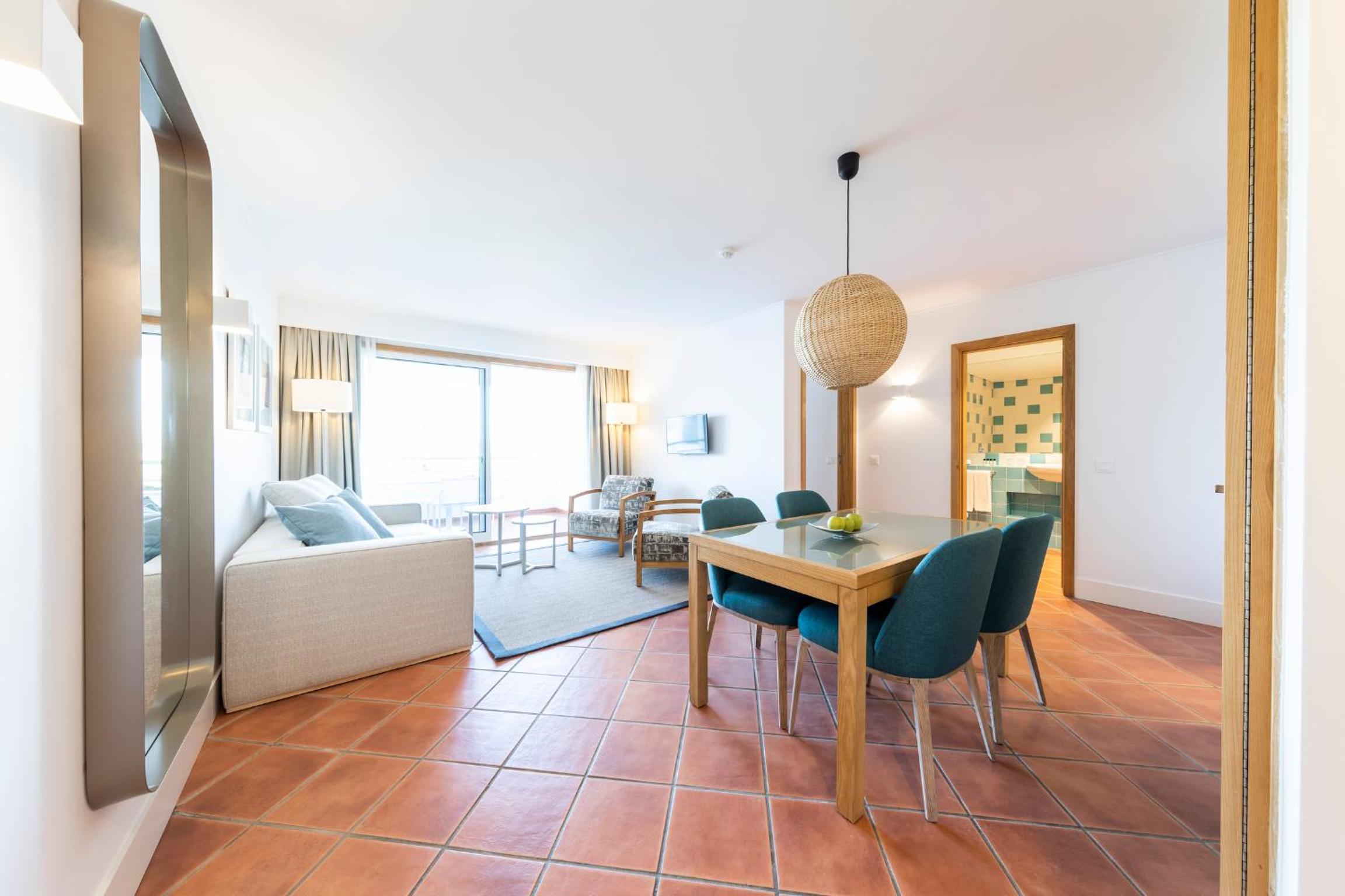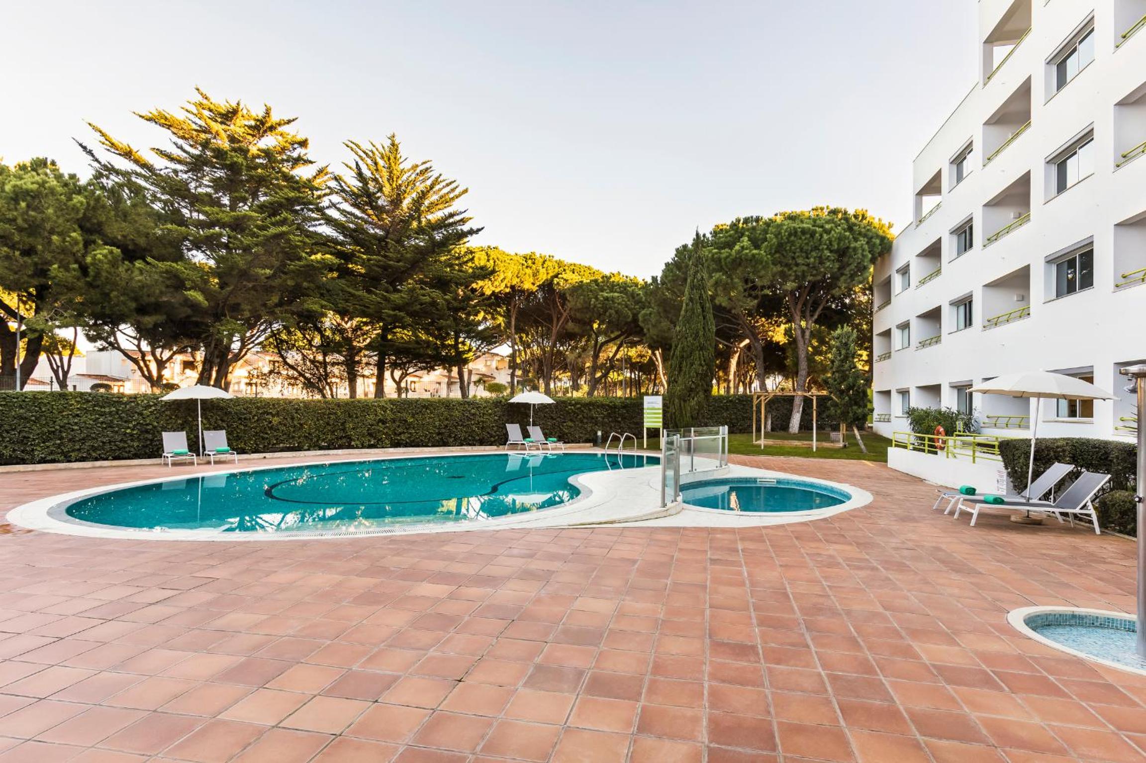 Hotel was very nice to stay in. Transfer takes approximately 30 minutes from Faro. We had 2 x Apartments. 1 x Double Bed, 1 x Twin & Sofa Bed. Spacious apartment. Very clean and comfortable. We were all inclusive the food had good variation each night. Breakfast there was hot and cold foods. All were well served. Staff were excellent. Plenty of golf courses around. Pine Cliff is across the street.