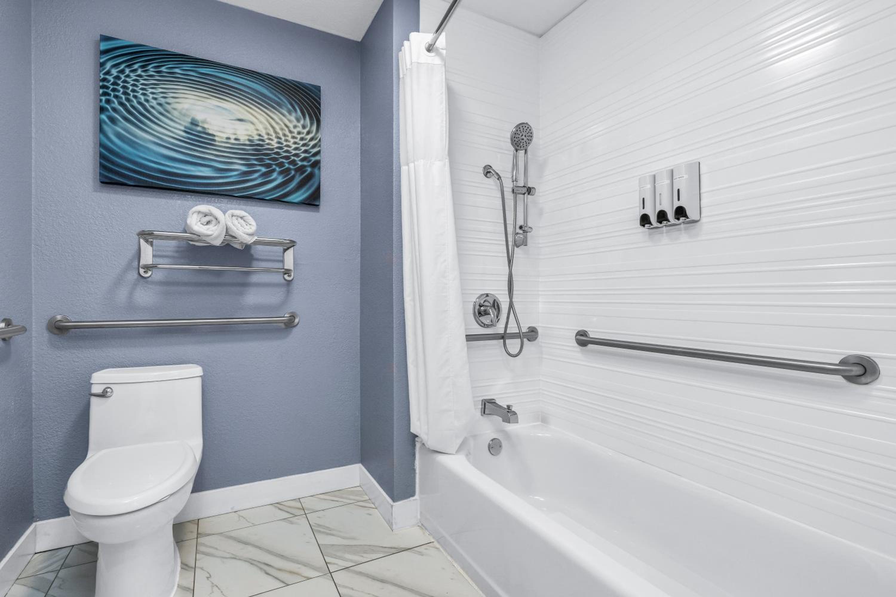 Shower head wasn’t working. No shampoo available , body wash available. Front desk lady was passing out on the computer.