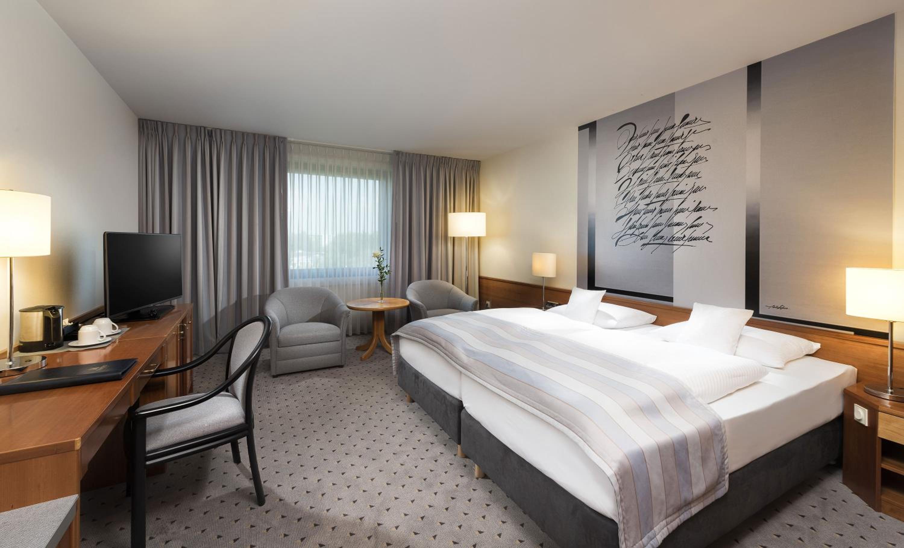 Experience elegant rooms at the Maritim Airport Hotel Hannover, each equipped with 80 international digital TV channels and modern amenities like a minibar and free WiFi.