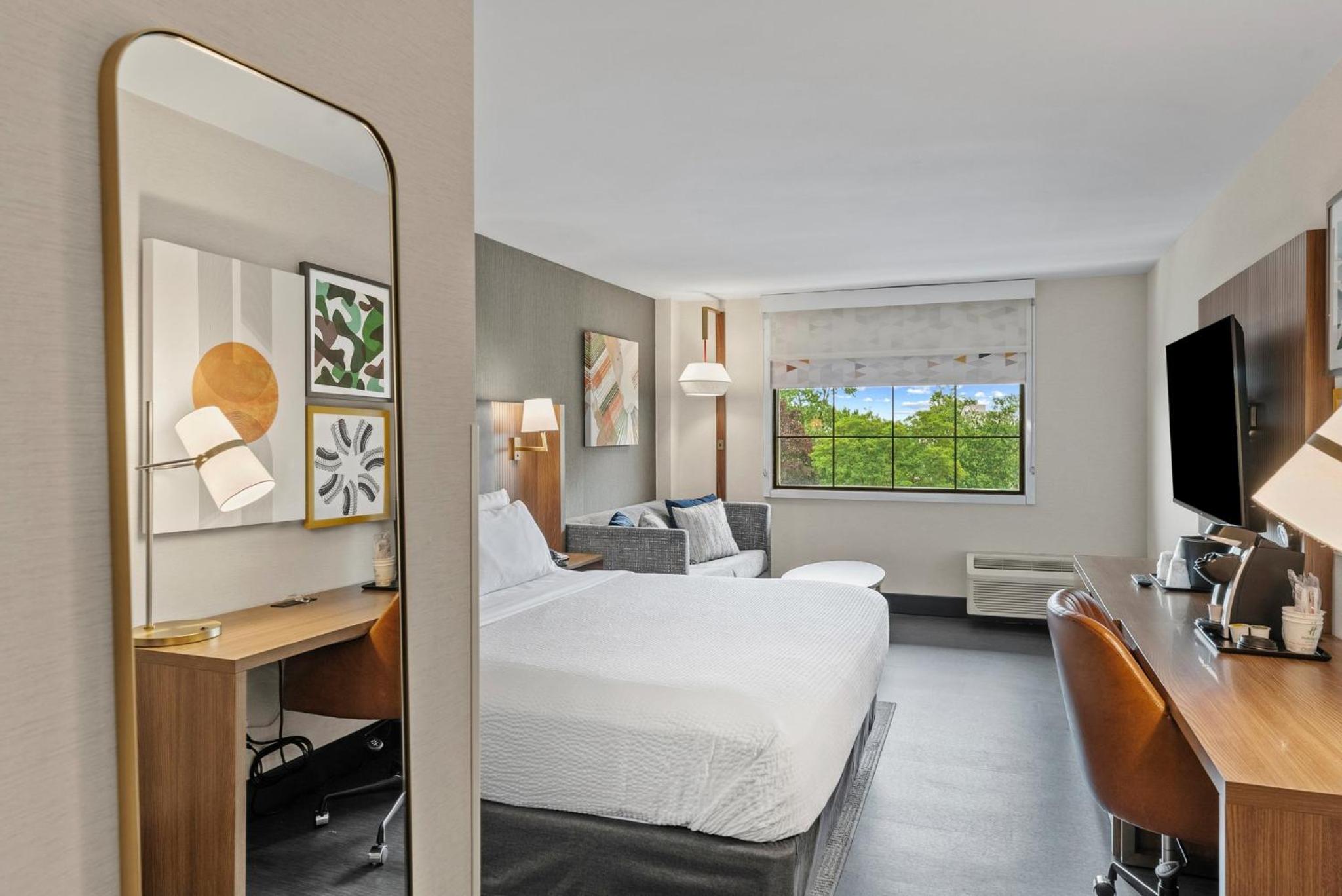 Experience comfort and convenience in our guest rooms equipped with modern amenities like a refrigerator, coffee maker, and flat-screen cable TV.
