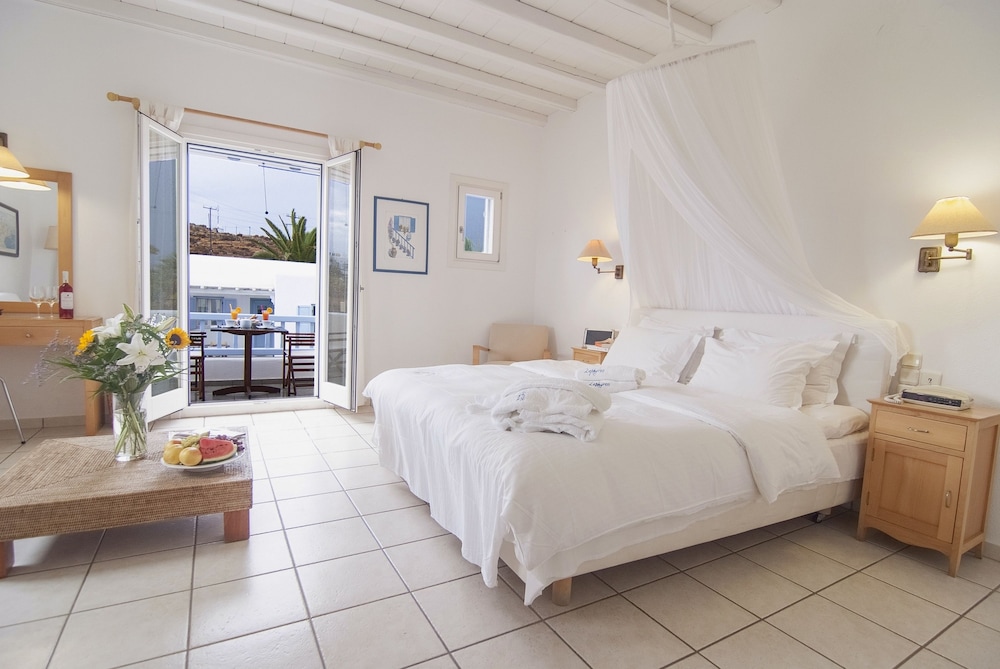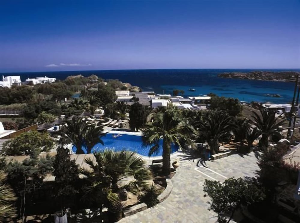 This hotel is perfect ,is 3 minutes walking to the beach and 10 minutes walking to the best beach clubs in the island also the schedule bus to go to mykonos downtown is right out the door entrance the swimming pool is beautiful and they have bar and restaurant in pool area