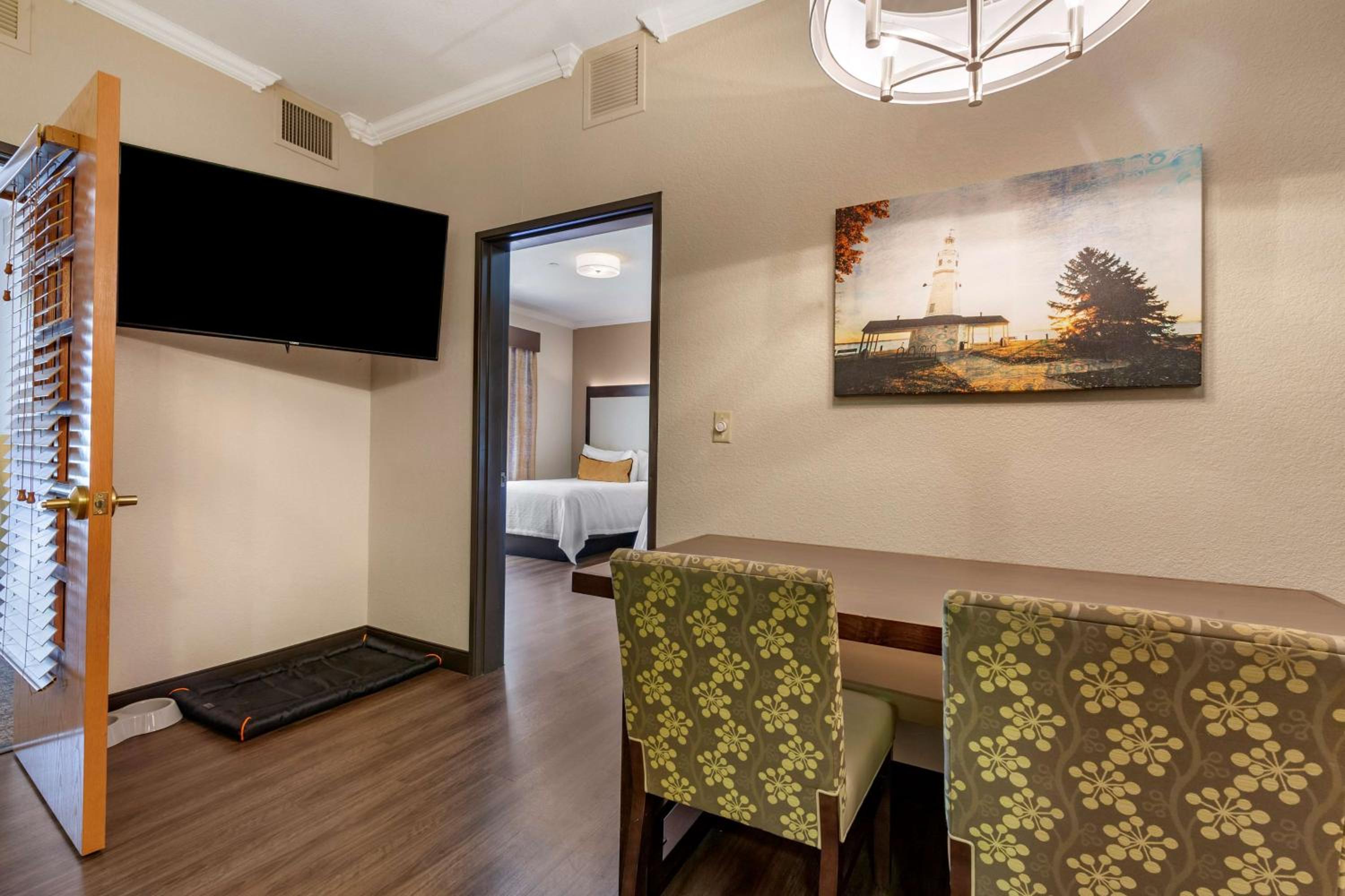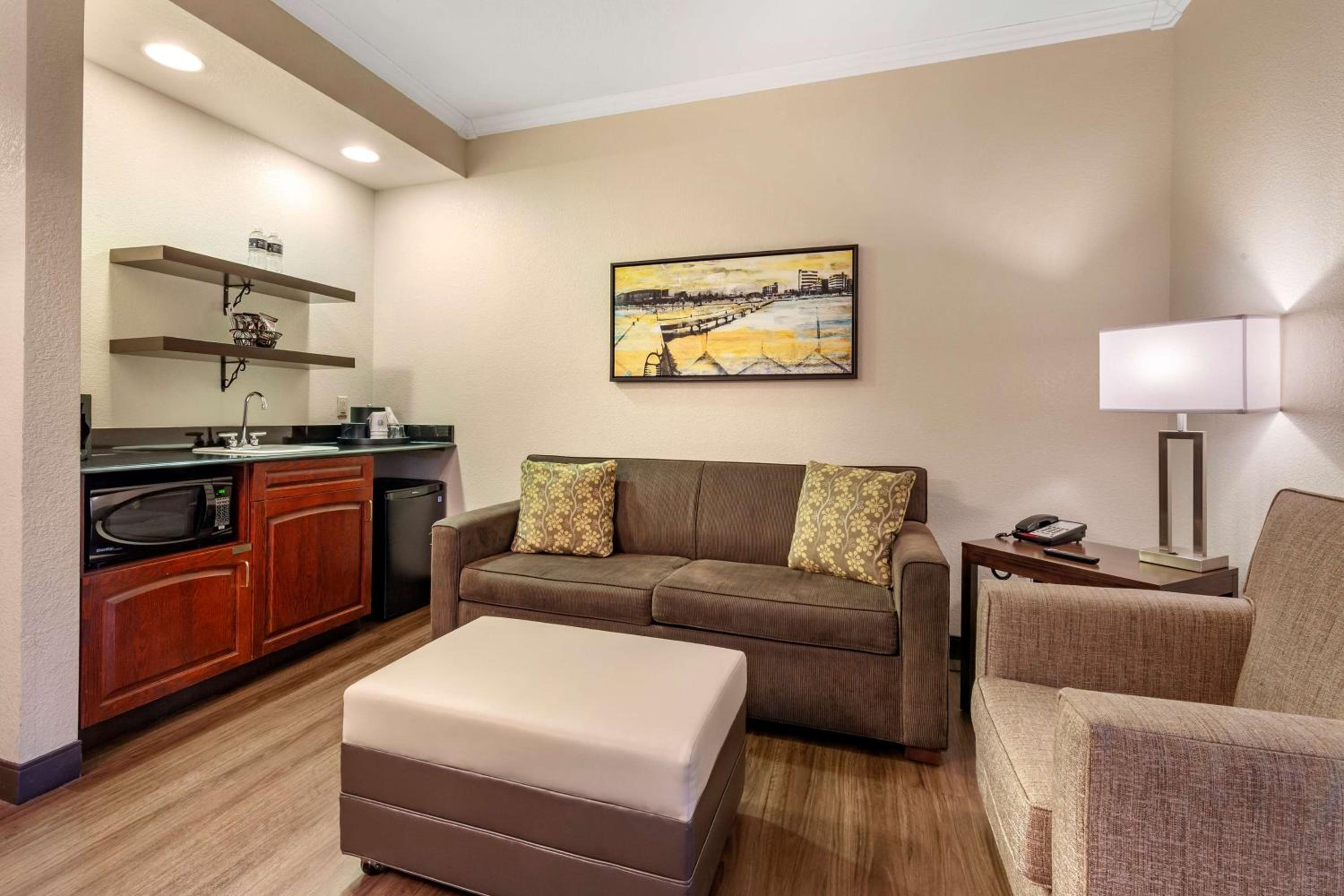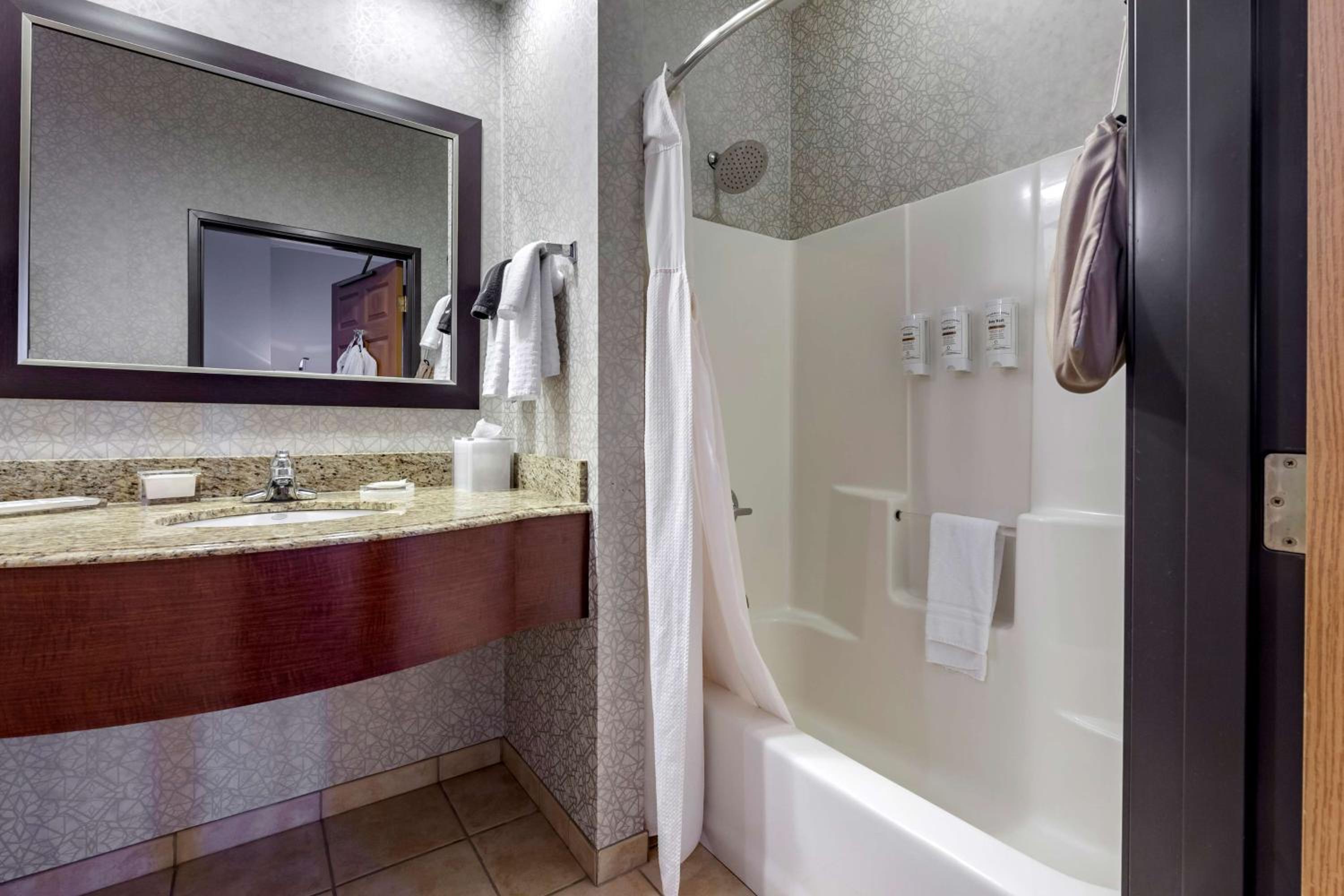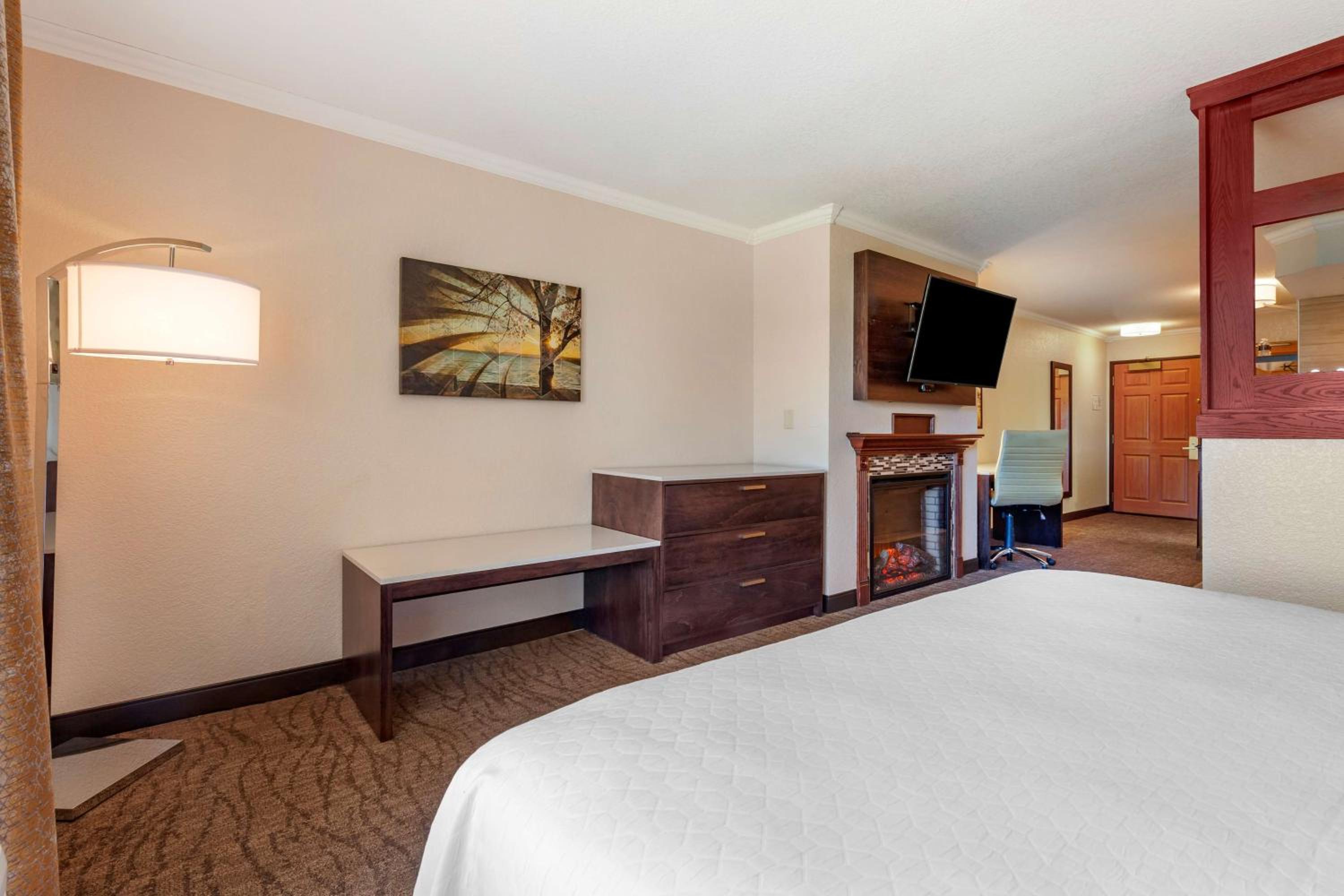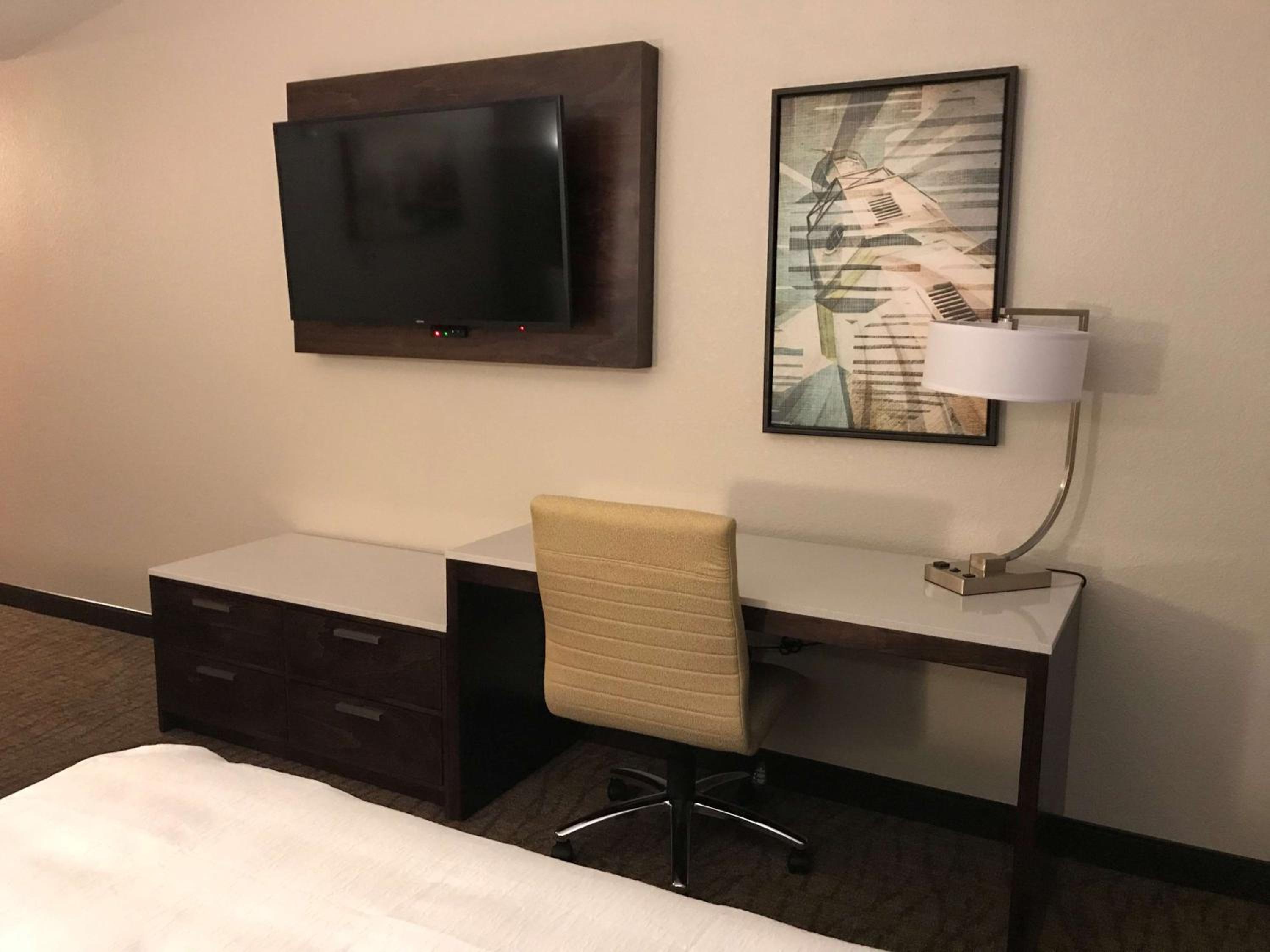 Chose this hotel due to having an onsite restaurant and it was close to our business destination. So glad we found it! Staff were very nice and professional. Rooms were very quiet and clean, had everything we needed. Hot tubs and pool and arcade for families, onsite bar and grill with delicious food at great prices. Just an overall great experience.
