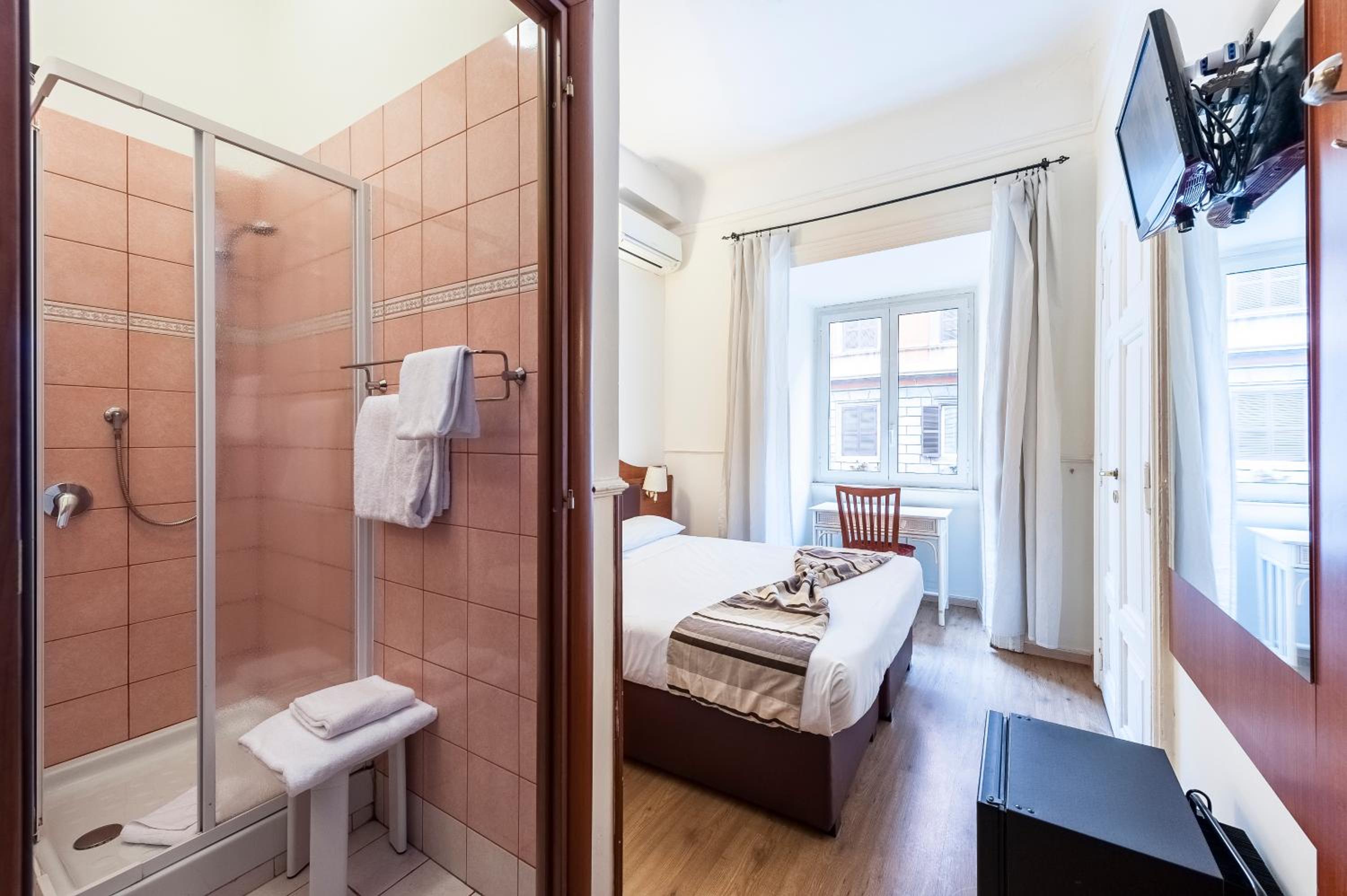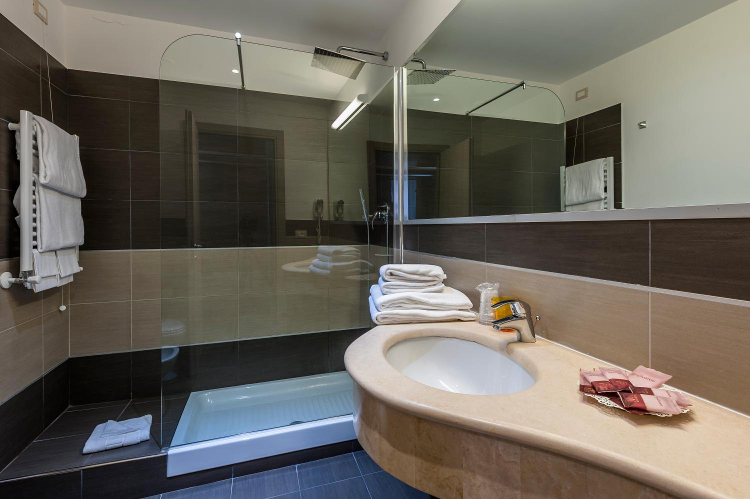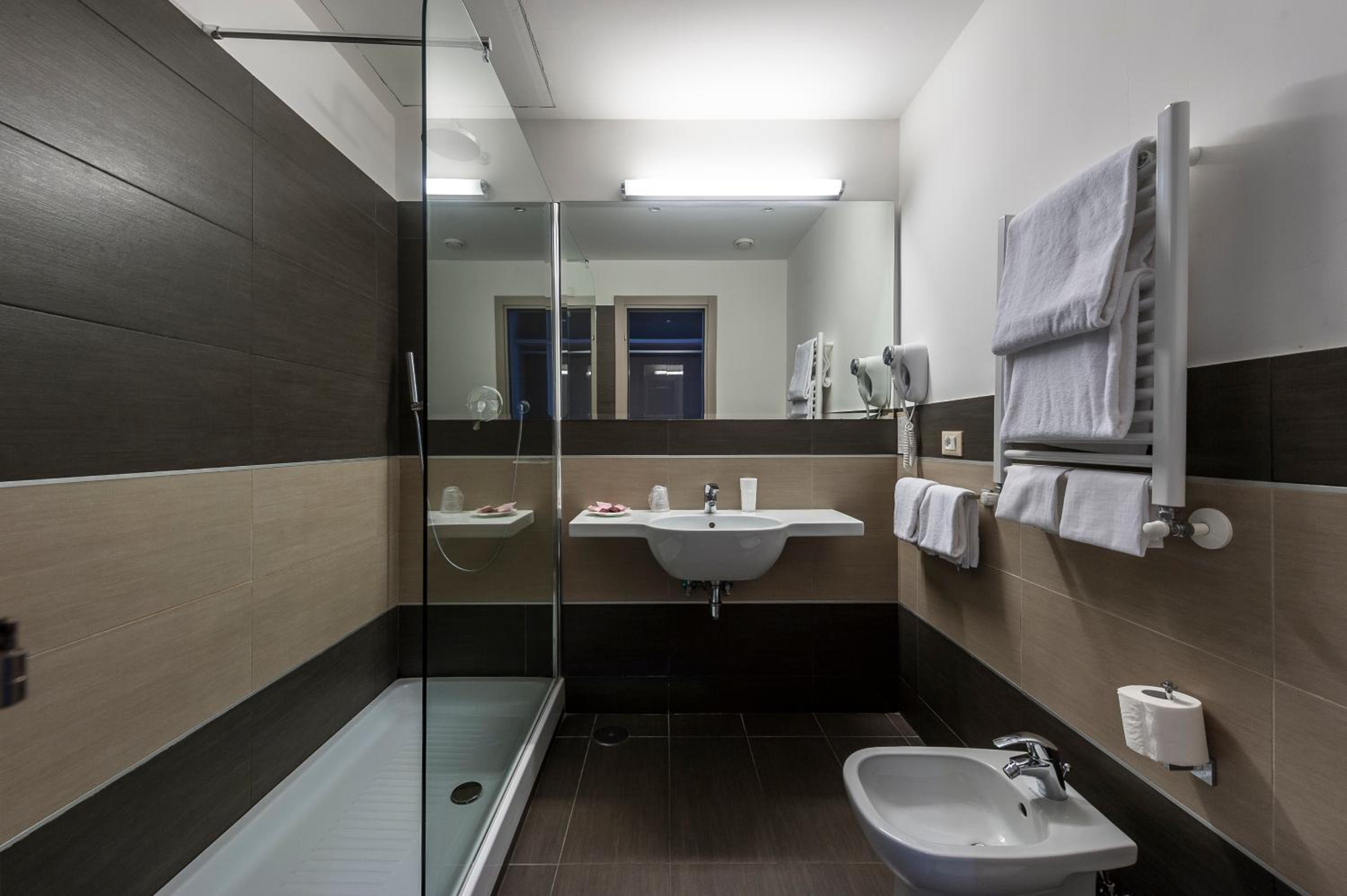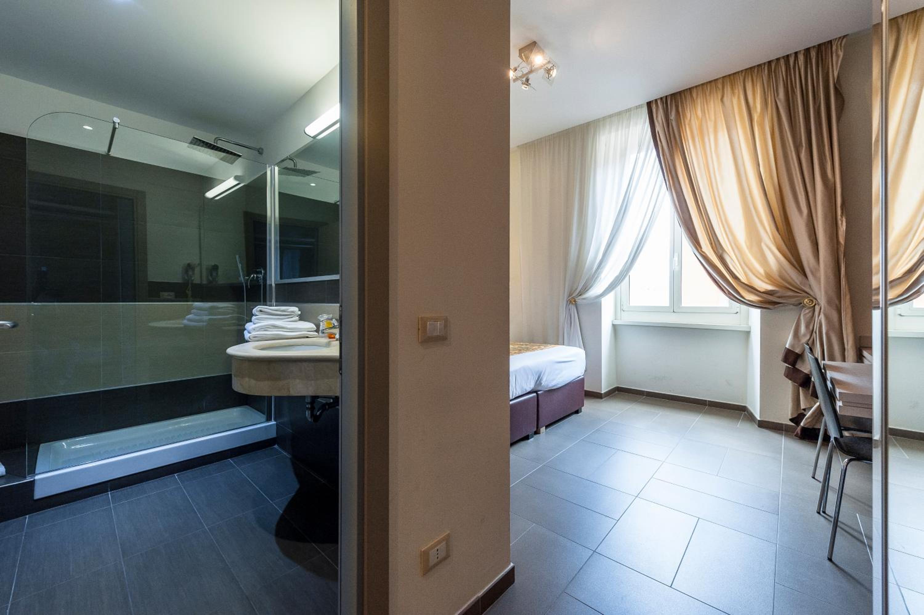 Mucha gentuza por los alrededores, el hotel en si, boh... nada mas entrar, ves como entras en otra dimensión... el hall de la recepción es años 60, una vez te dan la llave de la habitación, vas al ascensor (que este no le cabía más mierda), miras a tu alrededor y esta todo comido de mierda y suciedad... yo estuve alojado con mi pareja en la tercera planta (camera 306) y he de decir que la habitación estaba con luces y sombras, el baño es pequeñito, los sanitarios estaban limpios, pero las esquinas de la ducha estaban llenas de mugre (a la hora de ducharnos, pusimos una toalla en el suelo del asco que nos dio), el extractor del baño estaba llenísimo de mierda y la mampara de la ducha llena de suciedad, a más de esto, no salía el agua caliente, bajamos a la recepción y lo comunicamos, al final, en una hora nos lo arreglaron, papeles pegados con cinta aislante negra puesta de cualquier manera...