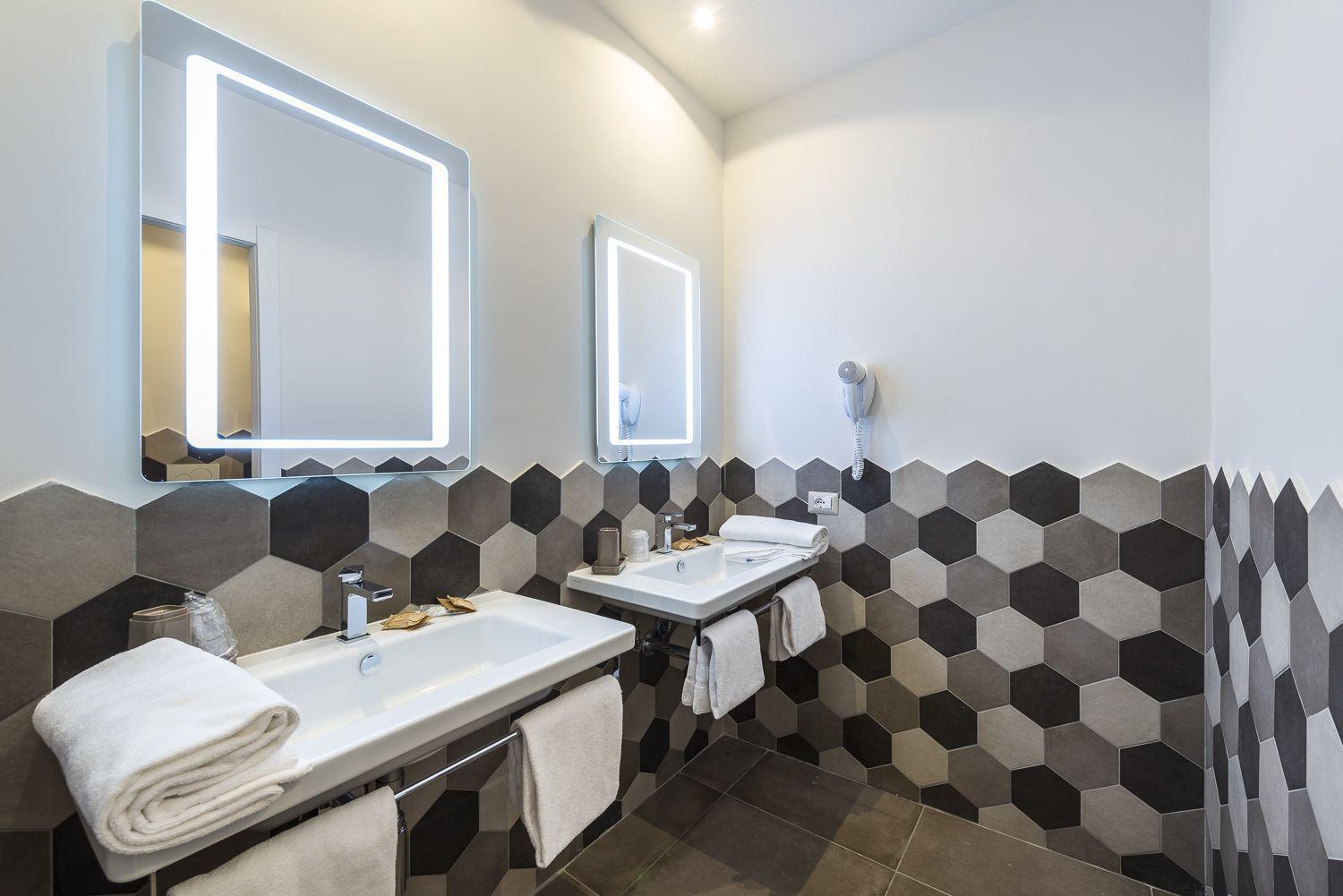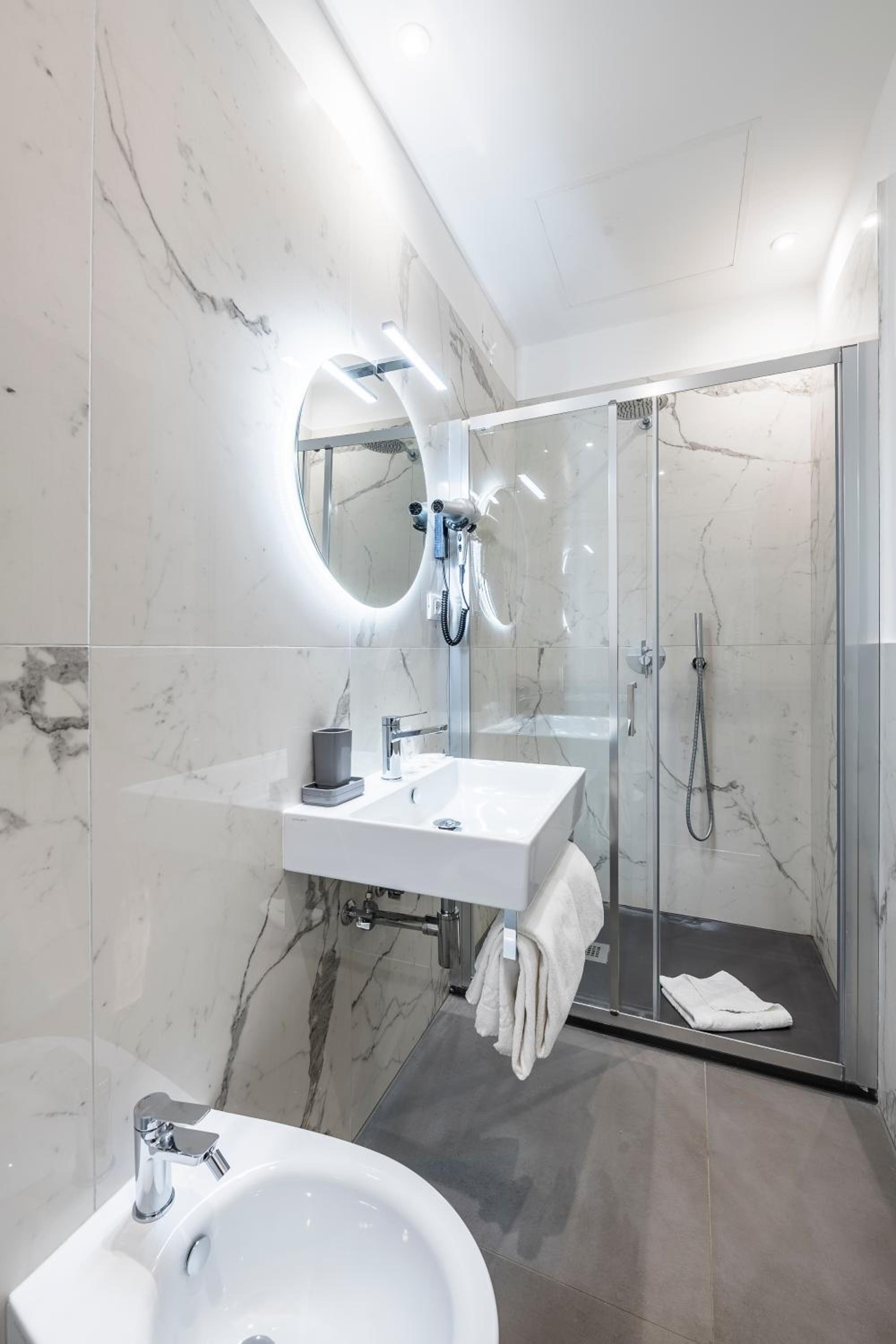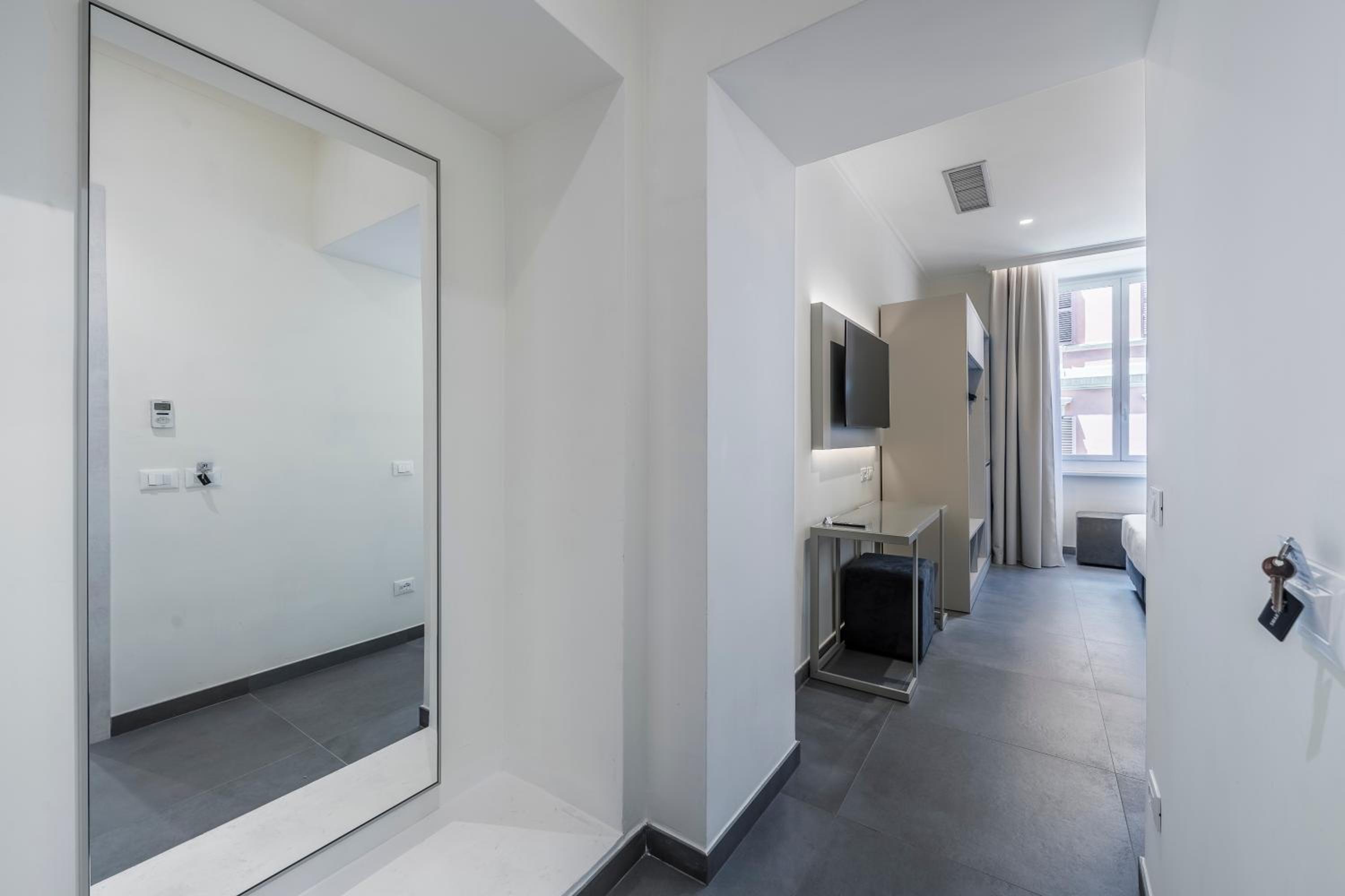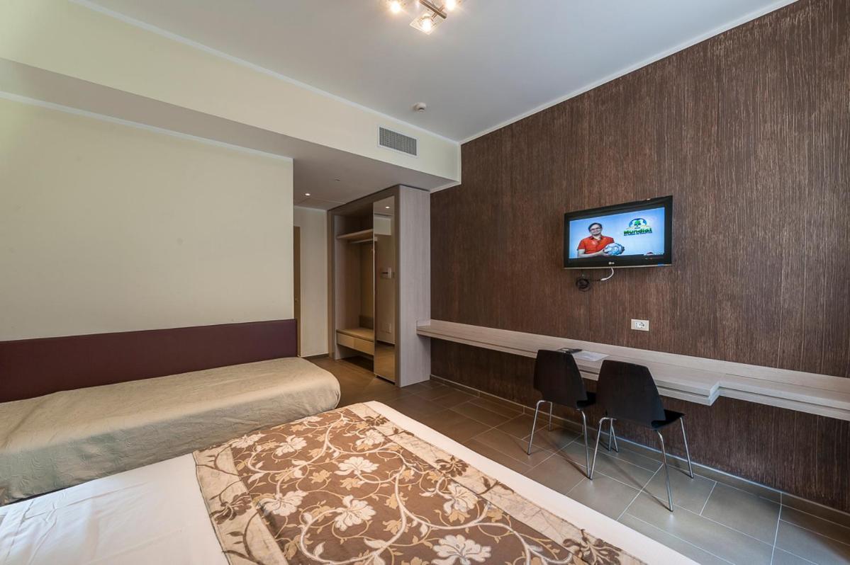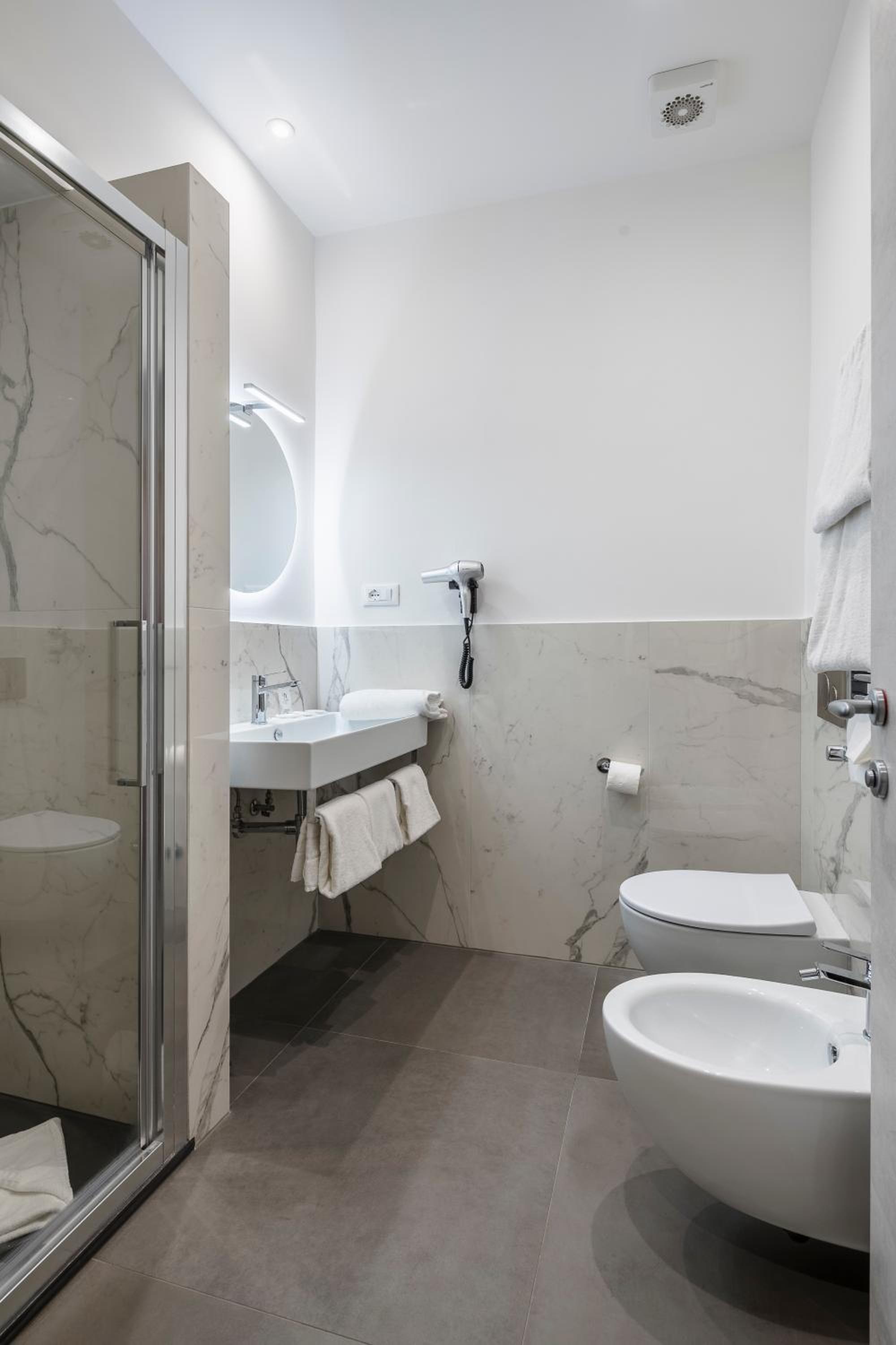 Mucha gentuza por los alrededores, el hotel en si, boh... nada mas entrar, ves como entras en otra dimensión... el hall de la recepción es años 60, una vez te dan la llave de la habitación, vas al ascensor (que este no le cabía más mierda), miras a tu alrededor y esta todo comido de mierda y suciedad... yo estuve alojado con mi pareja en la tercera planta (camera 306) y he de decir que la habitación estaba con luces y sombras, el baño es pequeñito, los sanitarios estaban limpios, pero las esquinas de la ducha estaban llenas de mugre (a la hora de ducharnos, pusimos una toalla en el suelo del asco que nos dio), el extractor del baño estaba llenísimo de mierda y la mampara de la ducha llena de suciedad, a más de esto, no salía el agua caliente, bajamos a la recepción y lo comunicamos, al final, en una hora nos lo arreglaron, papeles pegados con cinta aislante negra puesta de cualquier manera...