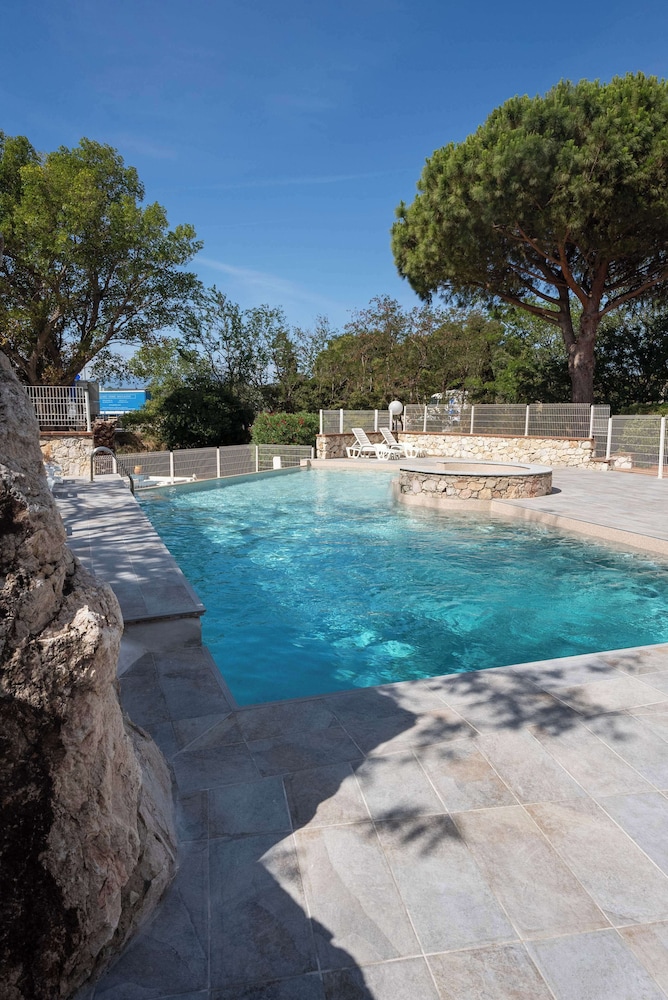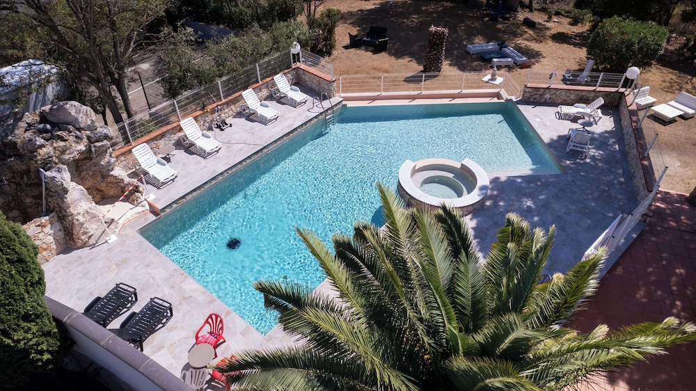 Piscine accueillante. Chambre très propre. Un peu juste pour 3 mais très correcte. SDB très réussie.