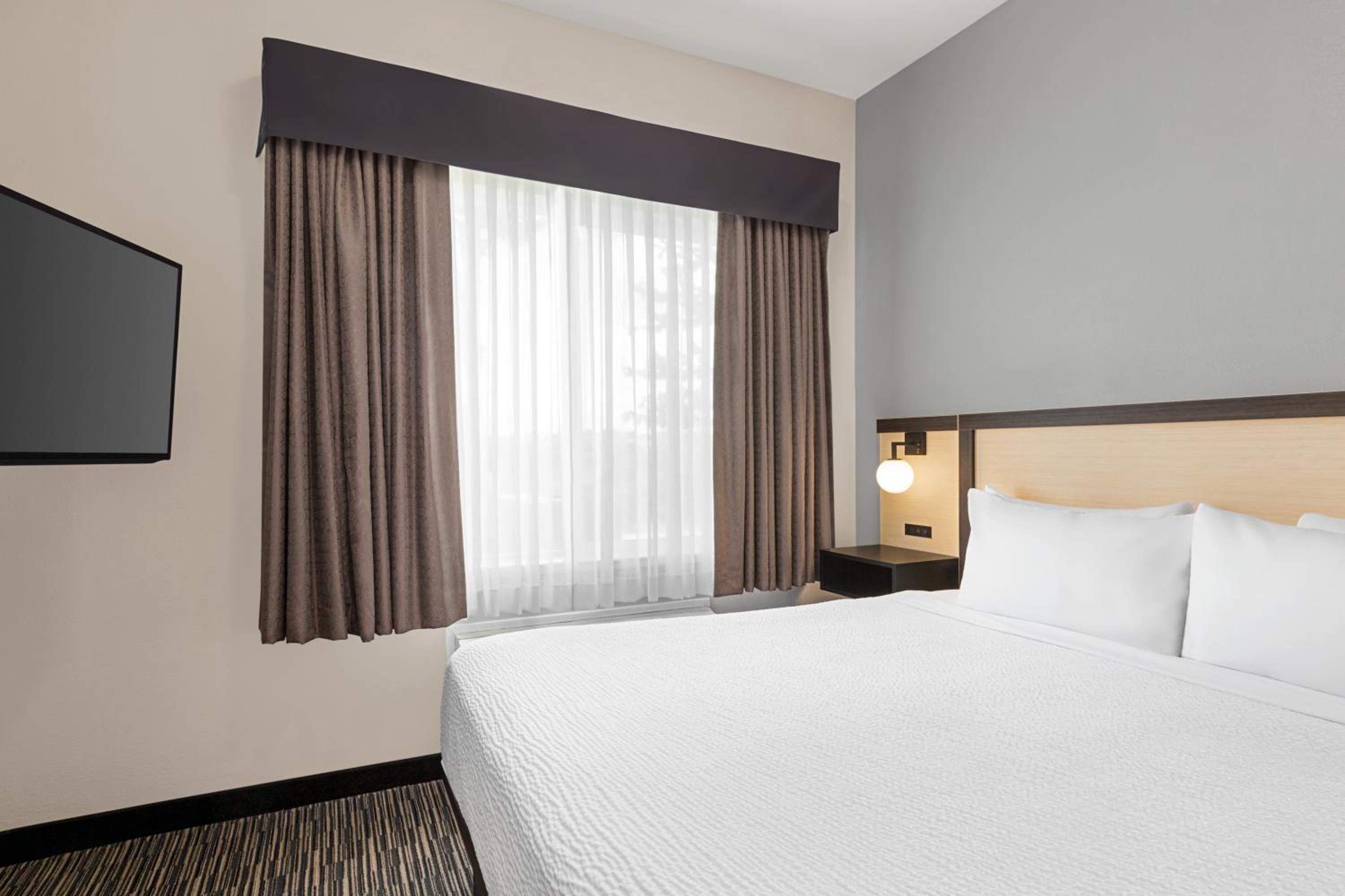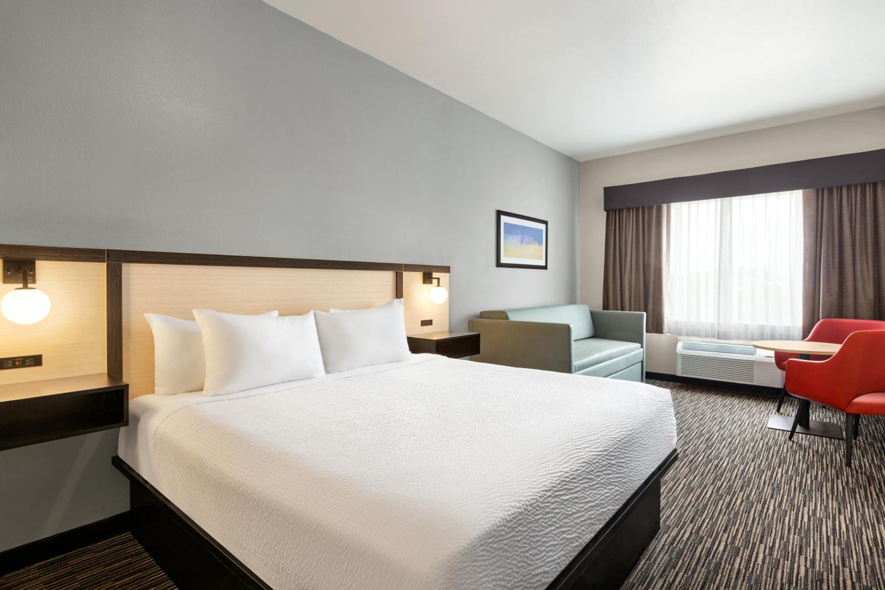 The room was clean and extremely big. We loved being able to actually have the space to walk around the room without running into furniture. The rooms had plenty of electrical outlets including where we needed them on the nightstand. The coffee machine in the lobby is a huge plus as well serving Philz coffee!