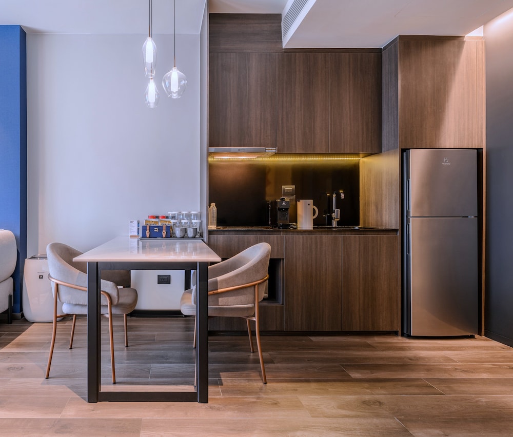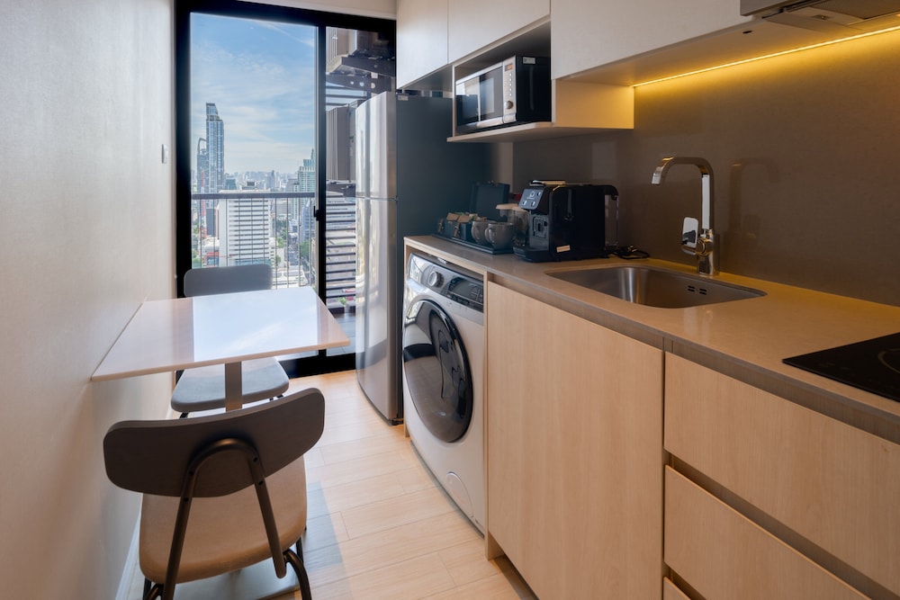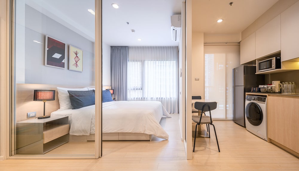 We stayed in a King Bed studio. Was well equipped with a microwave to heat up our Thai street food. Clean and comfortable. About 10 mins walk to Chid Lom station. Our air conditioning was very noisy but the staff fixed it for us promptly. Perhaps only lacking a coffee capsule machine 😊