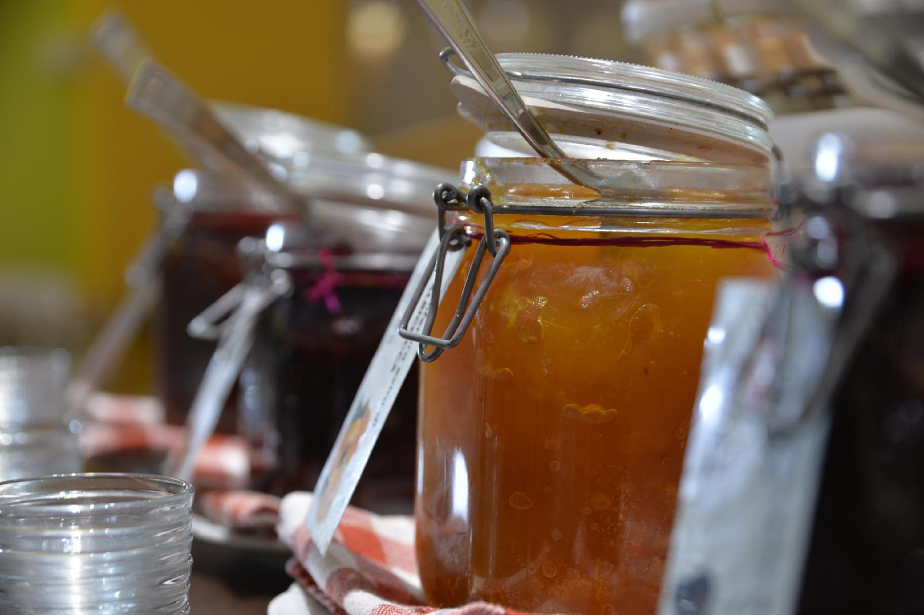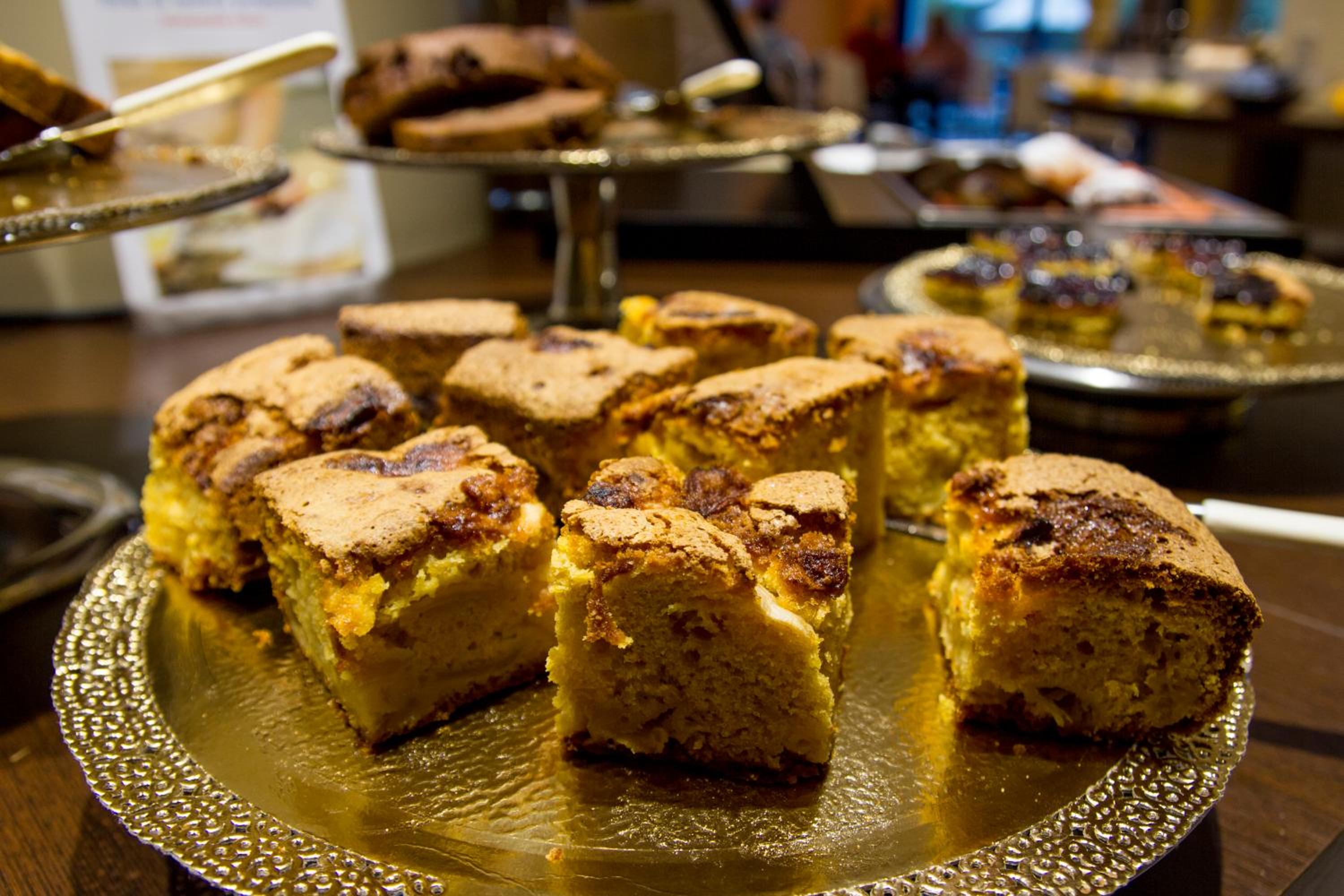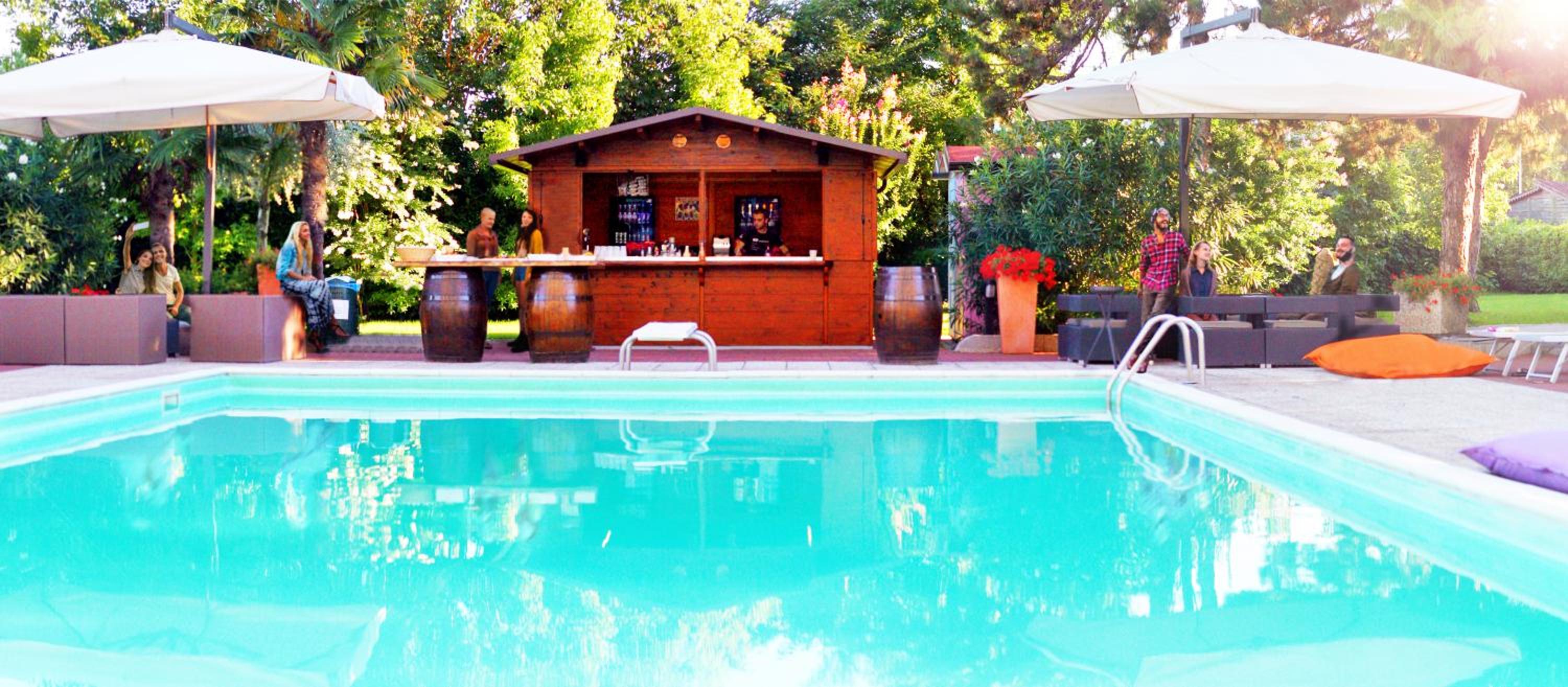 Guests can enjoy a refreshing dip in the garden swimming pool while indulging in a delicious buffet breakfast complete with fresh fruit, vegetables, cakes, eggs, and sausage.