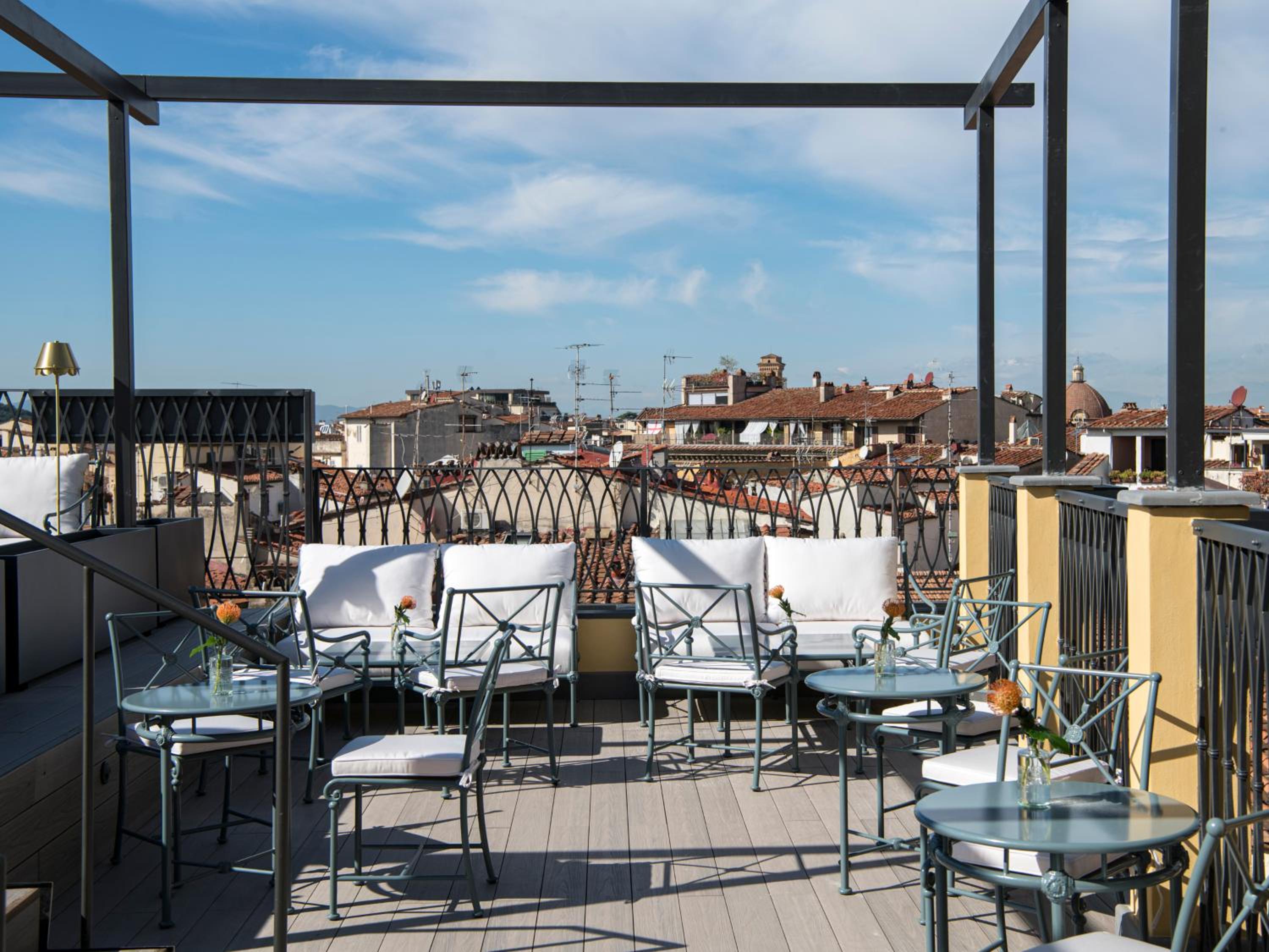 The IL Tornabuoni The Unbound Collection by Hyatt Hotel offers a luxurious experience with its rooftop terrace featuring a Champagne bar and stunning panoramic views of Florence.