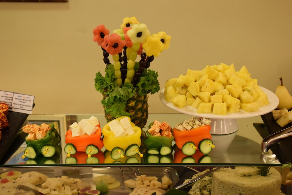 Restaurant staff very attentive welcoming you Helen the cook and Alex and the other ladies in the restaurant. Breakfast and dinner had many selections of food. Enjoyed the greek night with live music.Room was outdated.