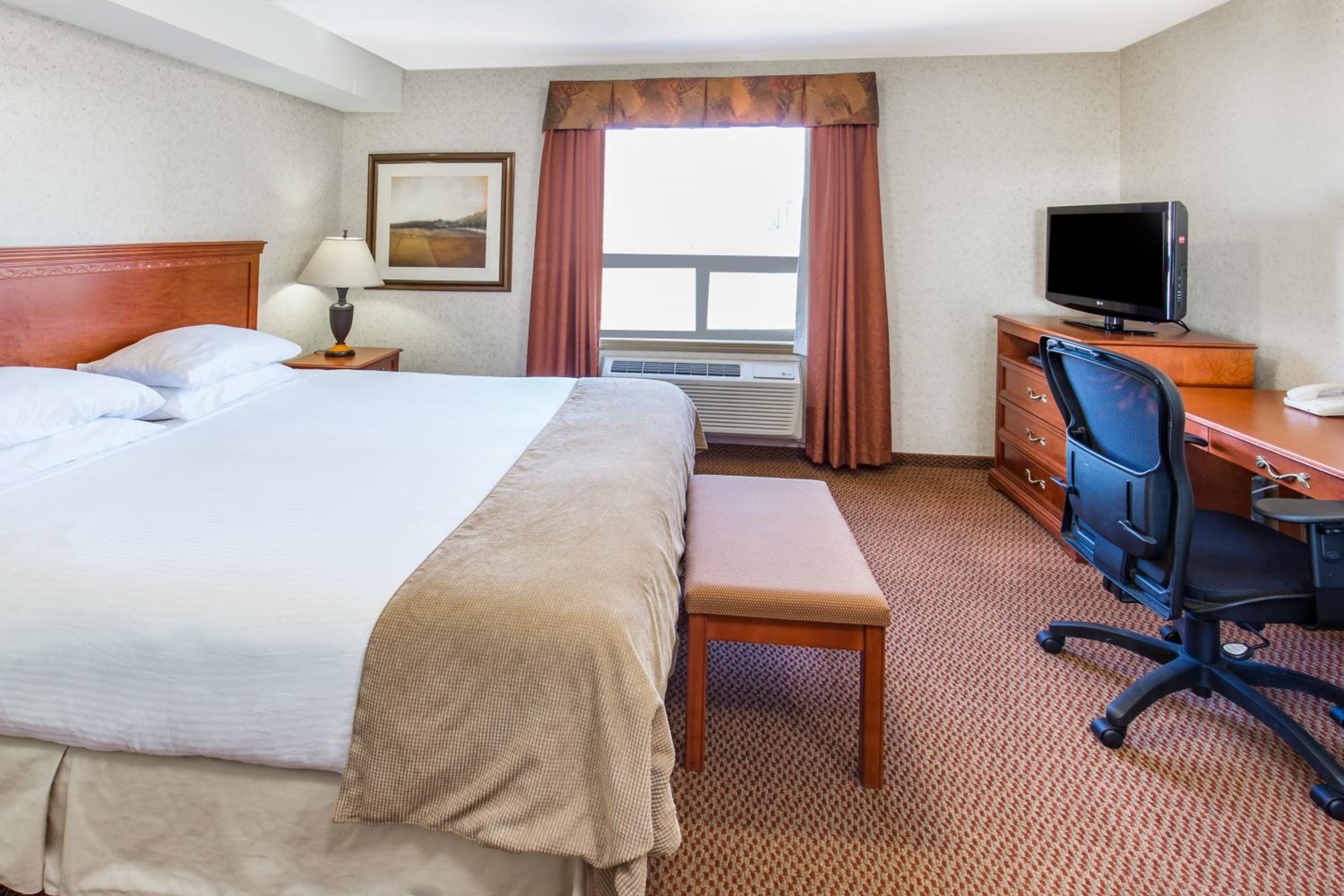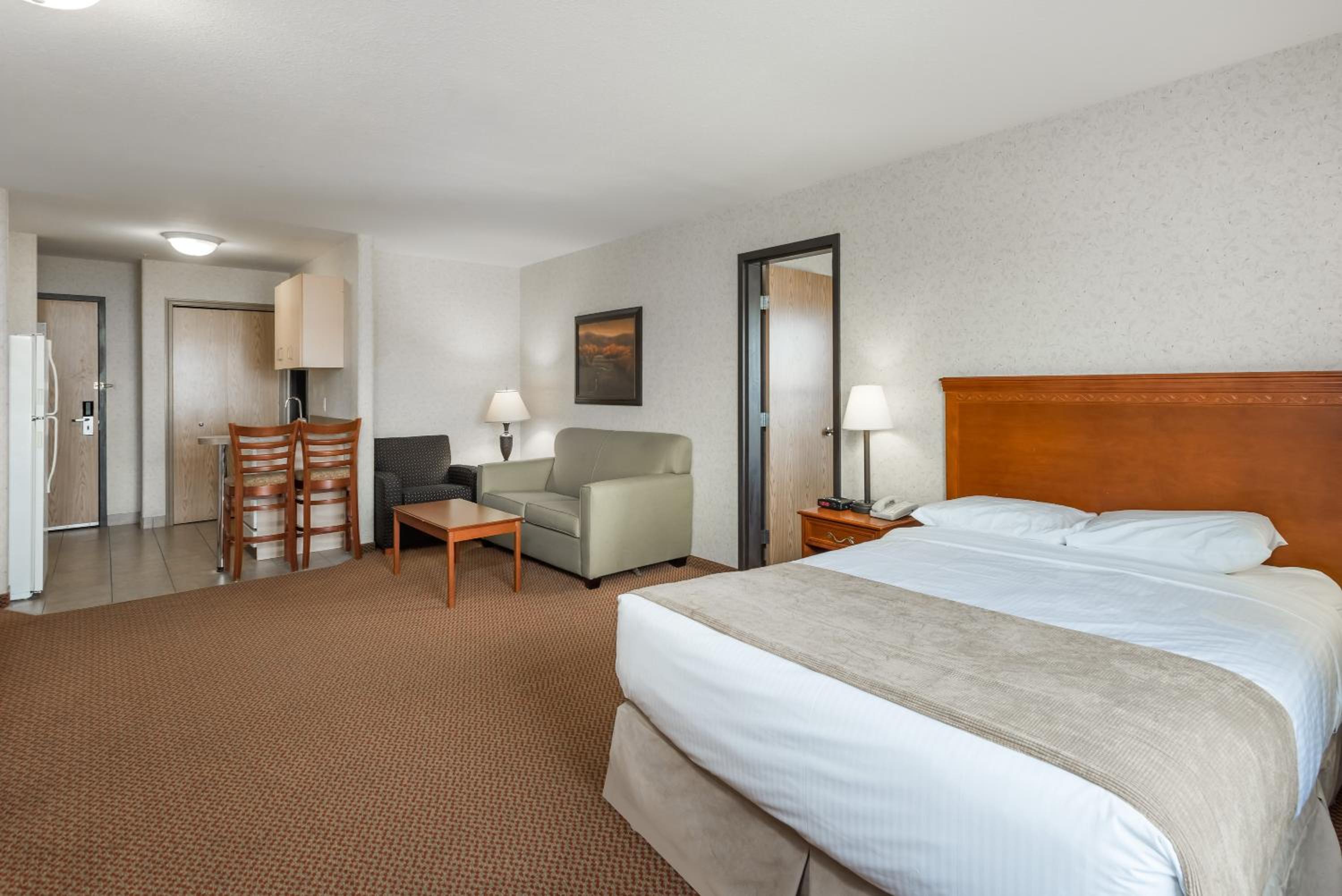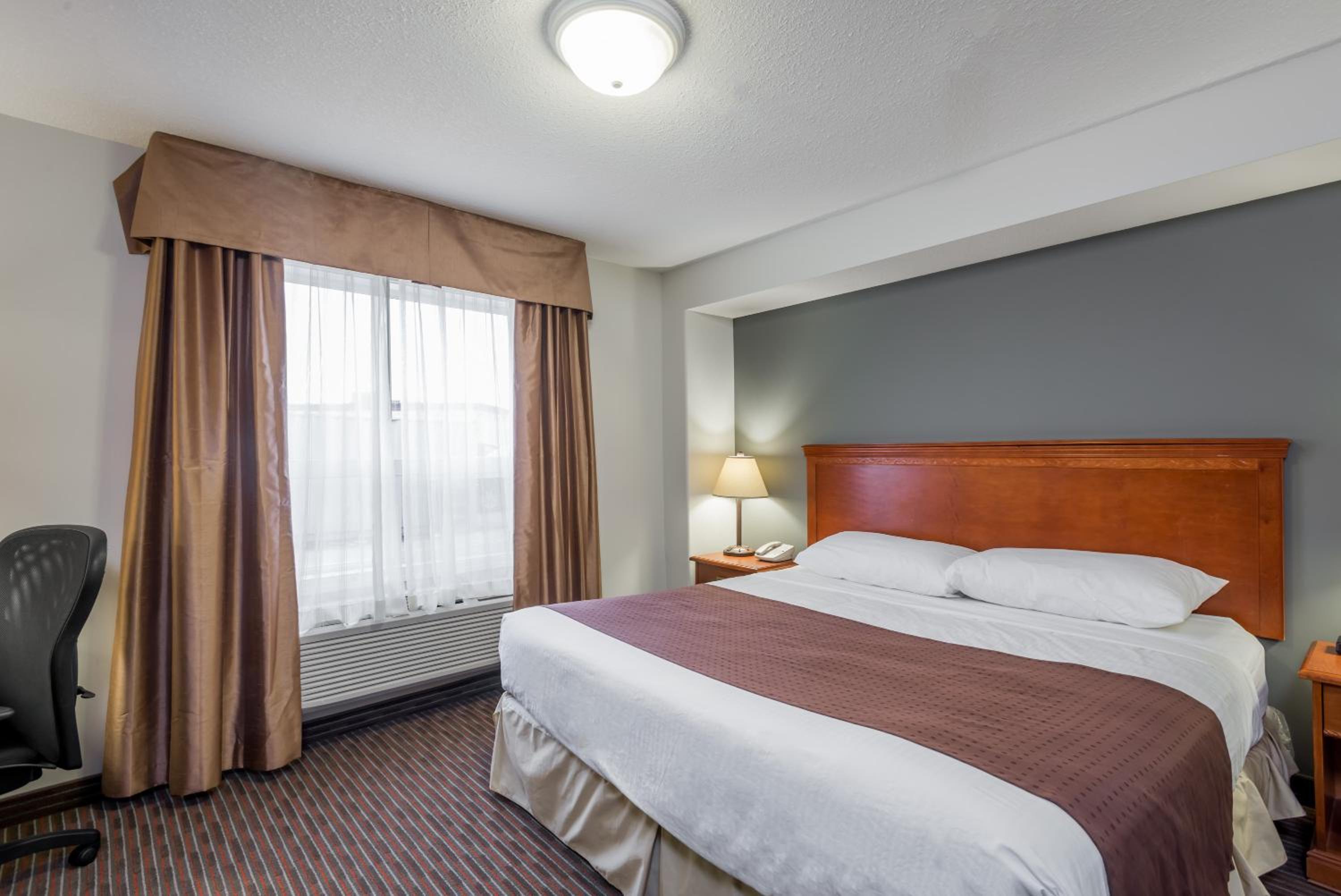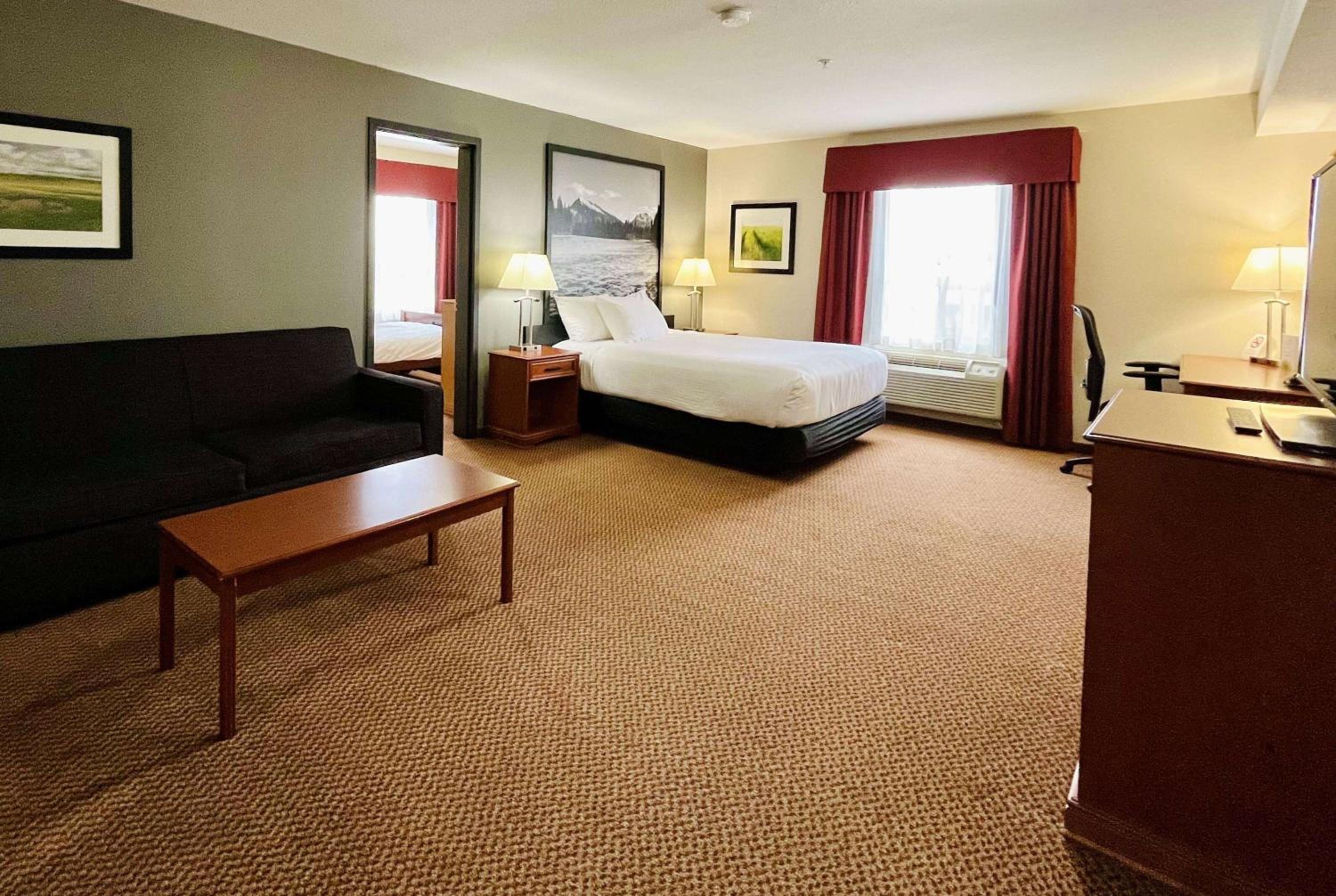 Enjoy free shuttle service to/from Grande Prairie Airport, free WiFi, and in-room essentials like a flat-screen TV, microwave, and refrigerator. Upgrade to a suite with a kitchenette for added convenience during your stay.