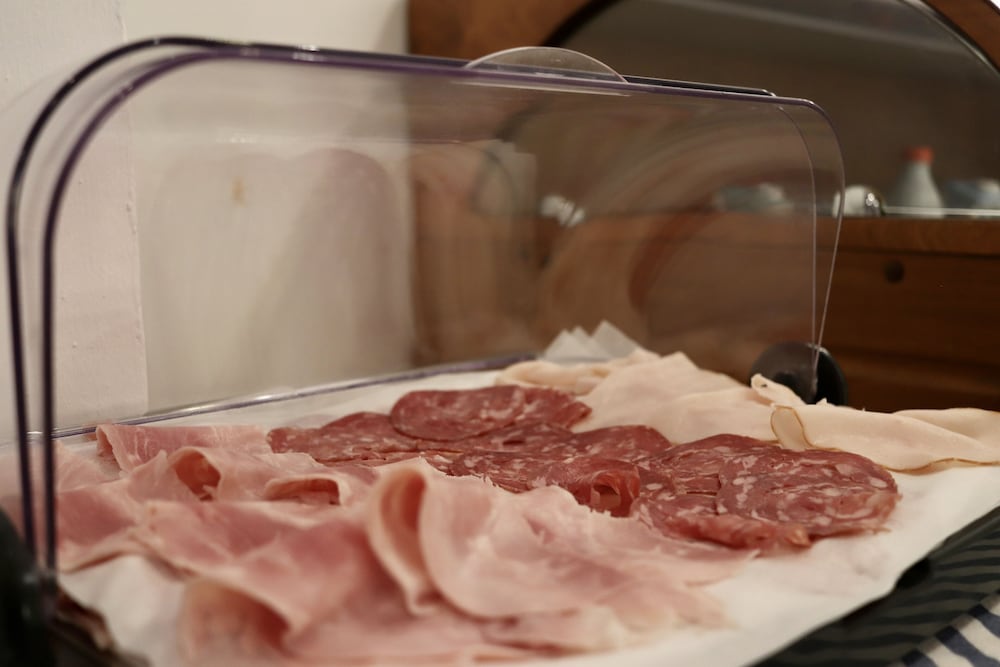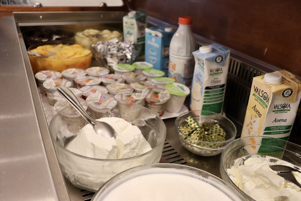 Breakfast was very basic: one type of eggs (scrambled), cut-up sausages, a small selection of ham, cheeses, fruits, and some sweet pastries. That would have been enough for me, but the fact that a supposed four-star hotel in Italy serves instant coffee with powdered milk is simply unacceptable.