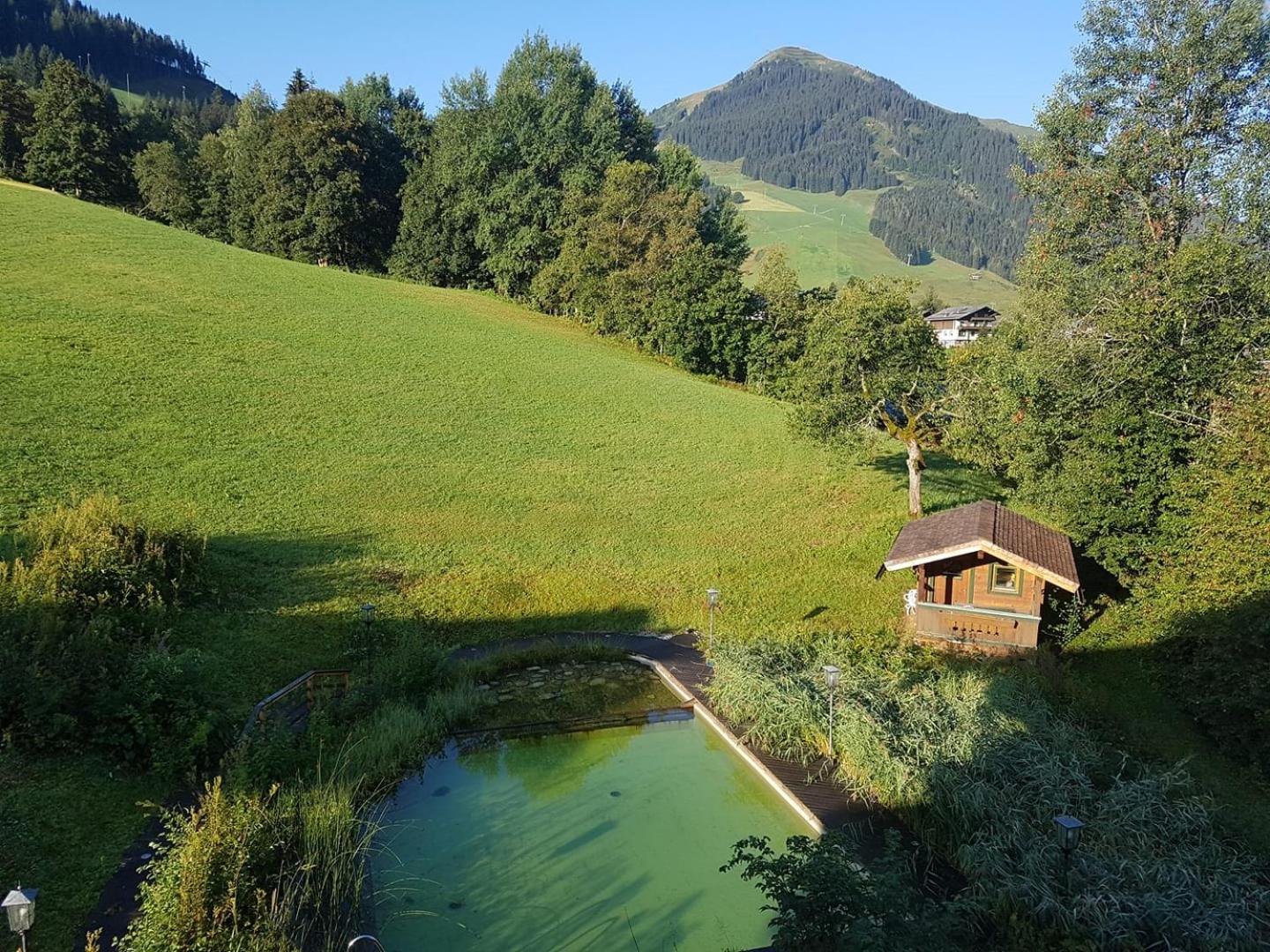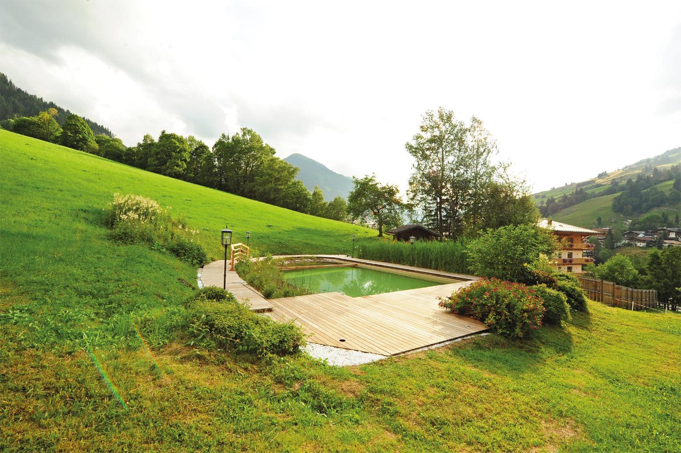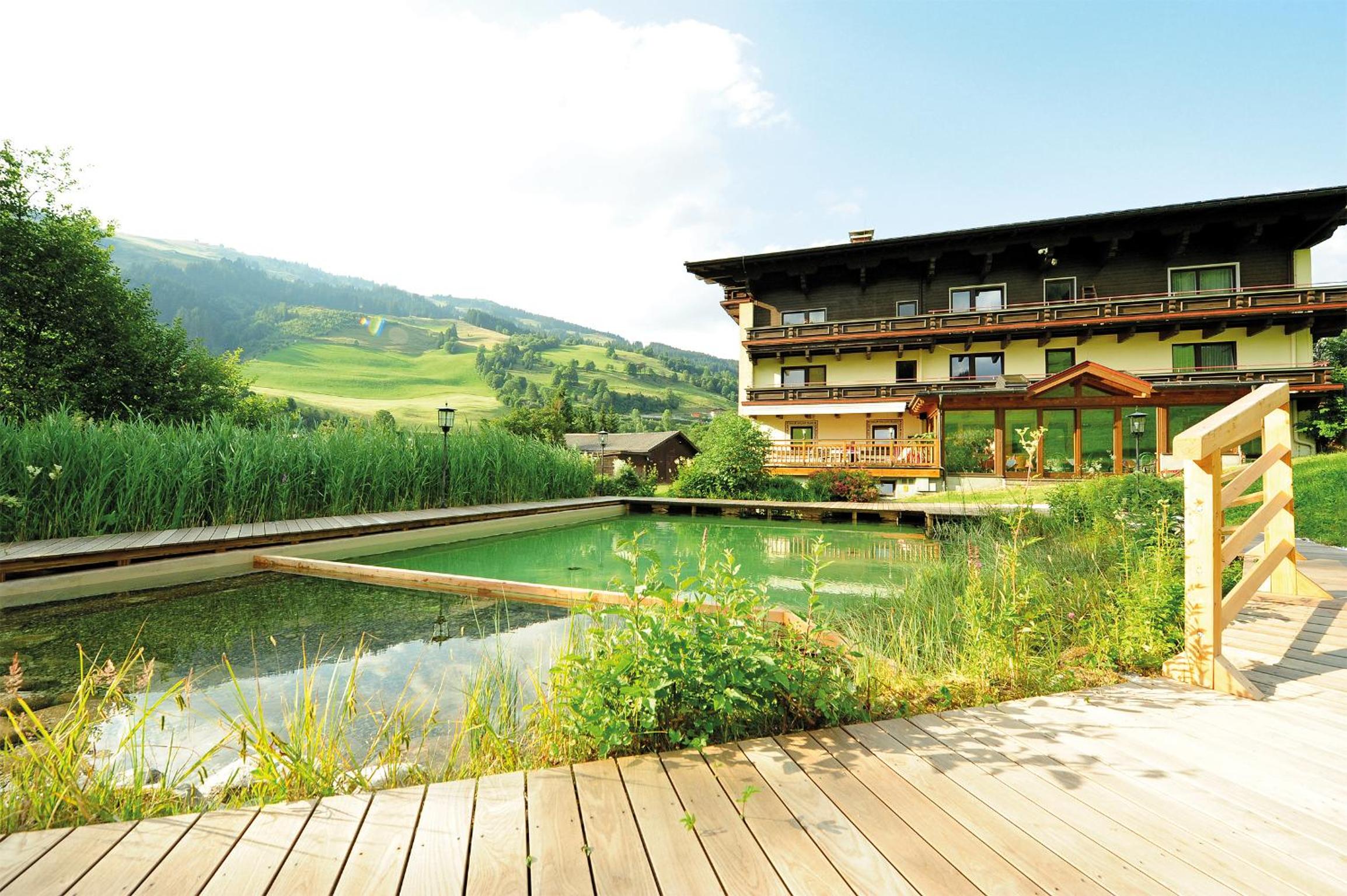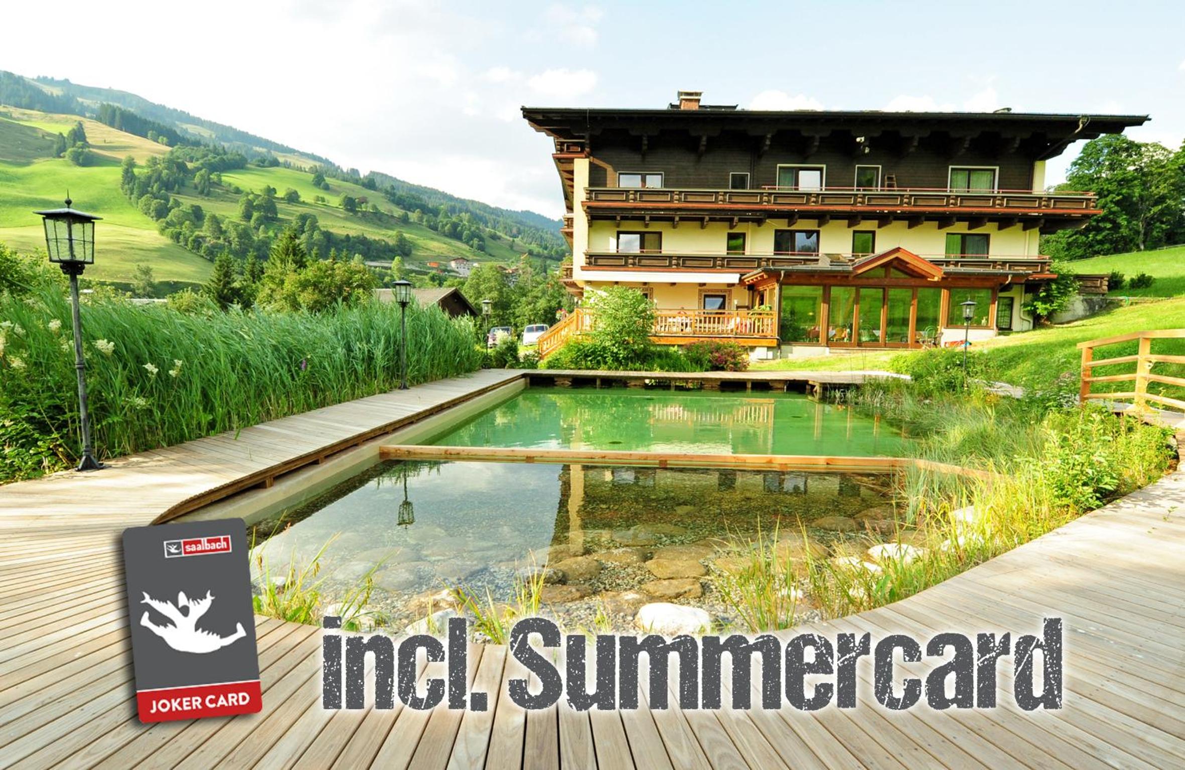 Summer Fun & Amenities: In the summer, guests can enjoy a natural swimming pond, bike garage, and themed dinners. Explore the surrounding area with ease using the nearby ski bus to Saalbach ski area.