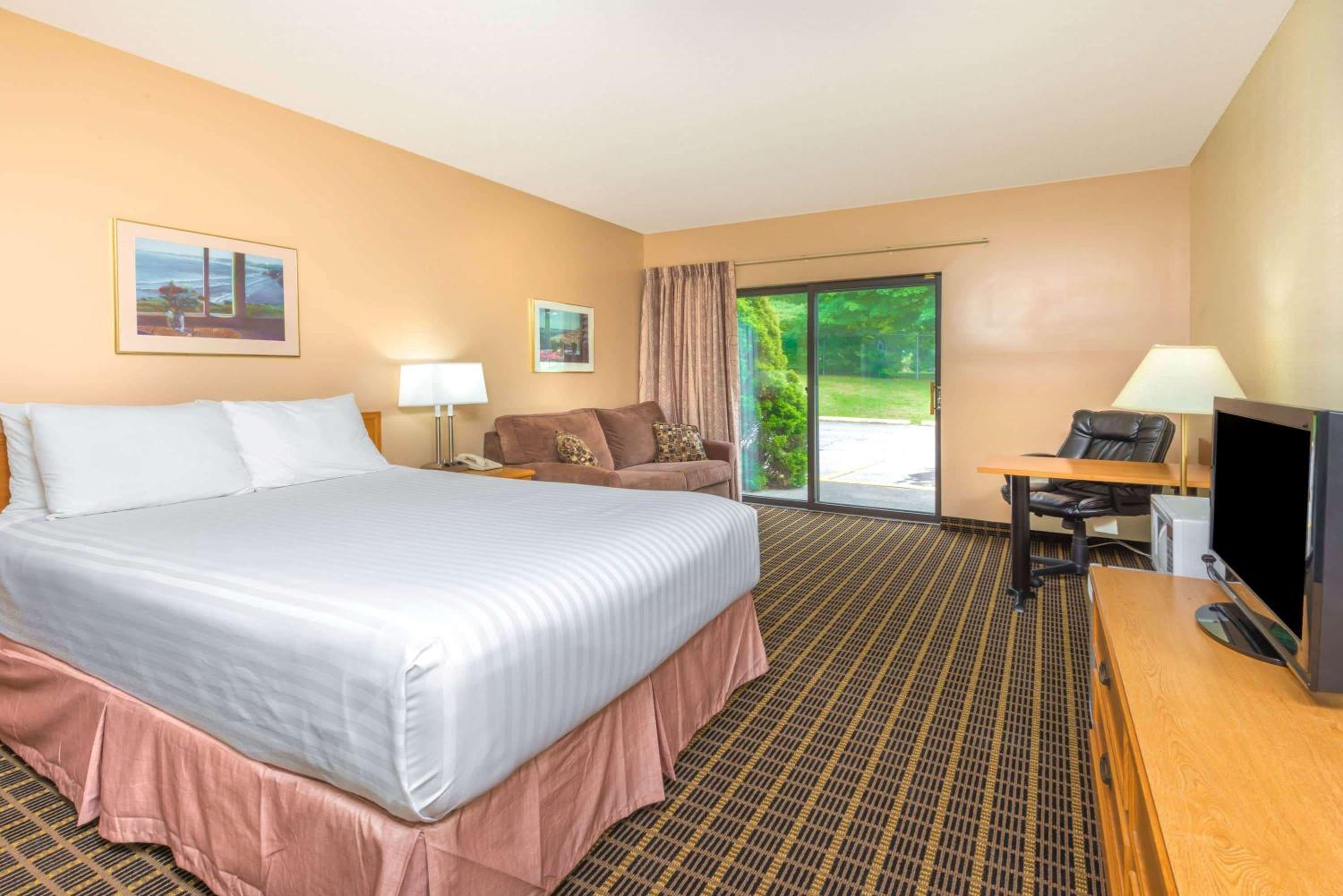 Cozy Rooms: Enjoy the convenience of microwaves and refrigerators in every room, along with tasteful decor featuring light wood furnishings and floral bedding. Large windows and complimentary Wi-Fi add to the comfort of your stay.
