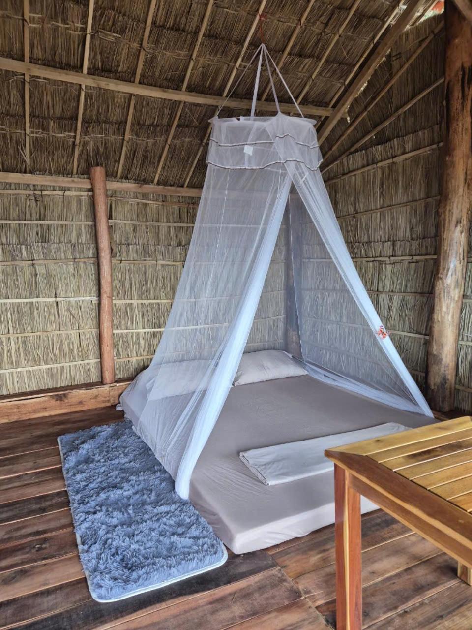 Wij wisten dat het basic zou zijn, maar bij aankomst bleek de hut op het strand een open strook te hebben boven het raam, waar de insecten zo naar binnen konden vliegen en het 'bed' was een matras op de grond met een klamboe.