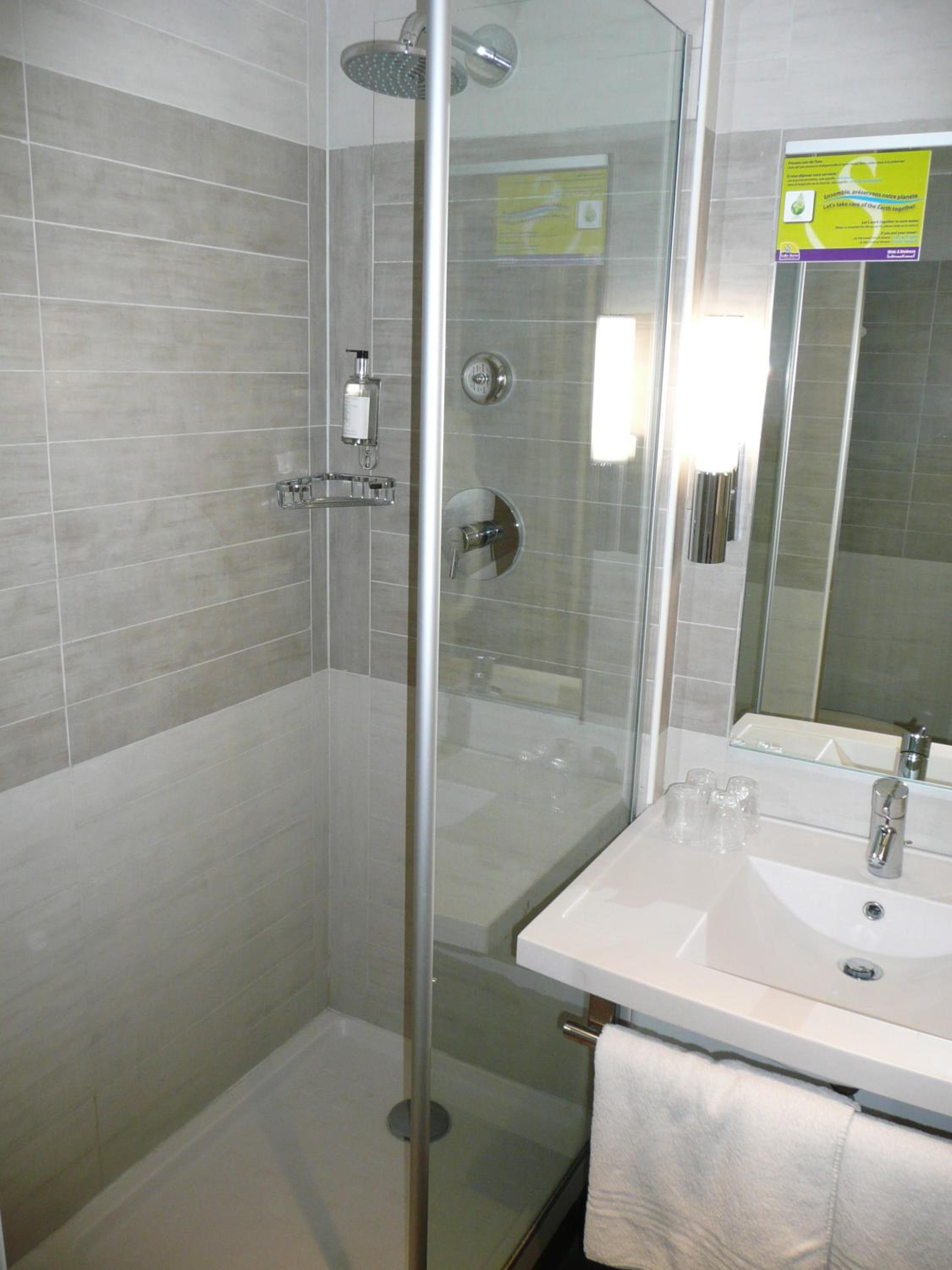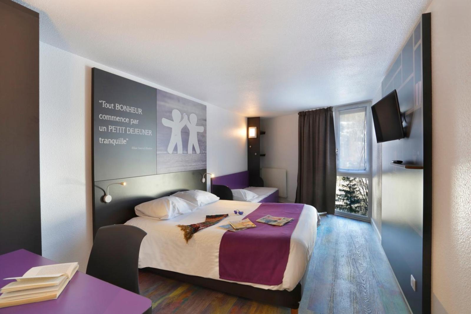 Surface de la chambre suffisante pour un weekend, bon petit déjeuner , parking gratuit devant et commerces à proximité