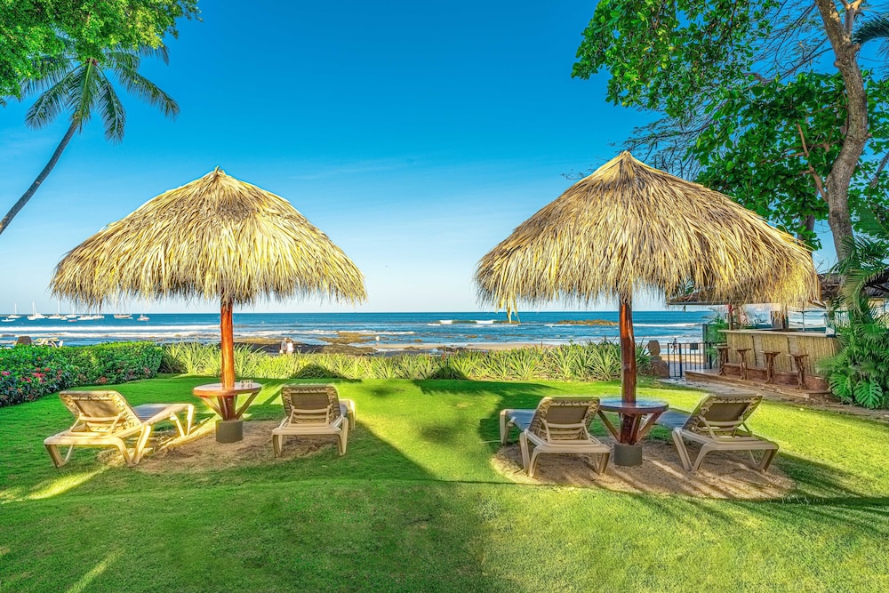 There is a refreshing pool as well as beach chairs on a grassy terrain in front of the ocean with a beach bar!