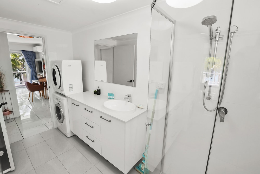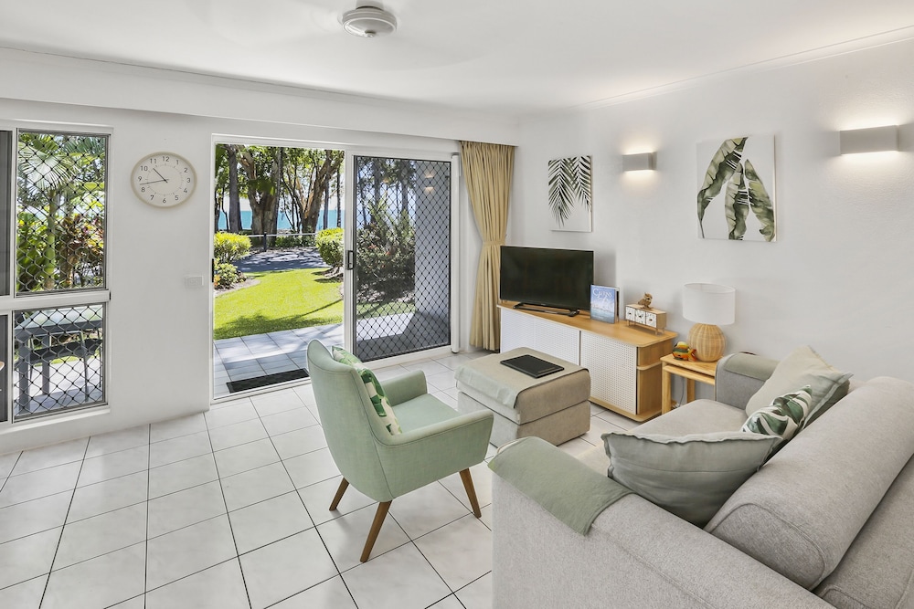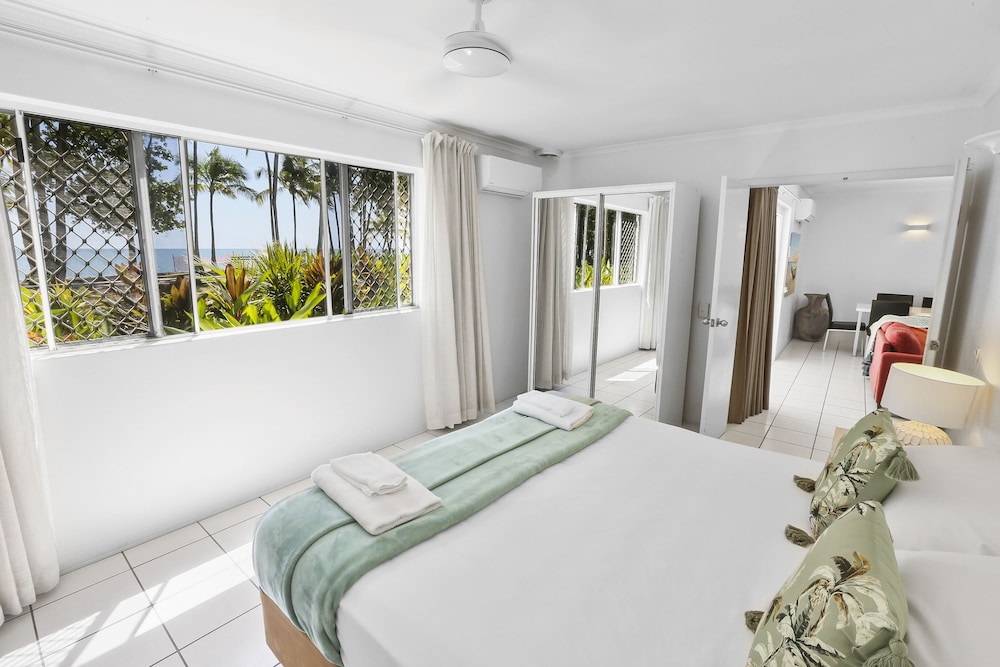 Amazing view of beach from balcony, clean and modern apartment with kitchen, comfy bed, lovely warm pool, fantastic walking track to Palm Cove at beach, quiet area. Unfortunately the local restaurant closed a few days before we arrived as all other restaurants are a drive away. One small improvement would be the shower water pressure andhot water running out quite fast. Everything else was fantastic!!
