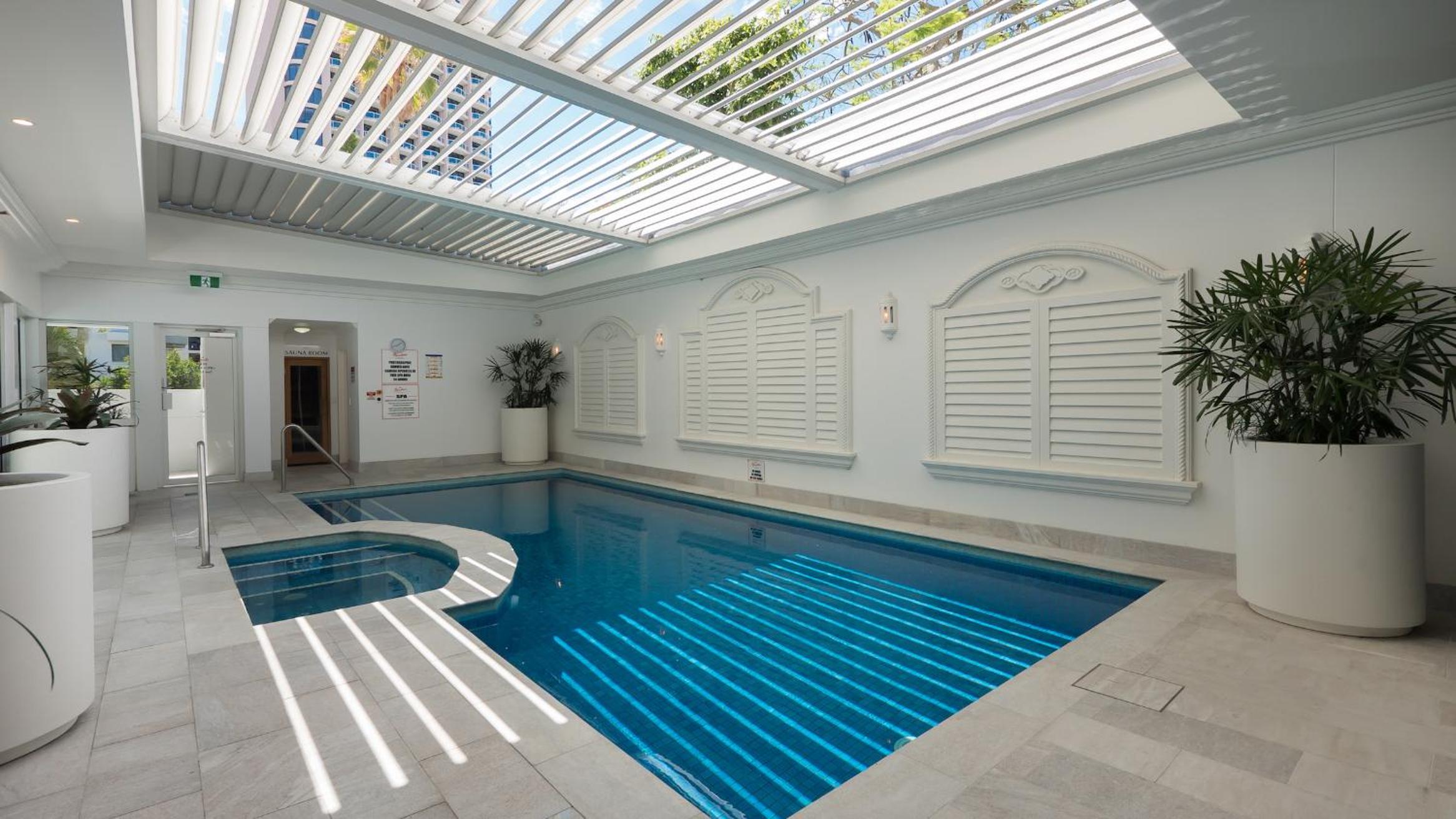 Indulge in the array of facilities available at Marrakesh Apartments, including both heated indoor and outdoor pools, a fitness centre, sauna, and inviting poolside BBQ area. For breathtaking panoramic views, head up to the rooftop BBQ and entertainment area, offering a stunning vista of the hinterland and coast.