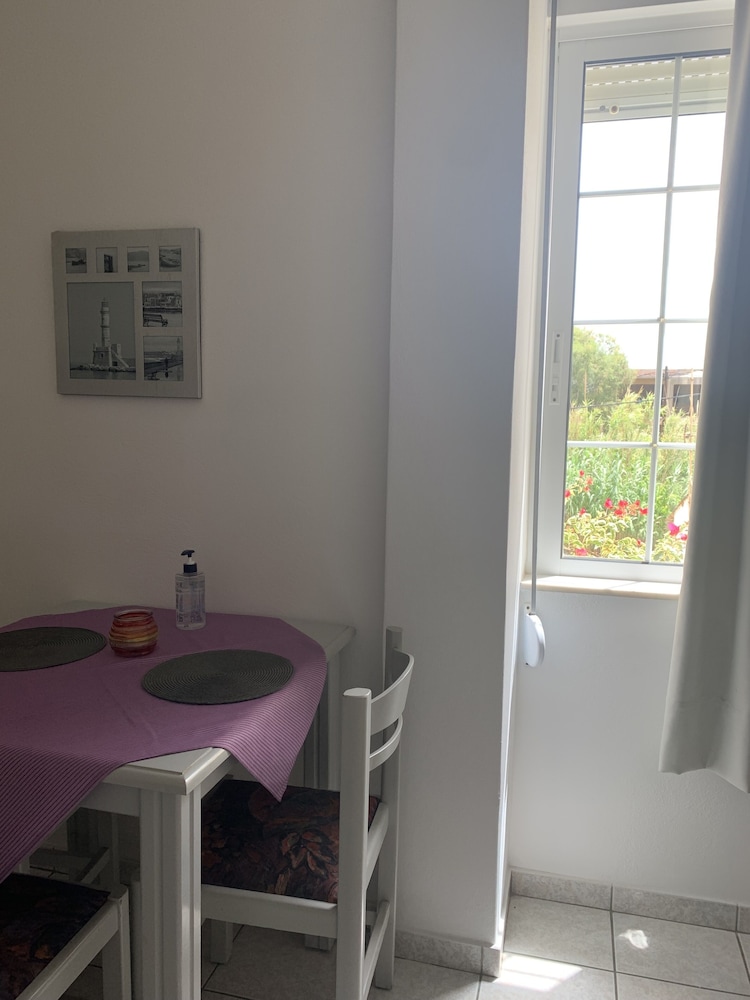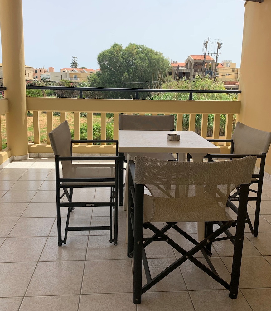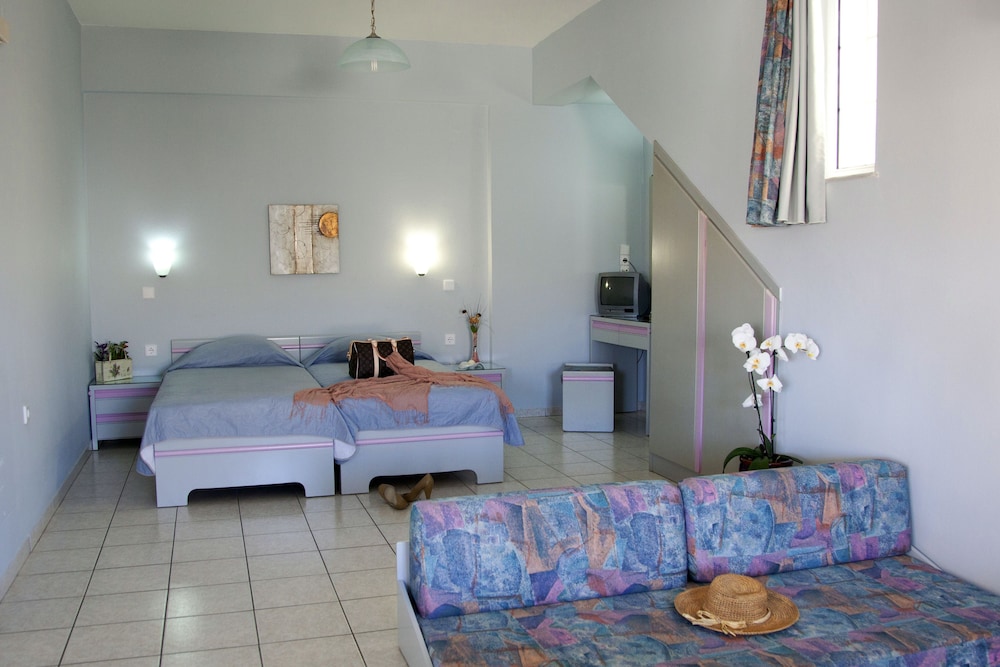 This is a charming family-run hotel right on the beach in Agia Marina/Platanias. The area is very touristy, but the hotel is quiet and very clean with "rooms" that are more like apartments! The kitchenette is very well equipped with all you need for cooking, and also to make tea or coffee. There are several small supermarkets within walking distance, as well as restaurants and cafés for all budgets. Buses run frequently on the main road if you wish to explore areas further away from the hotel. It's a nice place to stay. The people running the hotel are very friendly, and also the other guests. I very much enjoyed my stay there and highly recommend this hotel.