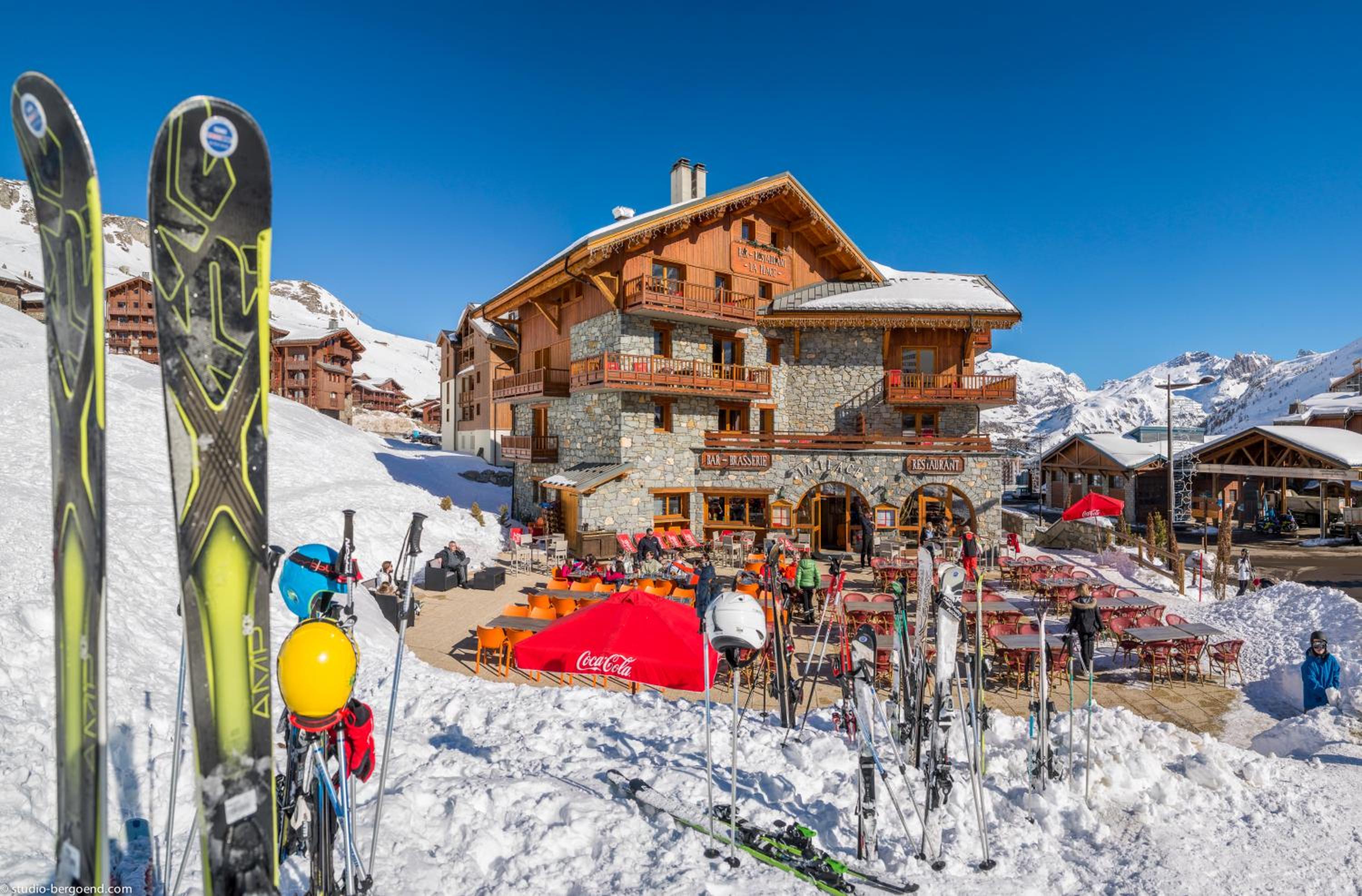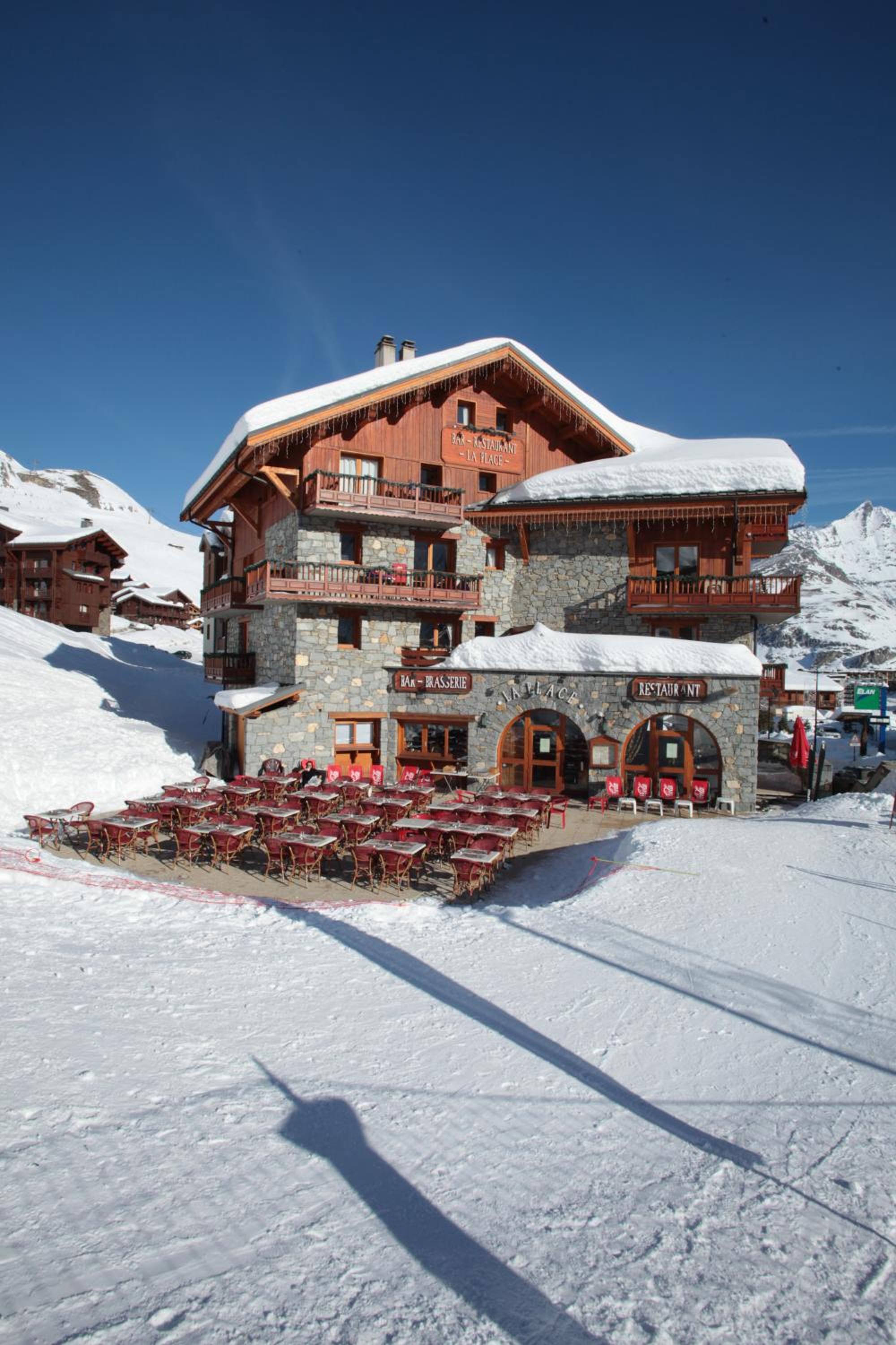 We stayed in one of the apartments attached to the hotel . Was ski in/out . we had an apartment on the top floor of the building so the view was amazing . It was quiet at night as it is not in the centre of the town . The apartment is basic and really needs a bit of up grading but all the other advantages of it out weighed the tiredness of the decor .