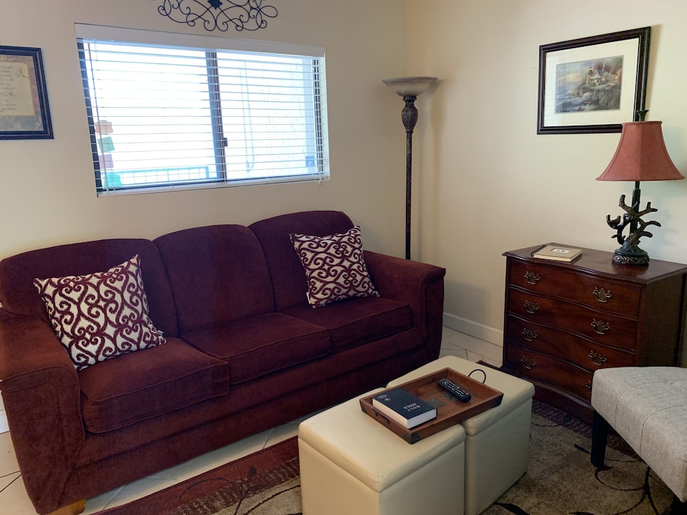 The location was perfect! The area was quiet off the main road and felt safe. The unit was okay...size was adequate but the lock on the door felt flimsy and the sliding door to the patio didn't lock. We like the keyless entry. The furniture was old and stained. We liked the fridge size and provided dishes were mismatched but fine. Mattress was firm but comfortable. Overall it was adequate but needs deep clean with updated furniture. Parking onsite also nice and it is covered but be aware you are only guaranteed 1 spot. For the price and location alone, overall we would recommend.