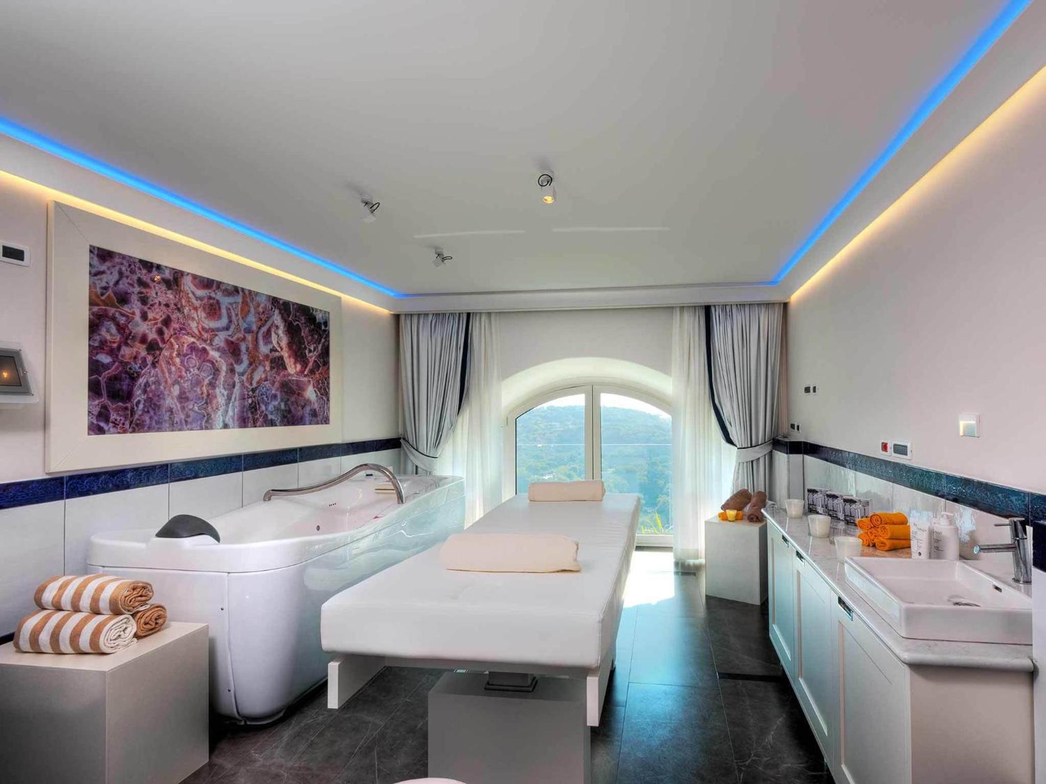 Unwind in the natural sauna, 11 outdoor thermal pools, indoor pool, or one of the 5 hot tubs overlooking San Montano bay. Take advantage of the wellness center, gyms, and garden. For beach lovers, a free shuttle service to San Montano beach is available, complete with complimentary beach amenities.