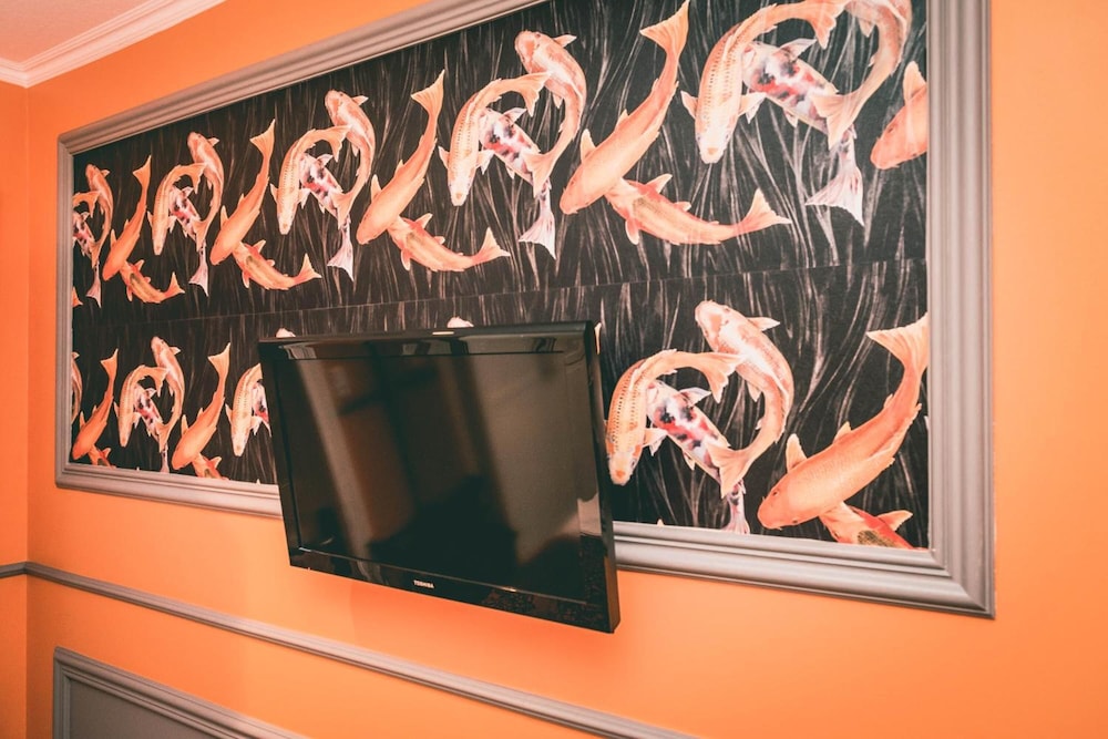 Hotel carpet needs replacement and the ripped up throw pillows should be thrown away. The rooms were decorated with fun themes.