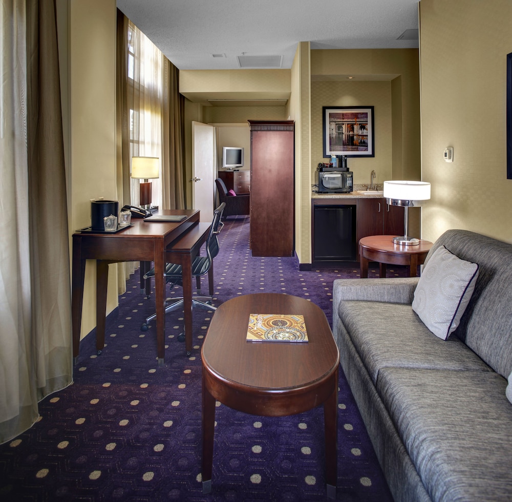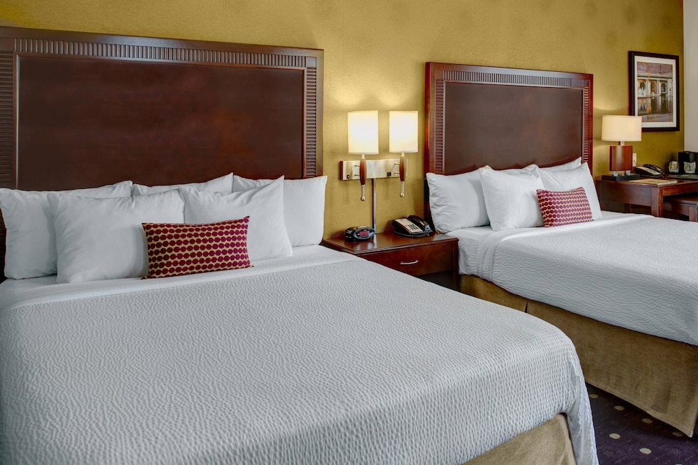 Old historic hotel Marriott is fixing up; but still needs work. Room was a great size - executive suite. Couch and chair sagged. Only 1 bed had a bed skirt on it which looked dumpy. Elevators fast. Bar in lobby !! Pillows were good. Great location to Kaufman stadium.