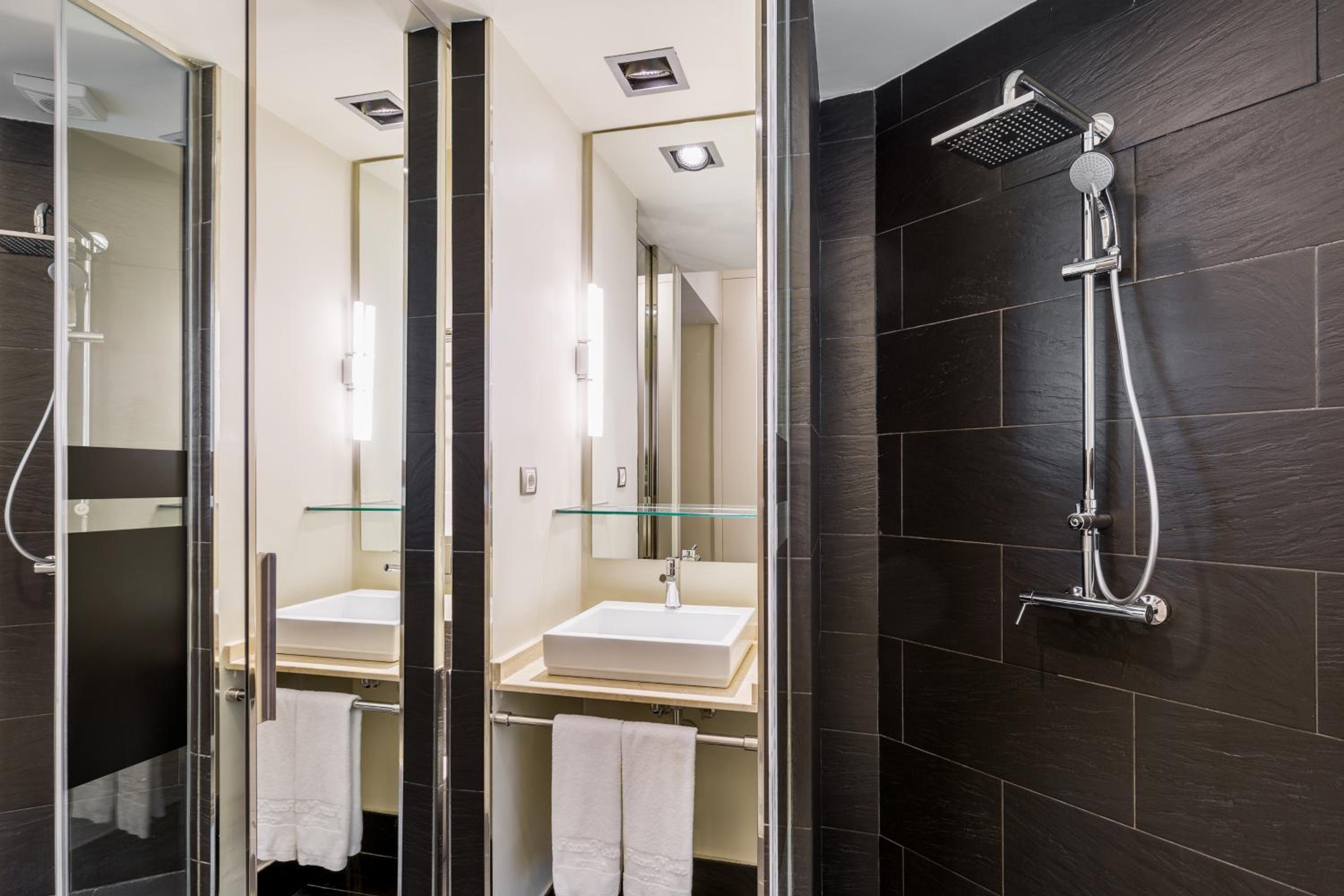 L’hôtel est vraiment bien situé, gros point positif. Tout était propre et plutôt bien insonorisé (bruit et lumière), même si un peu de lumière passe quand même par la salle de bain.