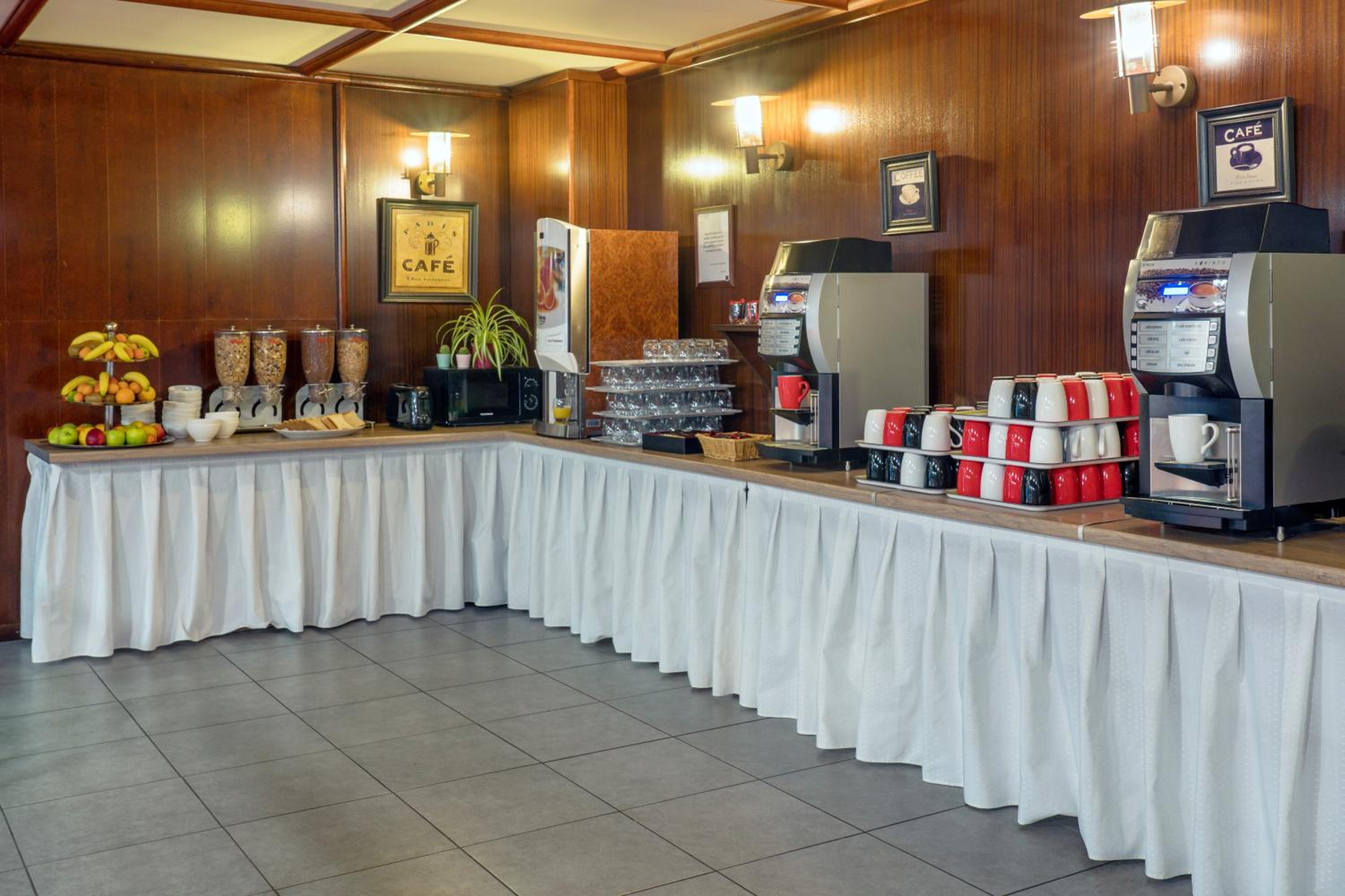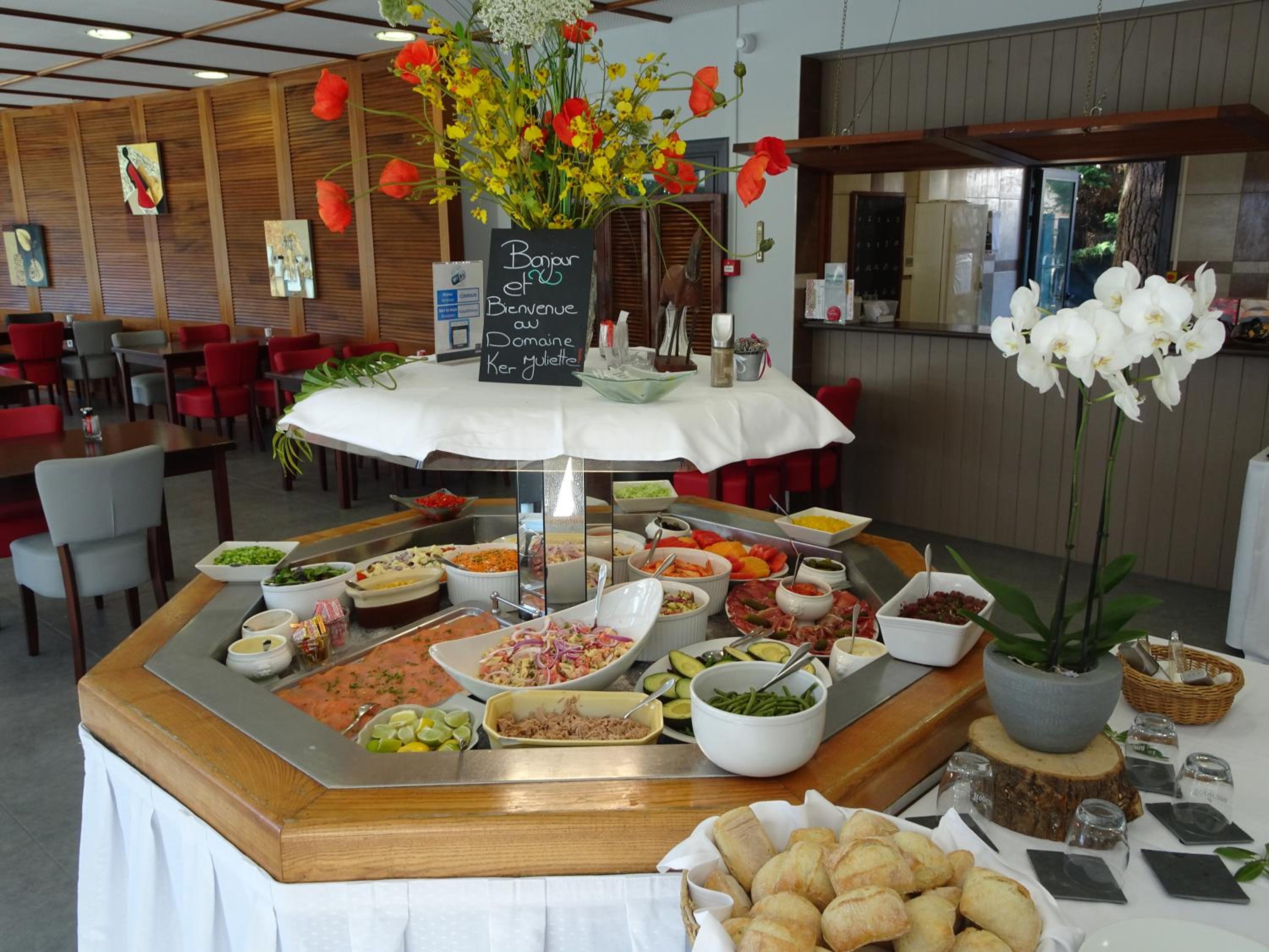 Petit déjeuner buffet très copieux, boissons, œufs brouillés remarquables, charcuterie et fromages divers, pain, viennoiseries et fruits, sans oublier la salade de fruits, compote, boissons diverses chaudes et froides…