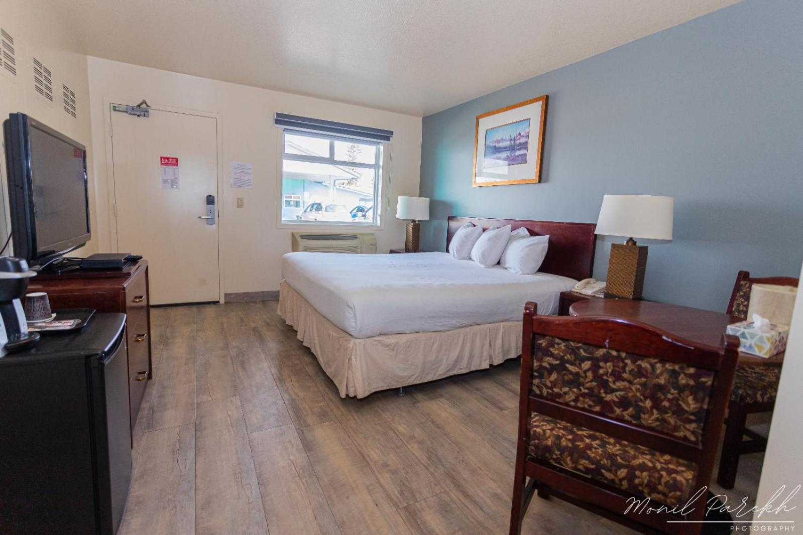 Experience the cozy dark wood-furnished rooms equipped with modern amenities like cable TV, microwave, and refrigerator, ensuring a relaxing stay.