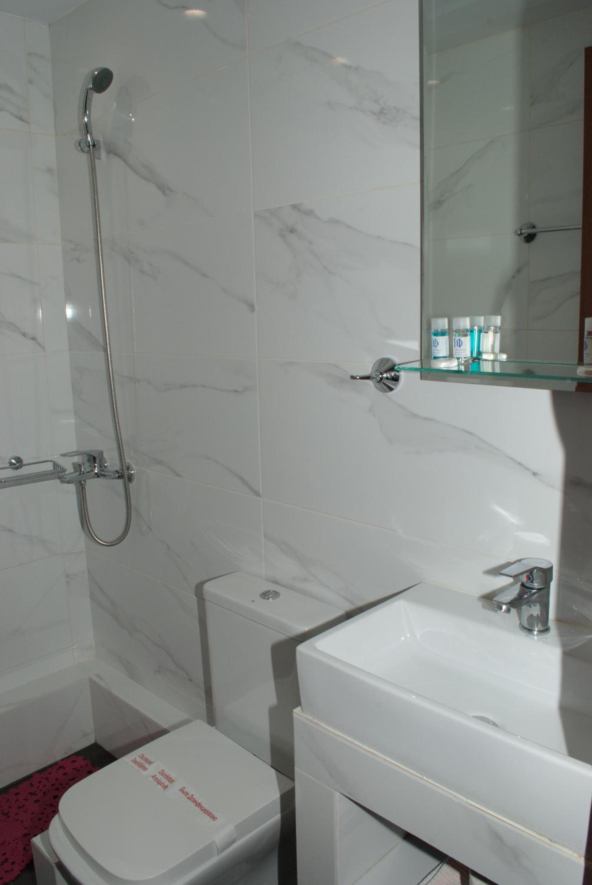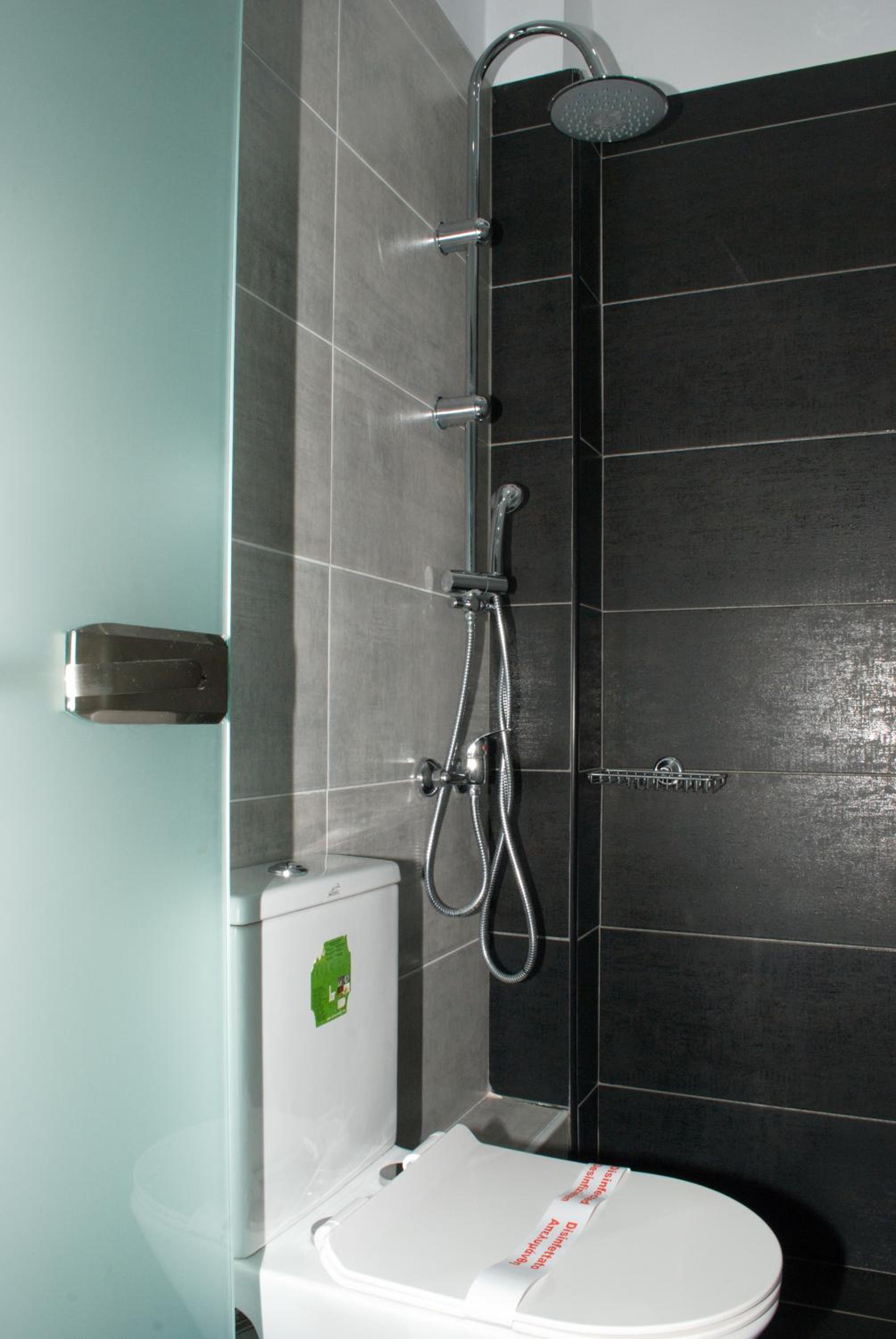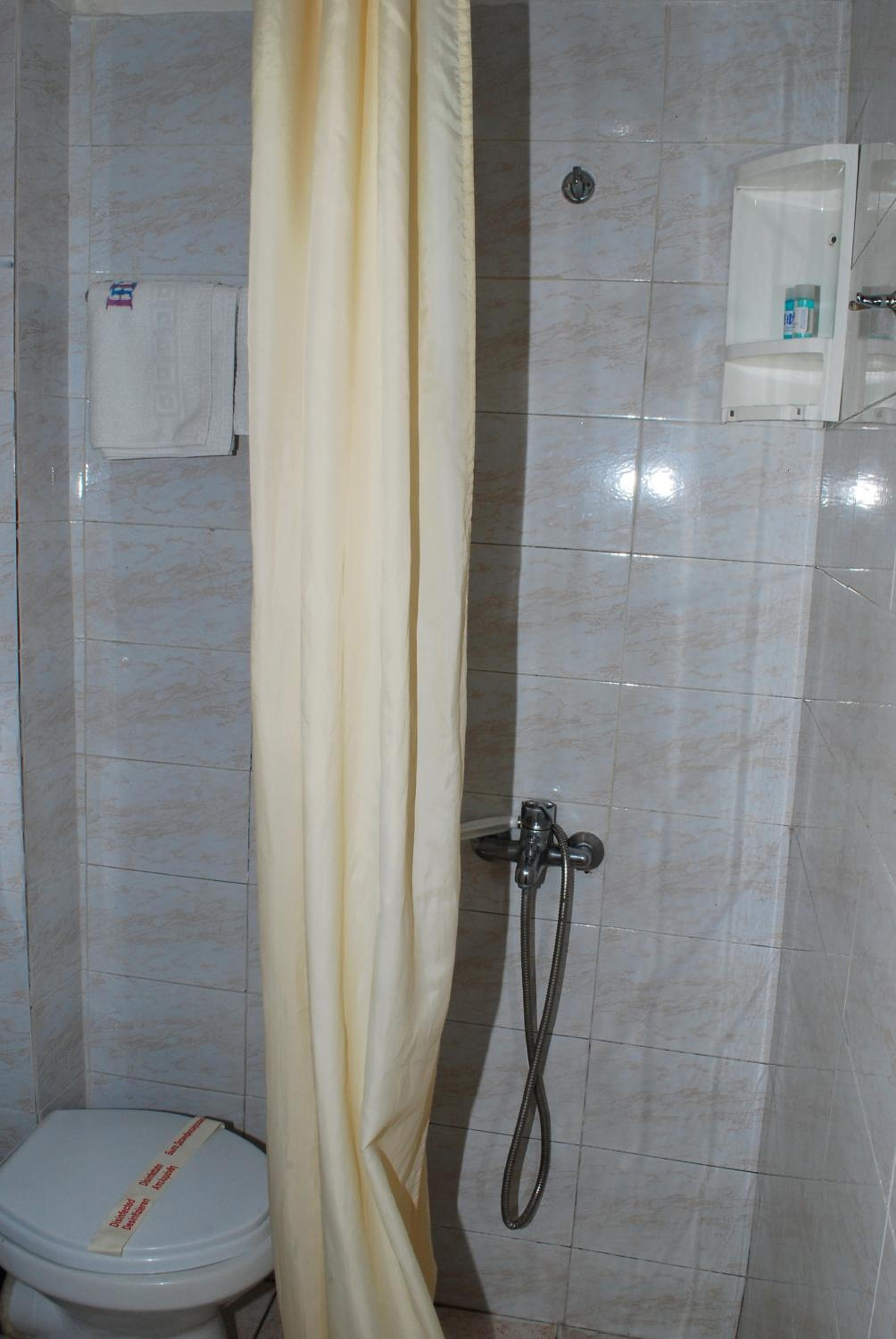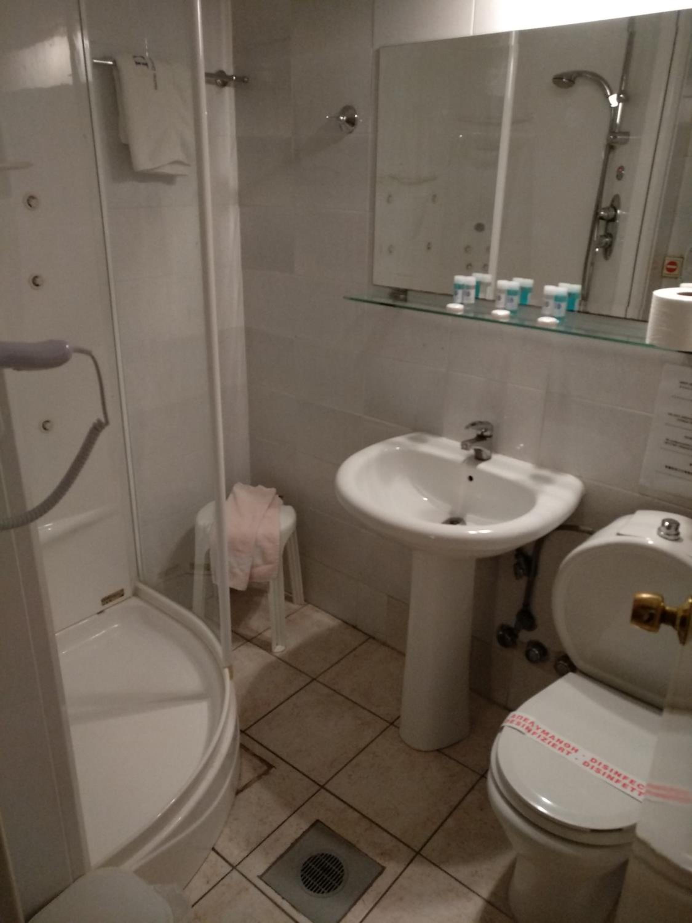 Wc:n var mycket liten, så man måste lägga fötterna i duschen då man satt på toaletten. Det fanns alltså inget utrymme mellan wc-stolen och duschens draperi. Luftkonditioneringen var mycket dålig.