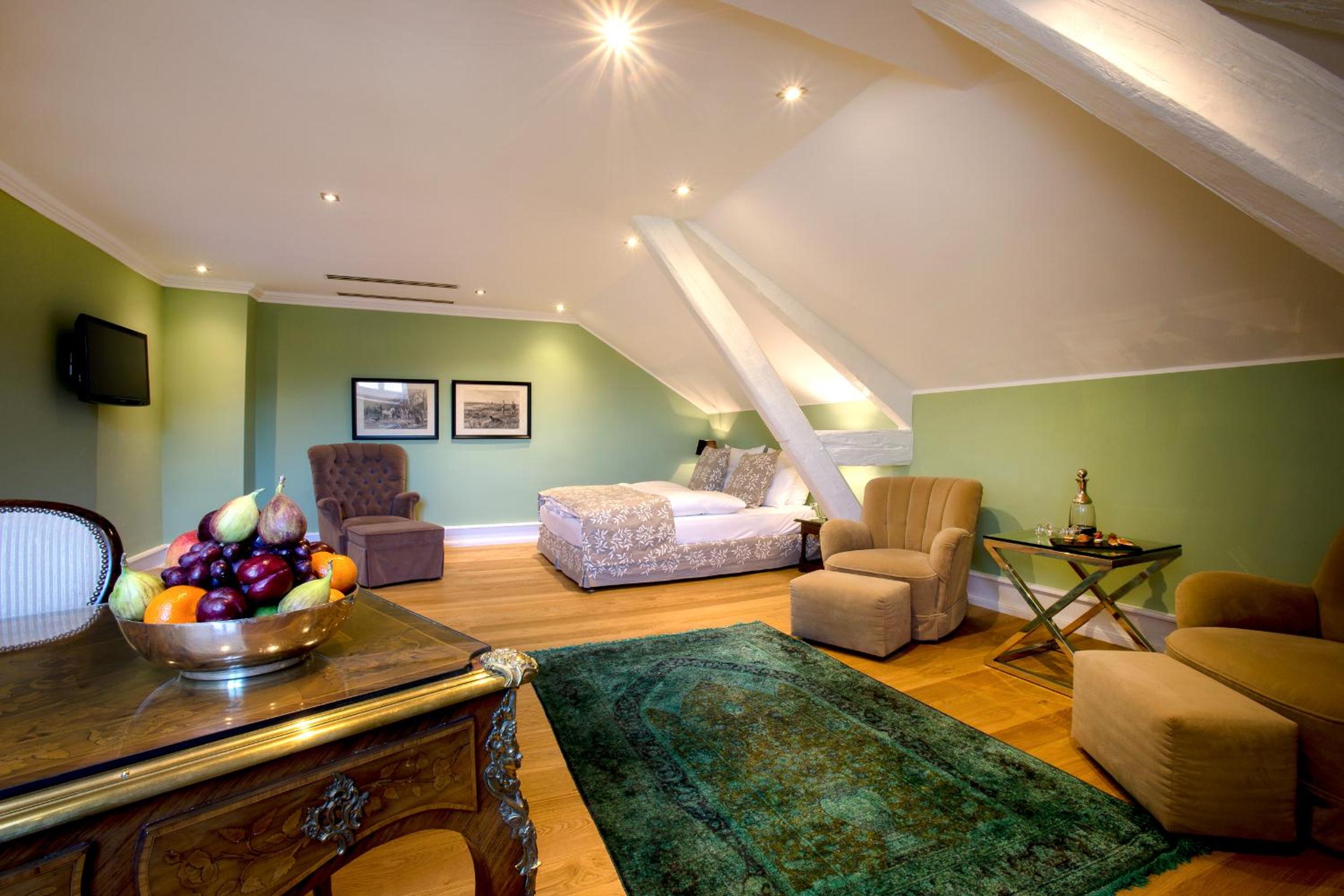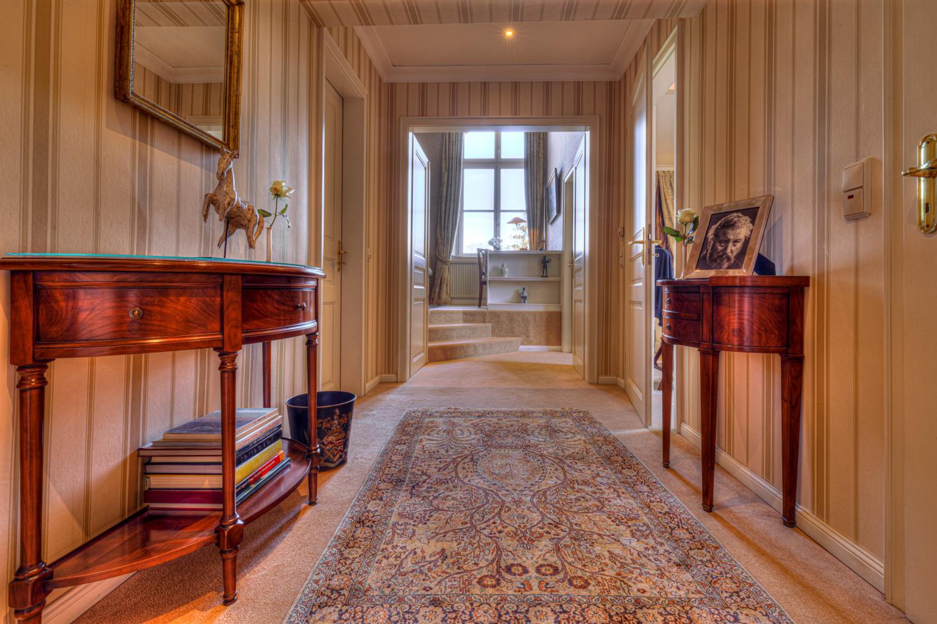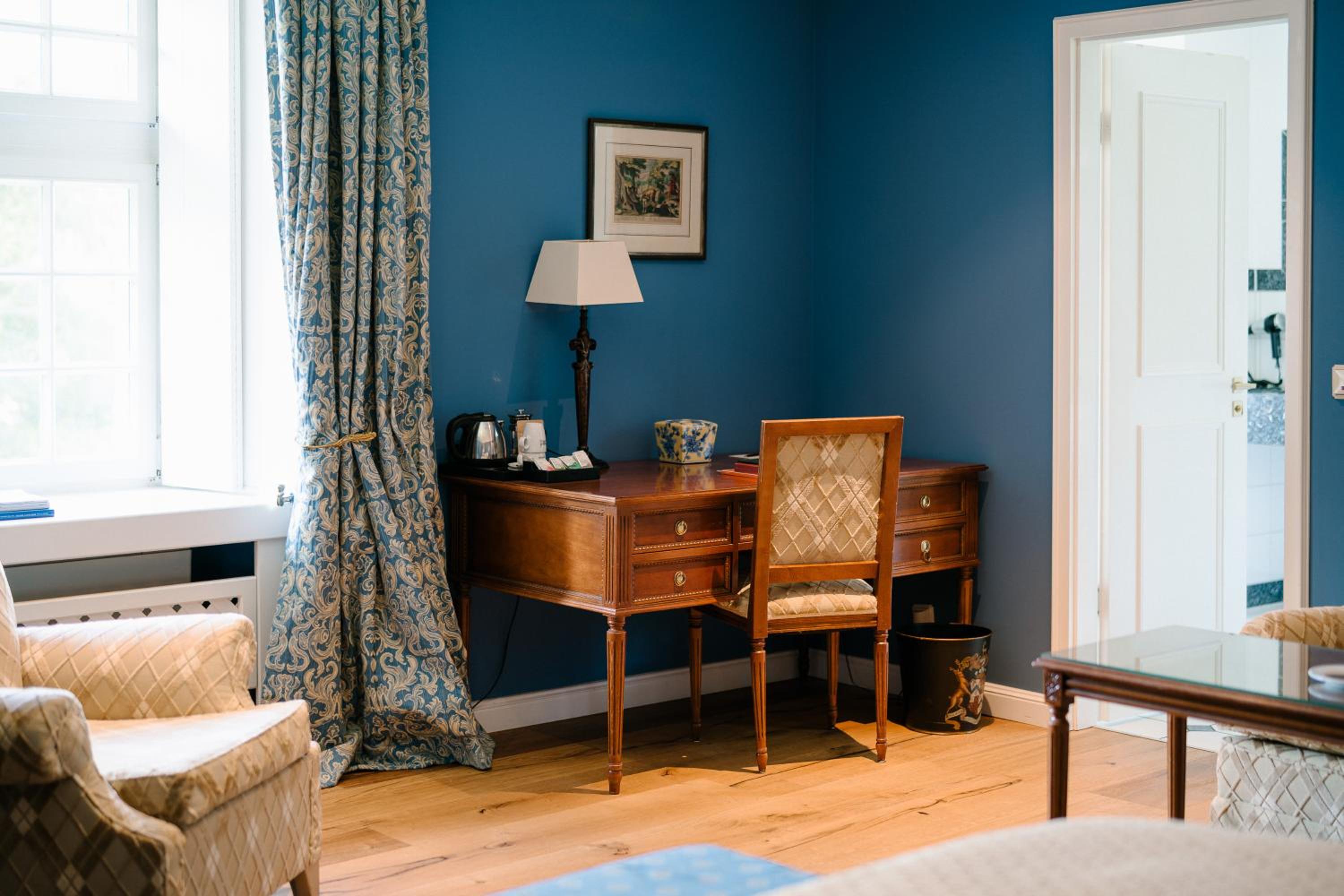 The decor is an acquired taste- plenty of beautiful antiques in the main part of the castle but room was furnished in a very 90s baby blue/dark brown, white tones with modern stripy or spotty soft furnishings (armchair, bed cushions, blind). I was hoping for country side grand home furnishings but stayed in modern-could be anywhere-room. Everything was however spotless and very comfortable.